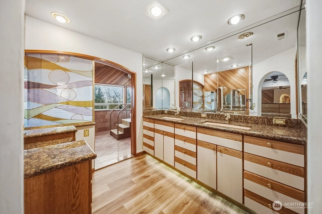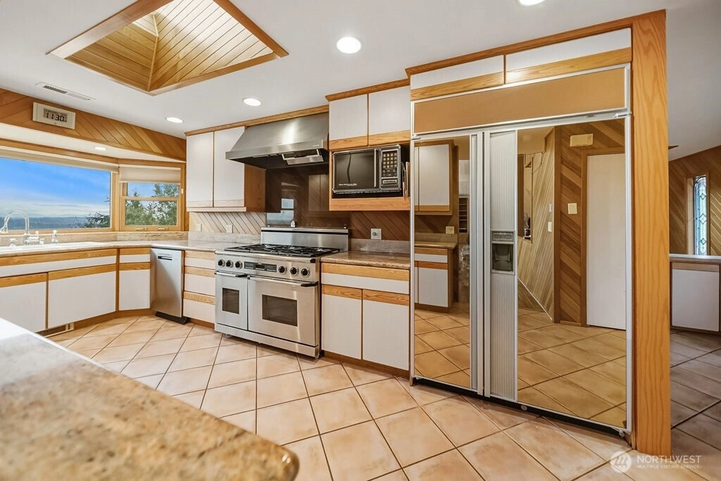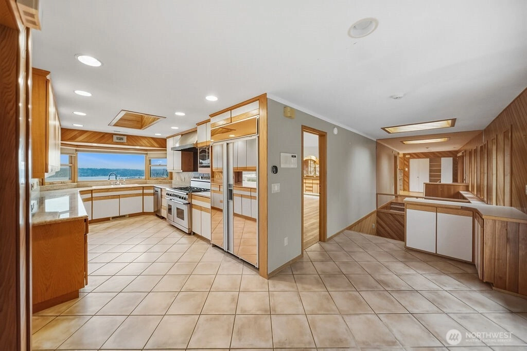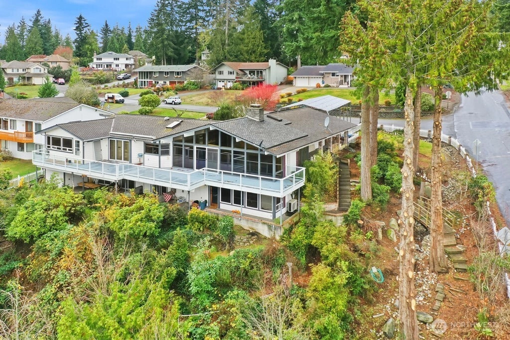 MILLION DOLAR VIEW! Incredible water, Cascade, & Rainier views from most rooms, and wraparound view deck. Four bedroom (county records) with three, 3/4 bathrooms. Too much to list, but includes floor to ceiling windows in living room, double sided fireplace, heated floors on the main level, office area, gourmet kitchen w/commercial range & sub zero fridge. Primary suite includes huge closet, dream bath has double shower, indoor Jacuzzi & huge sauna and heated trowel rack. Large family room with brick fireplace & party sized wet bar. Beautiful yard. Heated garage with a custom tile floor. Try to find the three secret hiding places! Workshop lower level. This is a great house ready for a refresh to maximize a long term investment.