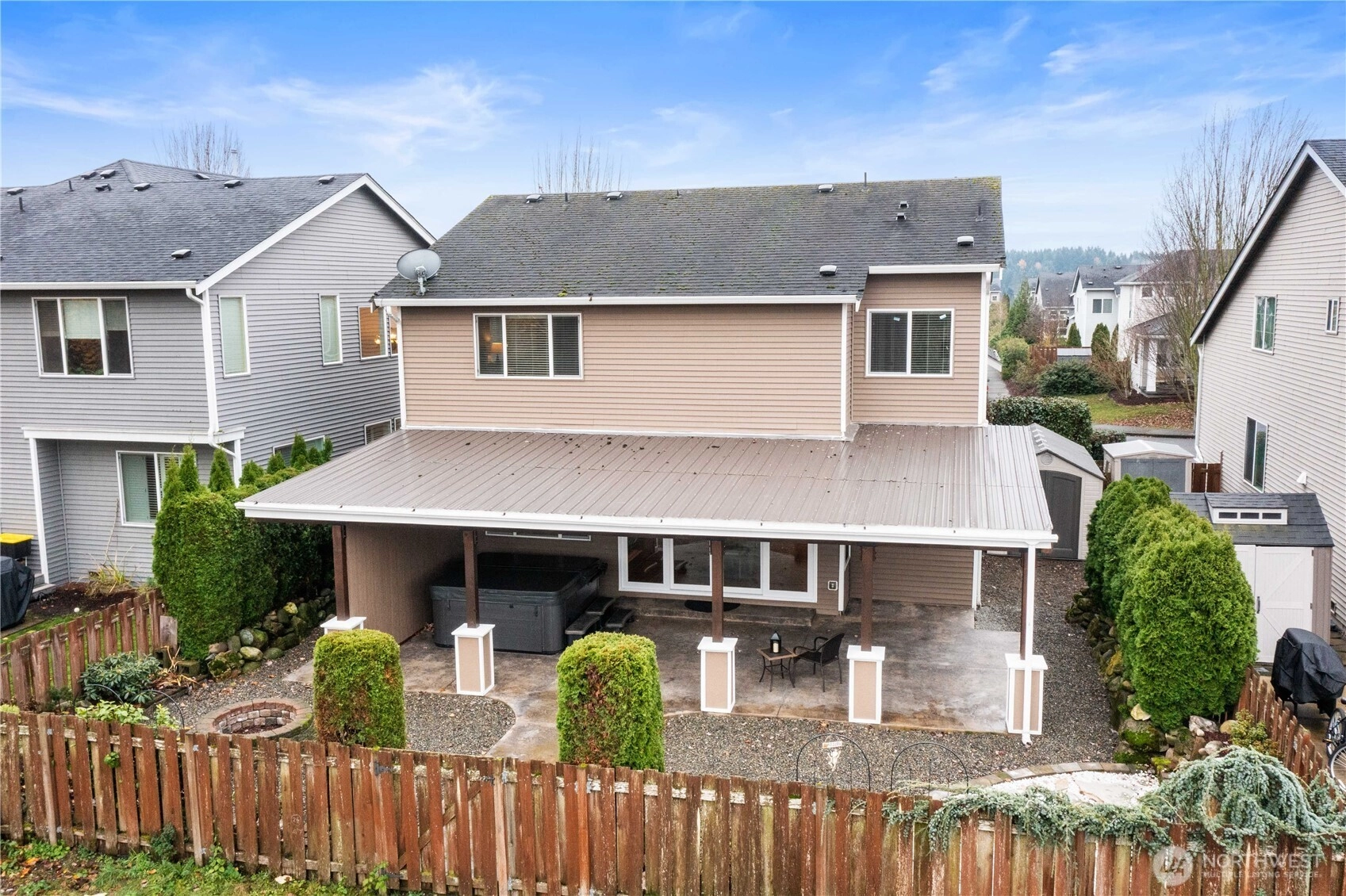 Move-in-ready home with top-shelf upgrades throughout. Covered porch welcomes you to a bright foyer, expands into the living room, featuring a vaulted ceiling with dormer windows. Designated dining room with wood coffered ceilings and a chandelier. The great room boasts a large kitchen with an island, an open dining space, and additional living space with a gas fireplace. A modern half bathroom and laundry room round out the first floor. Upstairs, you'll find an oversized primary suite with skillion ceilings, a walk-in closet, and a five-piece bathroom with a soaking tub. Two additional bedrooms and a bathroom down the hall. Do not miss this private backyard oasis, featuring a large covered patio, jacuzzi, and fire pit.