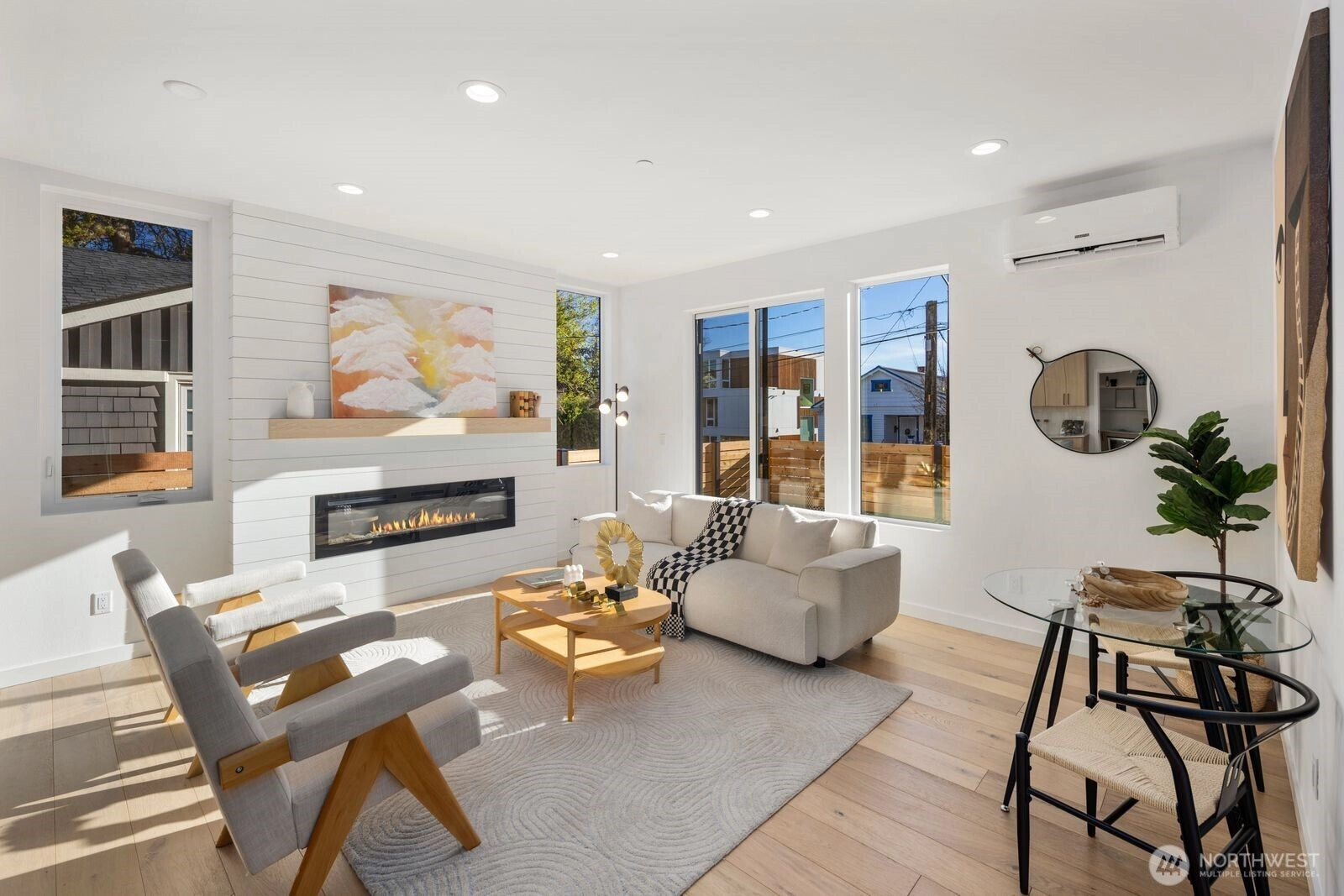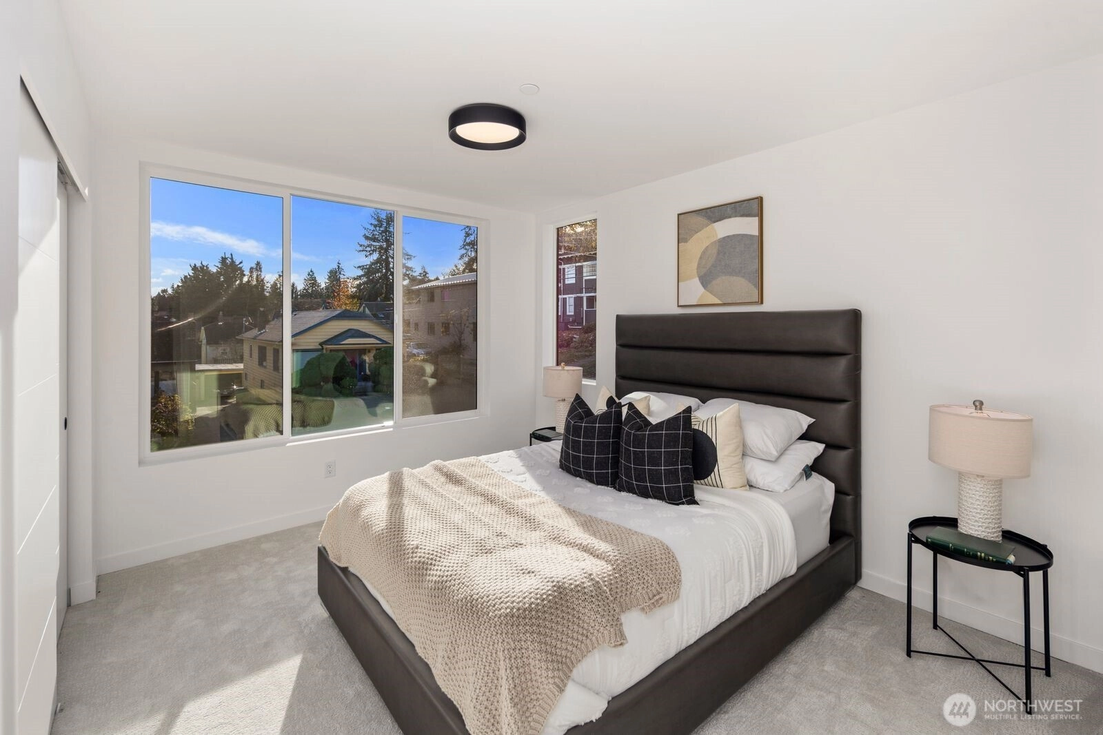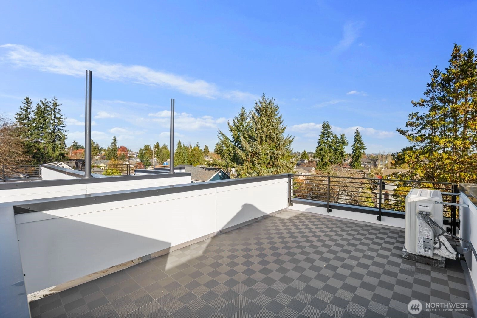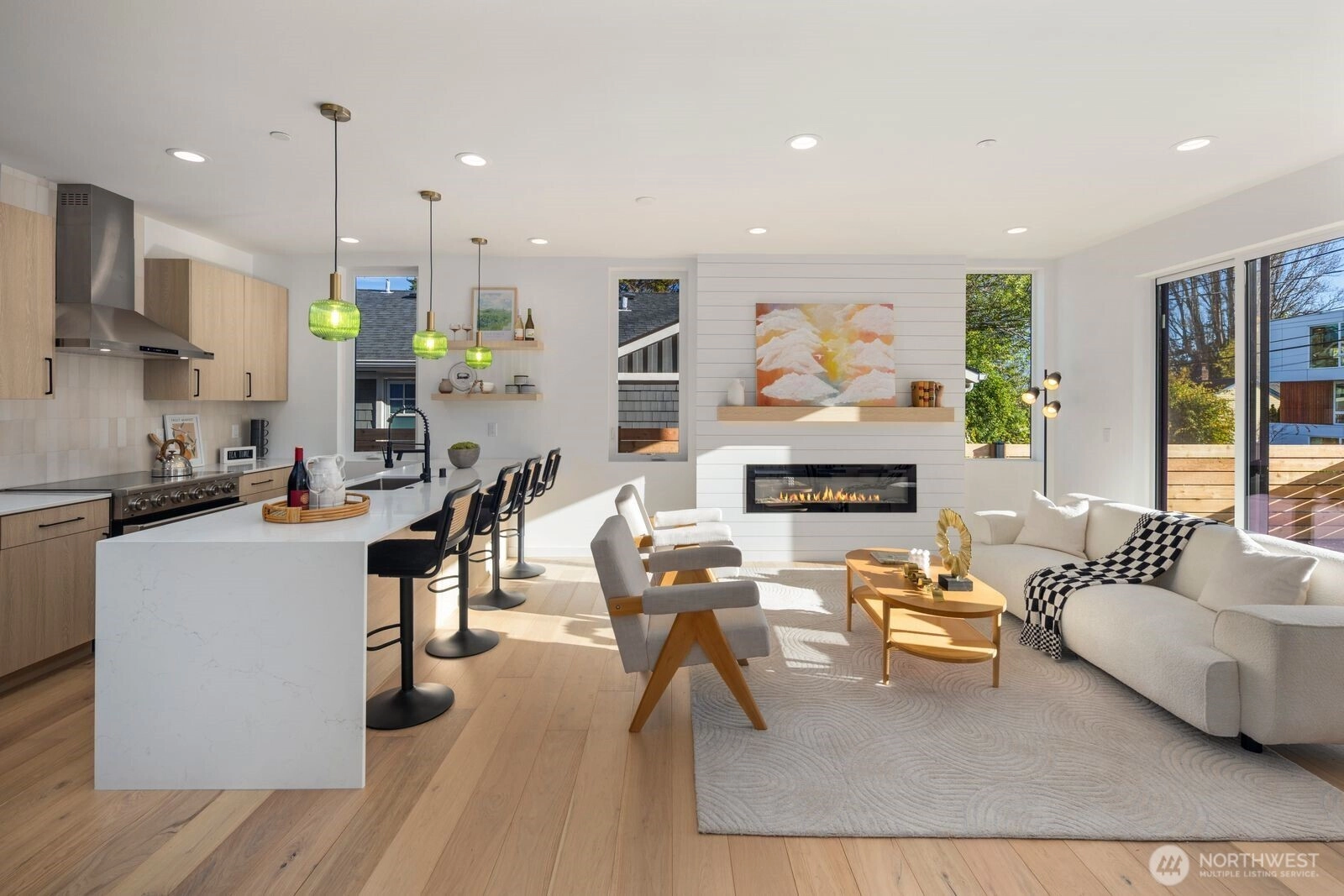 Uniquely tailored for the lifestyle centered around Green Lake and Phinney Ridge, this home offers a gracious floorplan with four bedrooms and elevated design throughout. The centerpiece kitchen features a walk-in pantry, coffee bar, additional beverage storage and more. The primary suite glows with southwest light and includes a deluxe en-suite bath with a walk-in shower, and heated floors. Three additional upper-level bedrooms are complemented by a full detailed bath and an upper-level laundry with a prep sink. Ascend to the rooftop deck for sweeping territorial vistas and a stunning view of Mount Rainier. Off-street parking is EV-ready. Just a short walk to the Green Lake loop, Woodland Park, Phinney Ridge shops, and more.