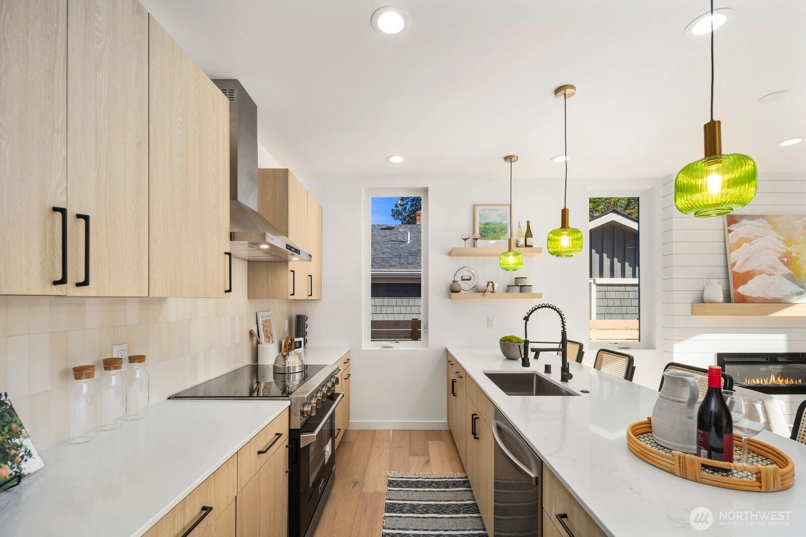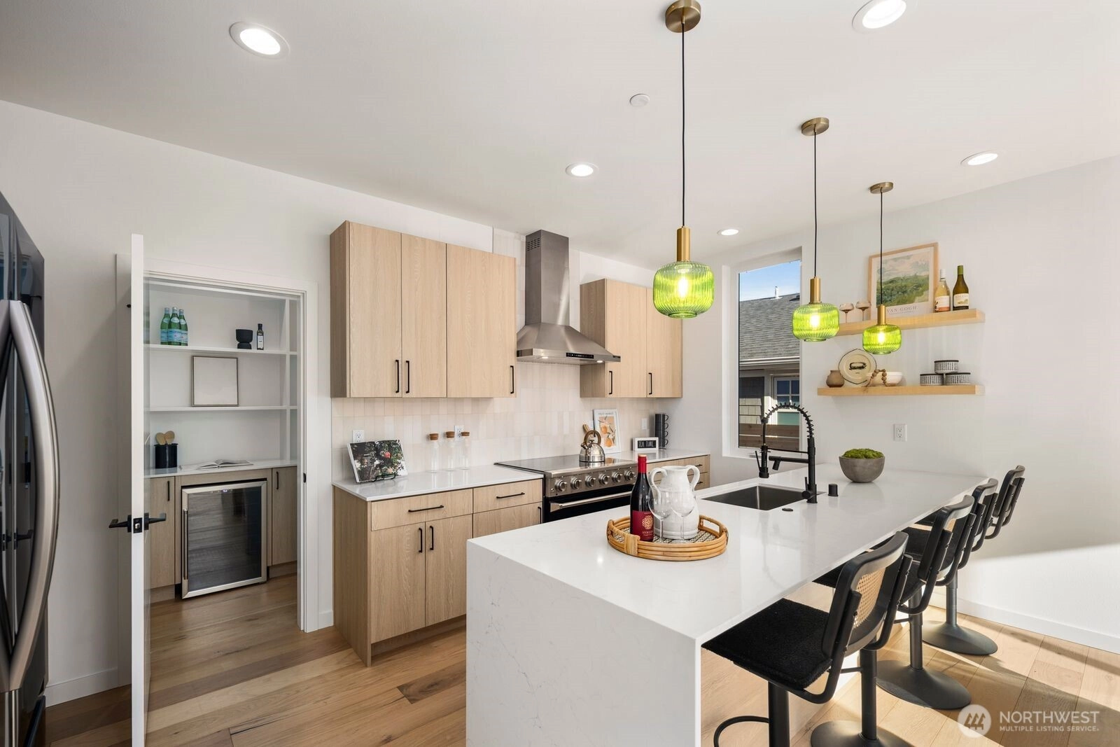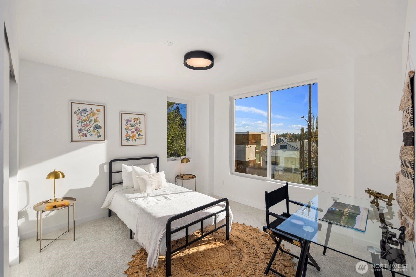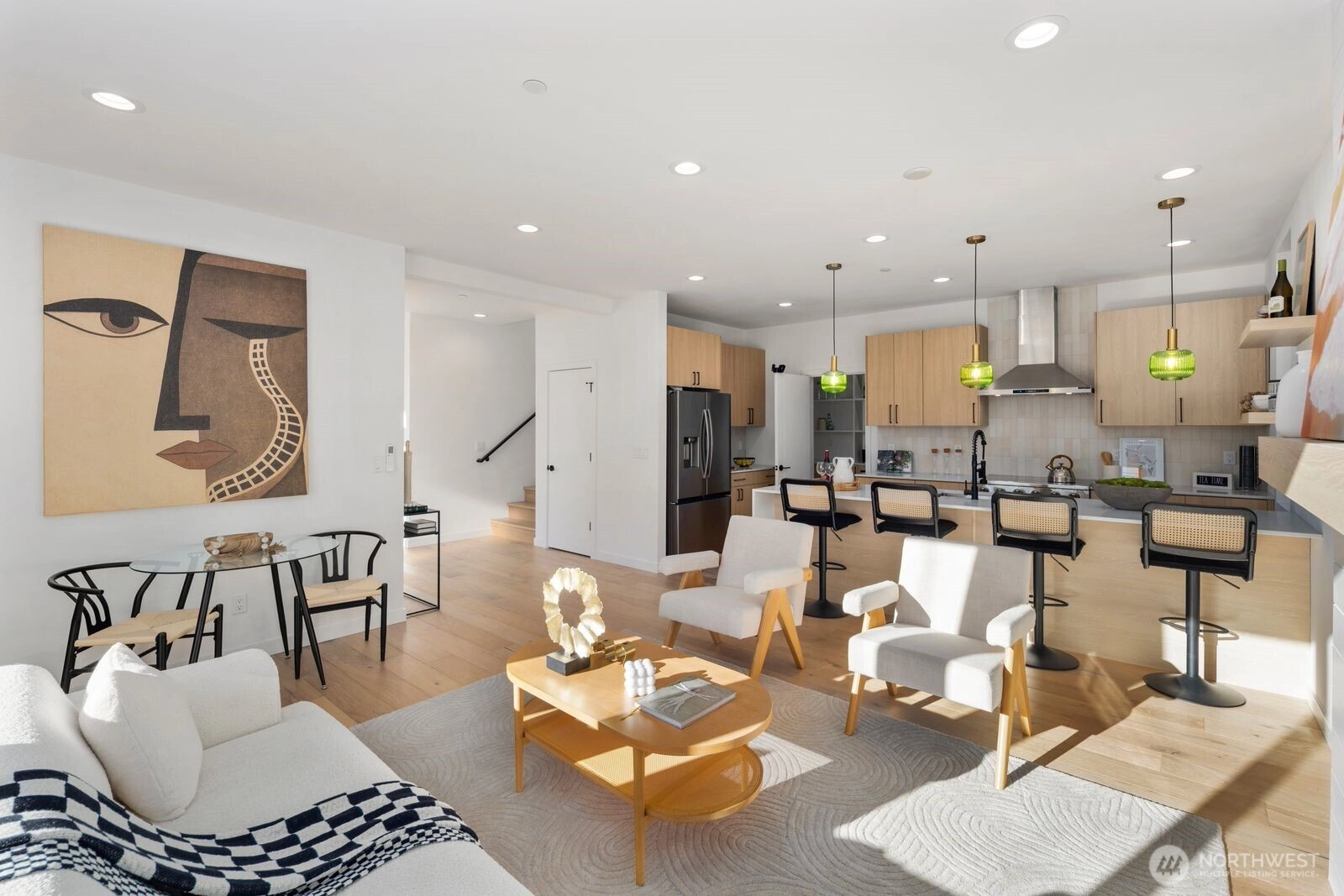 Uniquely tailored for the lifestyle centered around Green Lake and Phinney Ridge, this home offers a gracious floorplan with four bedrooms and elevated design throughout. The centerpiece kitchen features a walk-in pantry, coffee bar, additional beverage storage and more. The primary suite glows with southwest light and includes a deluxe en-suite bath with a walk-in shower, and heated floors. Three additional upper-level bedrooms are complemented by a full detailed bath and an upper-level laundry with a prep sink. Ascend to the rooftop deck for sweeping territorial vistas and a stunning view of Mount Rainier. Off-street parking is EV-ready. Just a short walk to the Green Lake loop, Woodland Park, Phinney Ridge shops, and more.