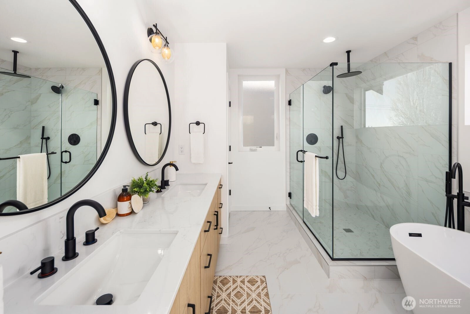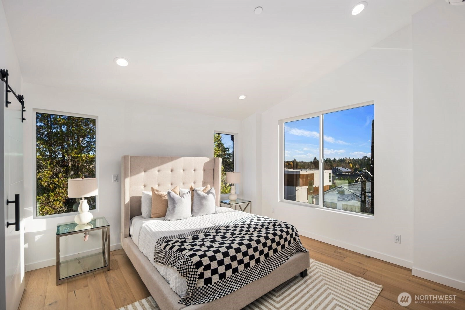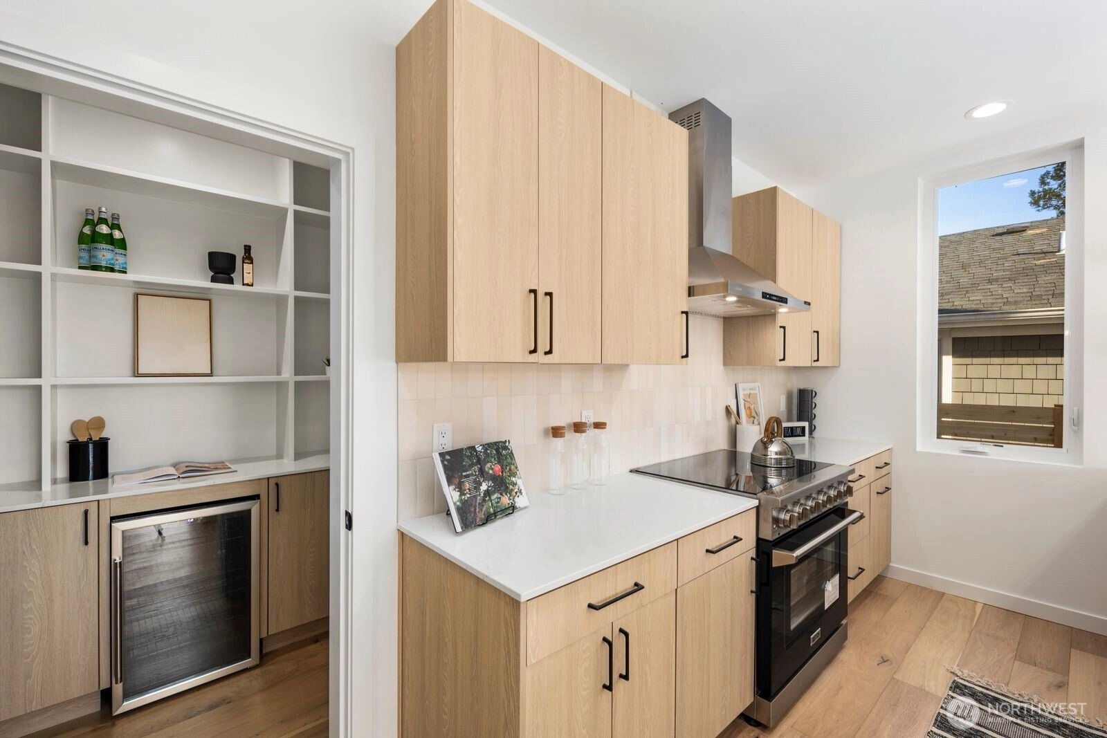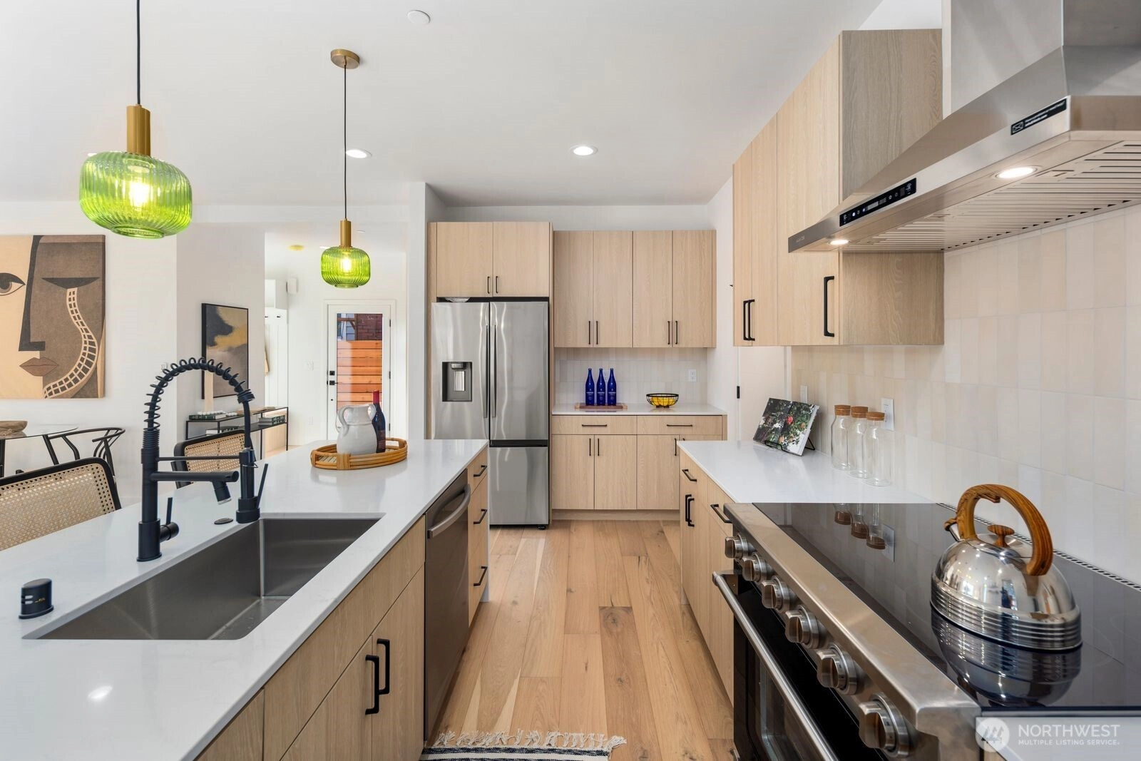 Uniquely tailored for the lifestyle centered around Green Lake and Phinney Ridge, this home offers a gracious floorplan with four bedrooms and elevated design throughout. The centerpiece kitchen features a walk-in pantry, coffee bar, additional beverage storage and more. The primary suite glows with southwest light and includes a deluxe en-suite bath with a walk-in shower, and heated floors. Three additional upper-level bedrooms are complemented by a full detailed bath and an upper-level laundry with a prep sink. Ascend to the rooftop deck for sweeping territorial vistas and a stunning view of Mount Rainier. Off-street parking is EV-ready. Just a short walk to the Green Lake loop, Woodland Park, Phinney Ridge shops, and more.