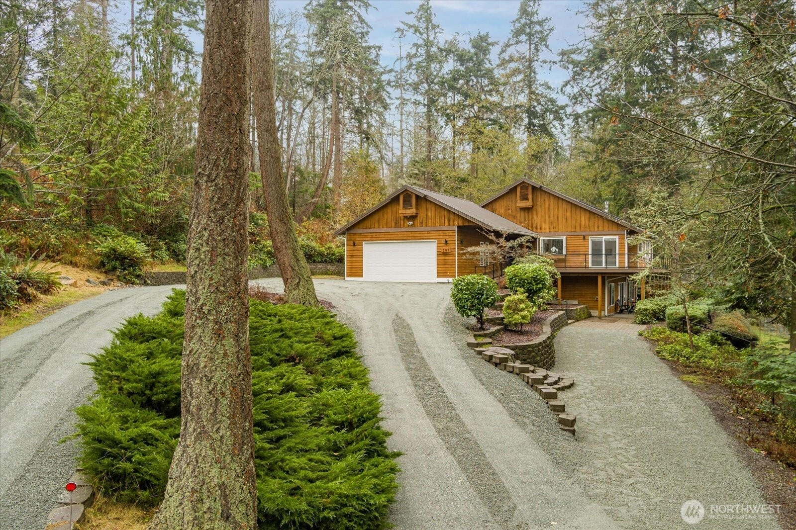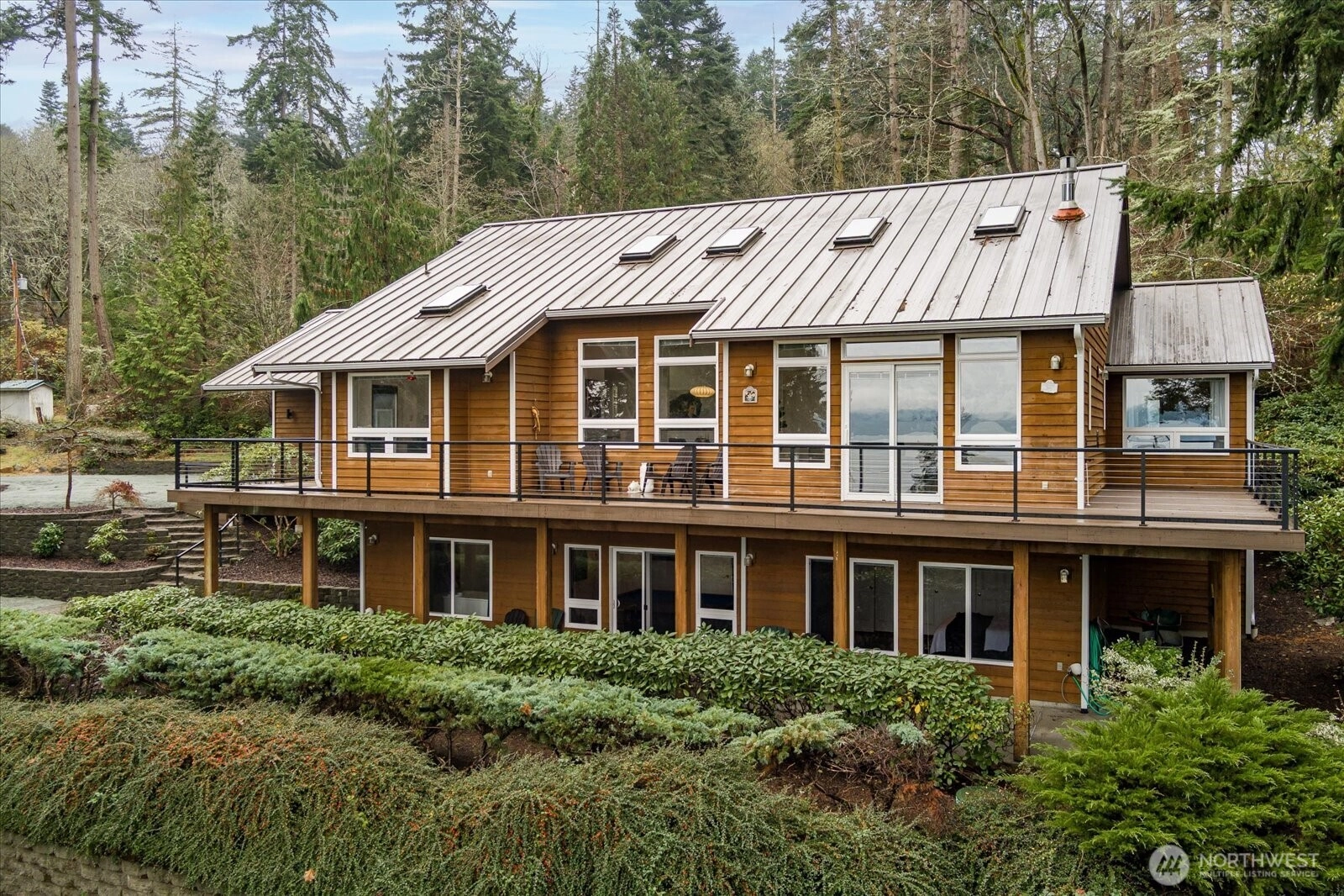 Experience the essence of Northwest contemporary living in this beautifully remodeled, light-filled home with panoramic water views. Vaulted ceilings, dramatic skylights, and a full wall of windows create a bright, airy atmosphere year-round. Enjoy true main-floor living with an open, modern layout, plus a full walk-out basement apartment ideal for guests, multi-generational living, or income potential. Thoughtfully updated throughout with too many upgrades to list, this home even includes a hidden secret room for added versatility and charm. Tucked privately on 2 serene acres and set back from the road, this retreat offers the perfect blend of nature, privacy, and sophisticated design.