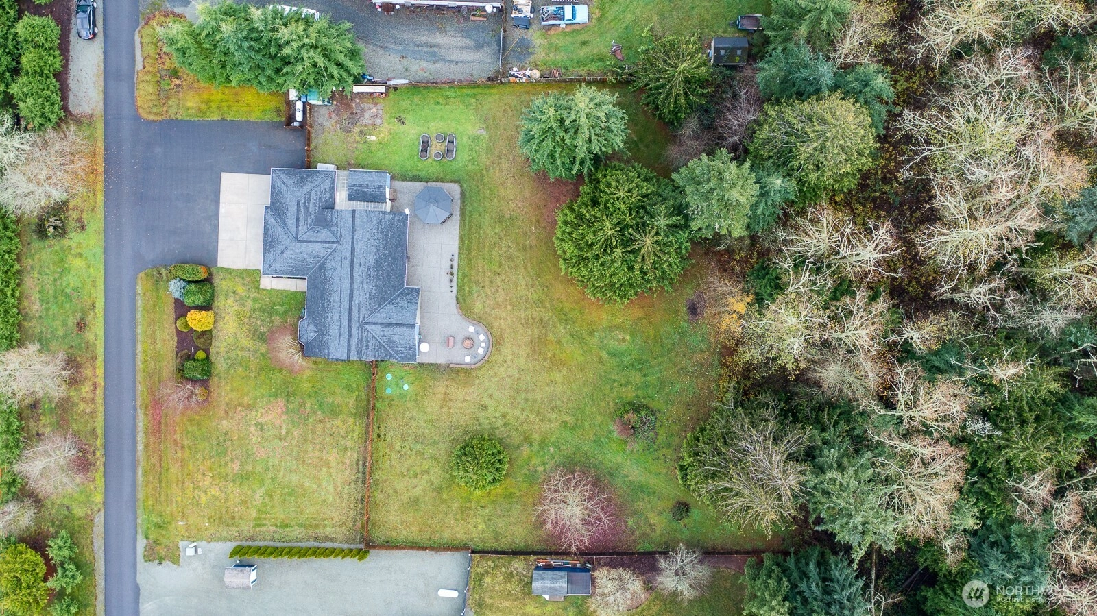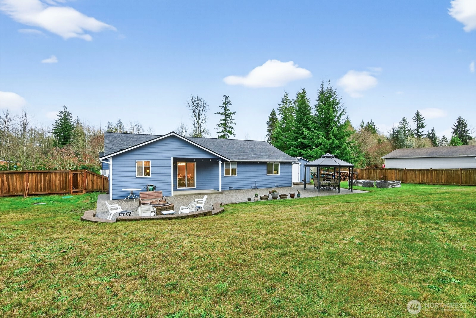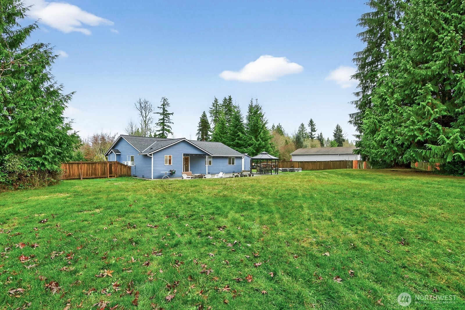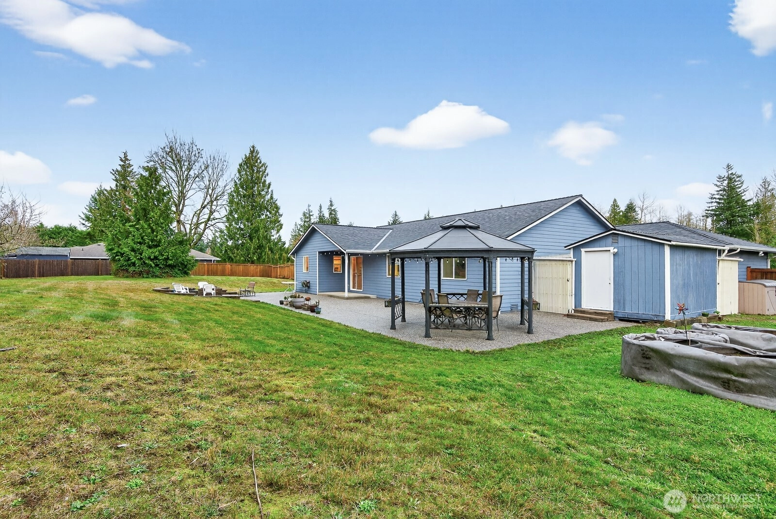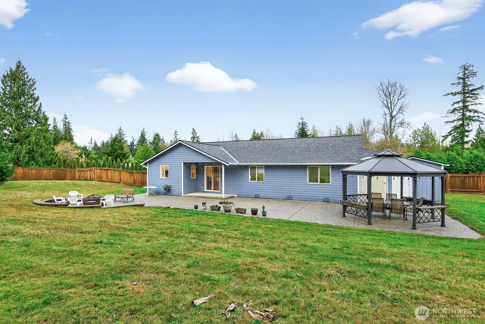 Rambler on a very usable one acre lot in a great community! This 3 bed 2 bath home has an inviting living room that is open to the kitchen & dining with vaulted ceilings, laminate floors & a propane fireplace. Spacious primary bedroom with double sinks in the bathroom & a walk-in closet. Brand-new roof! Nice 3 car garage with 220V pwr. incl. 40A elect. car charger & a 30A RV plug outside. Come enjoy the awesome backyard with a big concrete patio, firepit, gazebo & lots of space to garden & play! Very desirable community of 9 homes with a paved, dead-end street just 10 min from I5. There's a list of items that stay, including a 2020 John Deere riding mower! Possible room for a shop? And the larger 4 bed septic ready for future home addition.