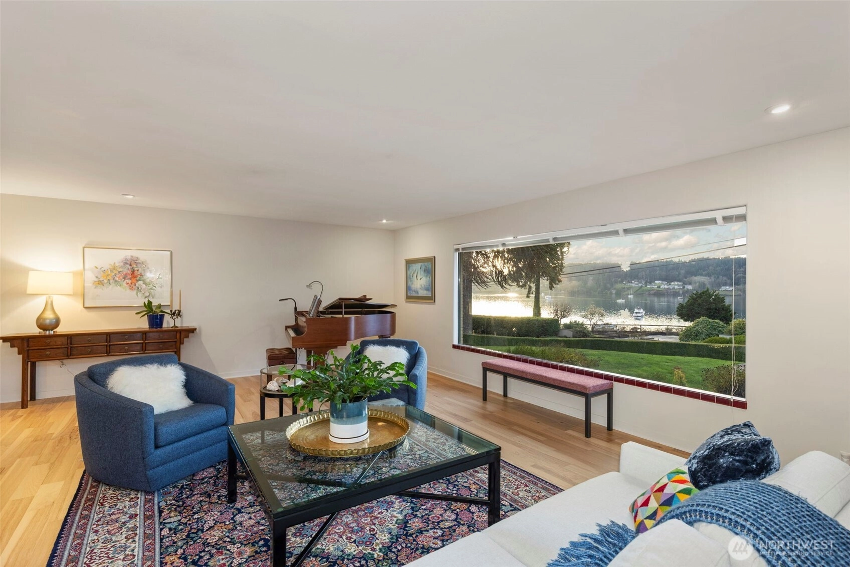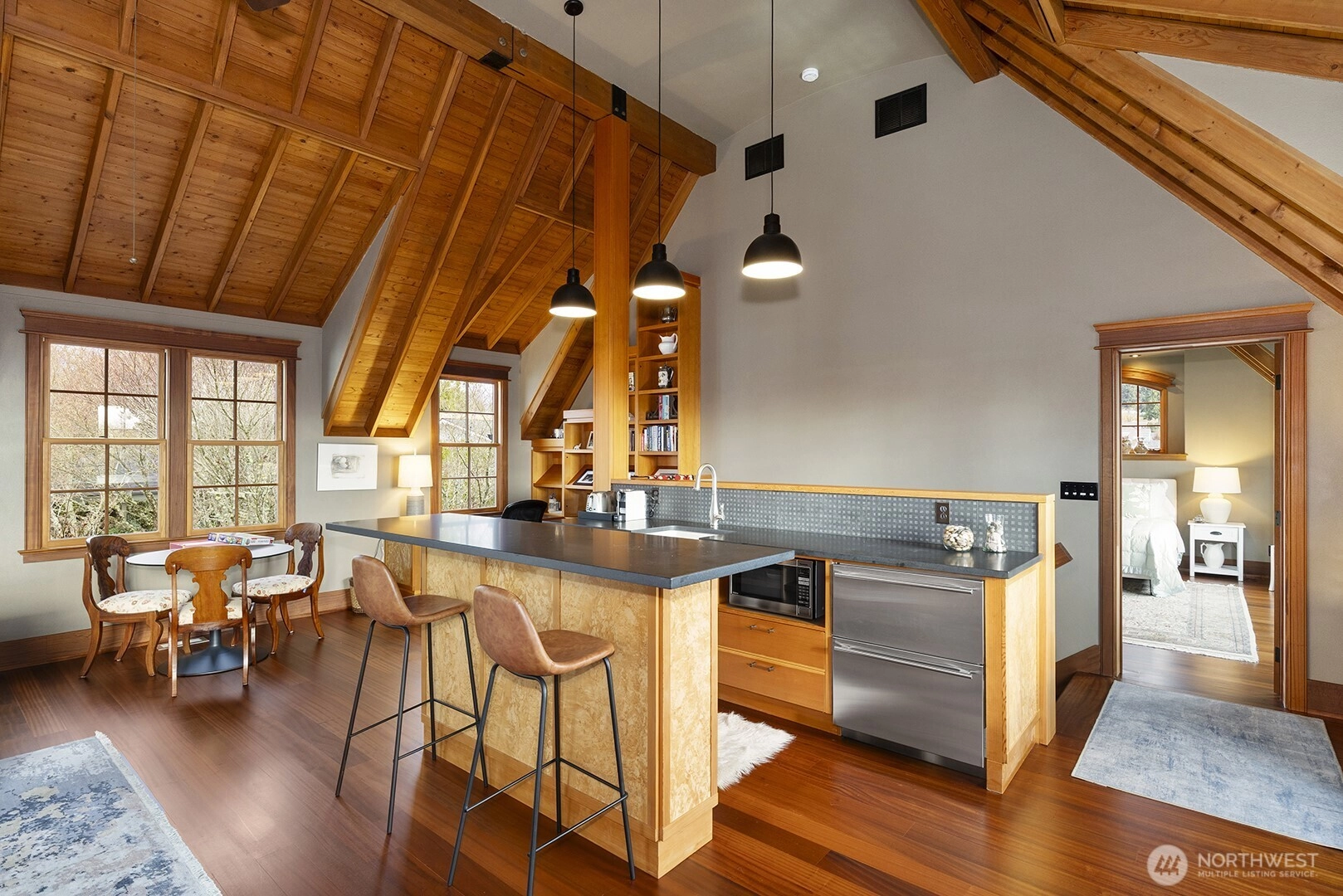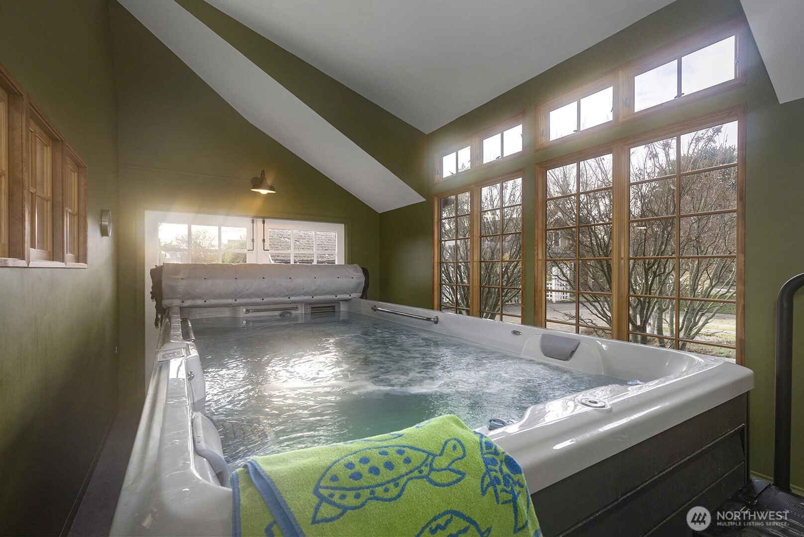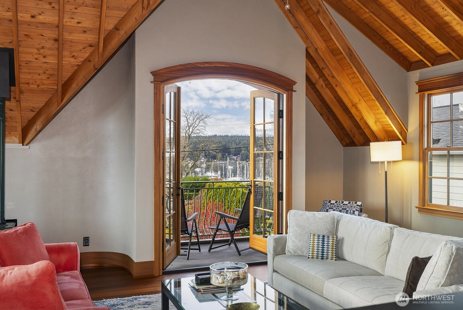A rare opportunity to live a beautiful life in the heart of picturesque Poulsbo. In-town estate enjoys sweeping Liberty Bay & Olympic Mountain views + instant access to historic Old Town, the marina, parks, dining & waterfront trails. Prized single story blends mid-century w/ refined updates & exceptional natural light. Beautifully landscaped courtyard + glass-covered breezeway connect to a custom craftsman carriage house & stunning studio/office/shop on one level + a vaulted guest retreat above w/ a private deck overlooking the bay. Another garage w/ 14' ceilings offers parking for multiple vehicles, extensive storage + flexible space for collectors, hobbies, or creative pursuits. 3rd bay features an enclosed Endless Pool xercise/spa area