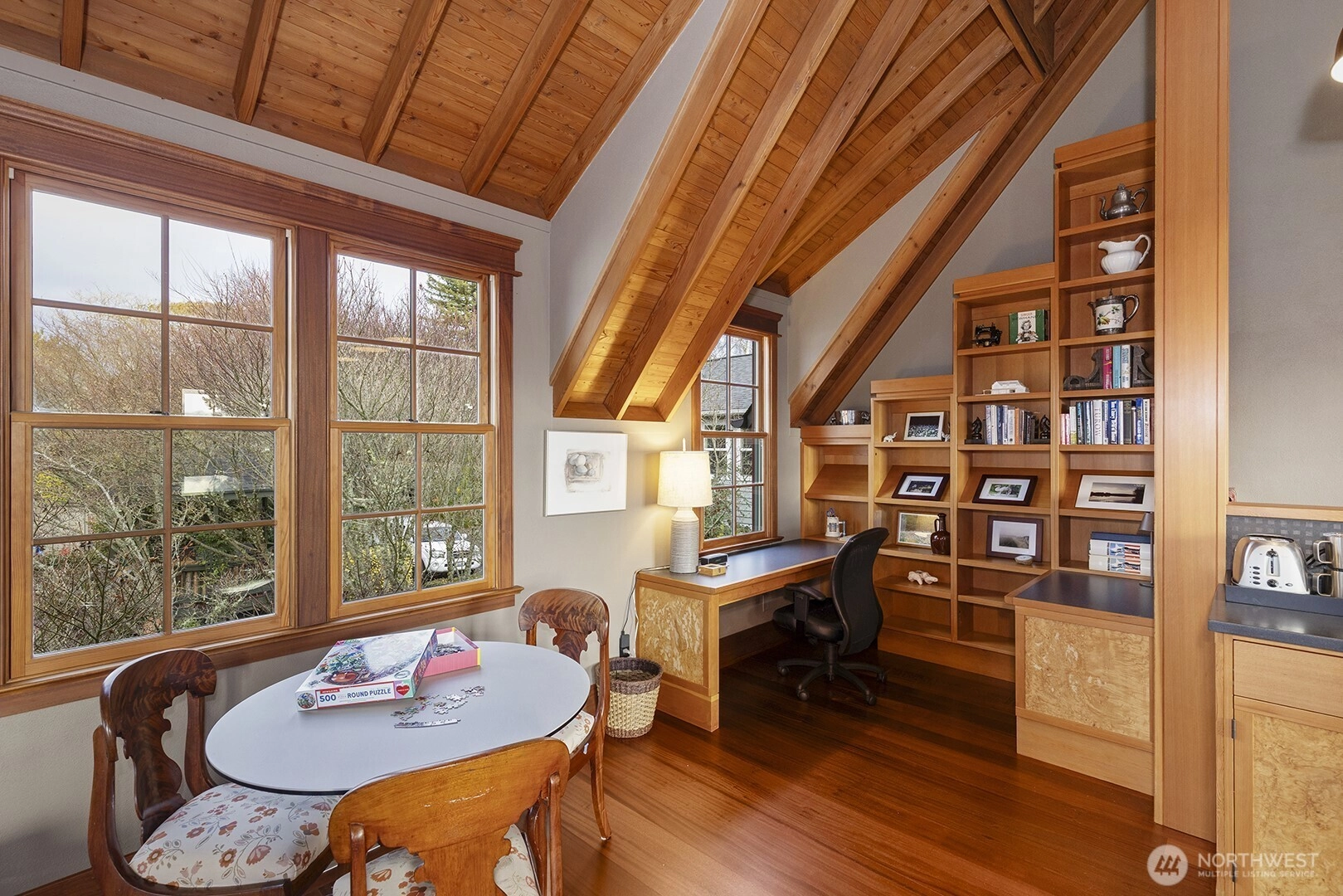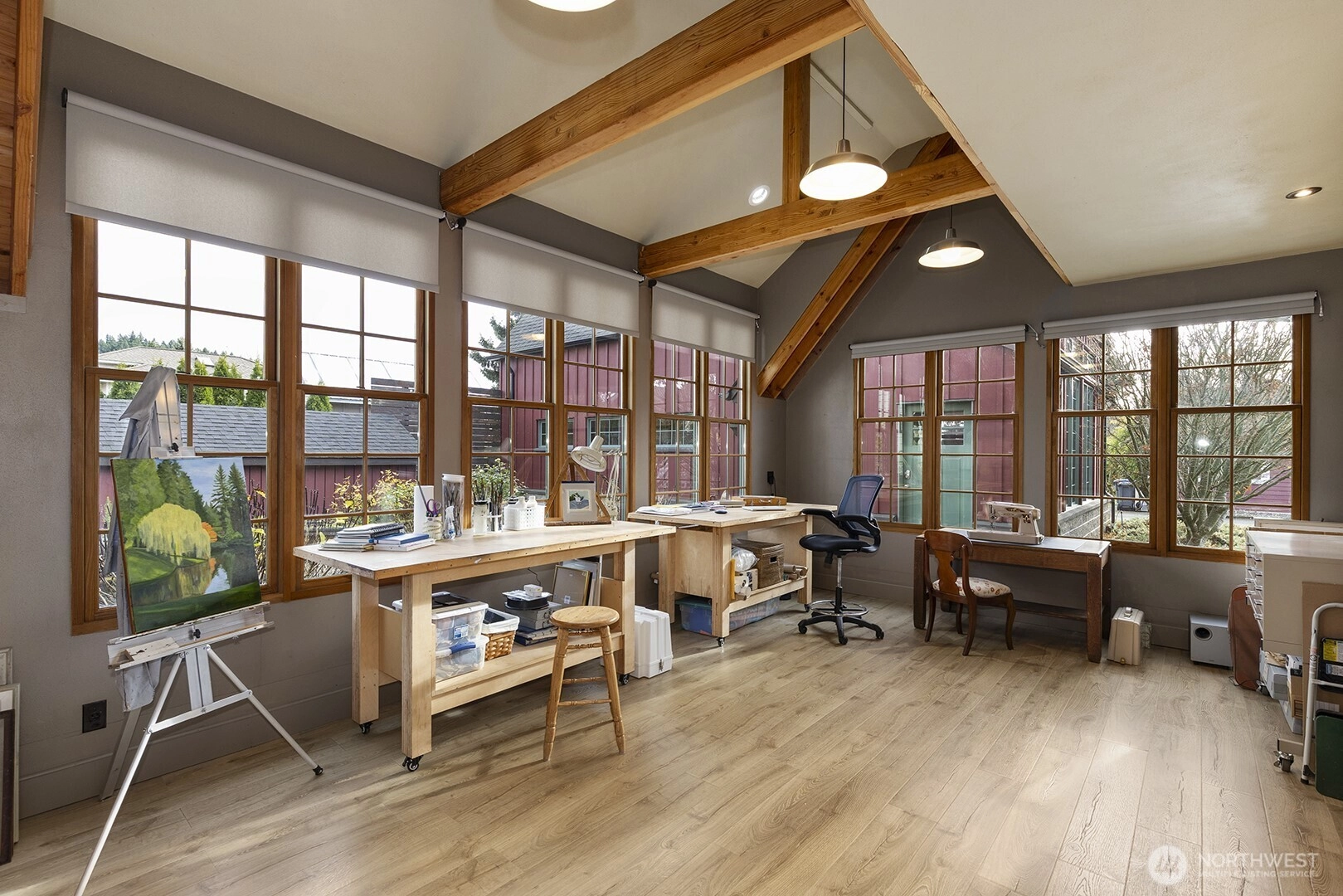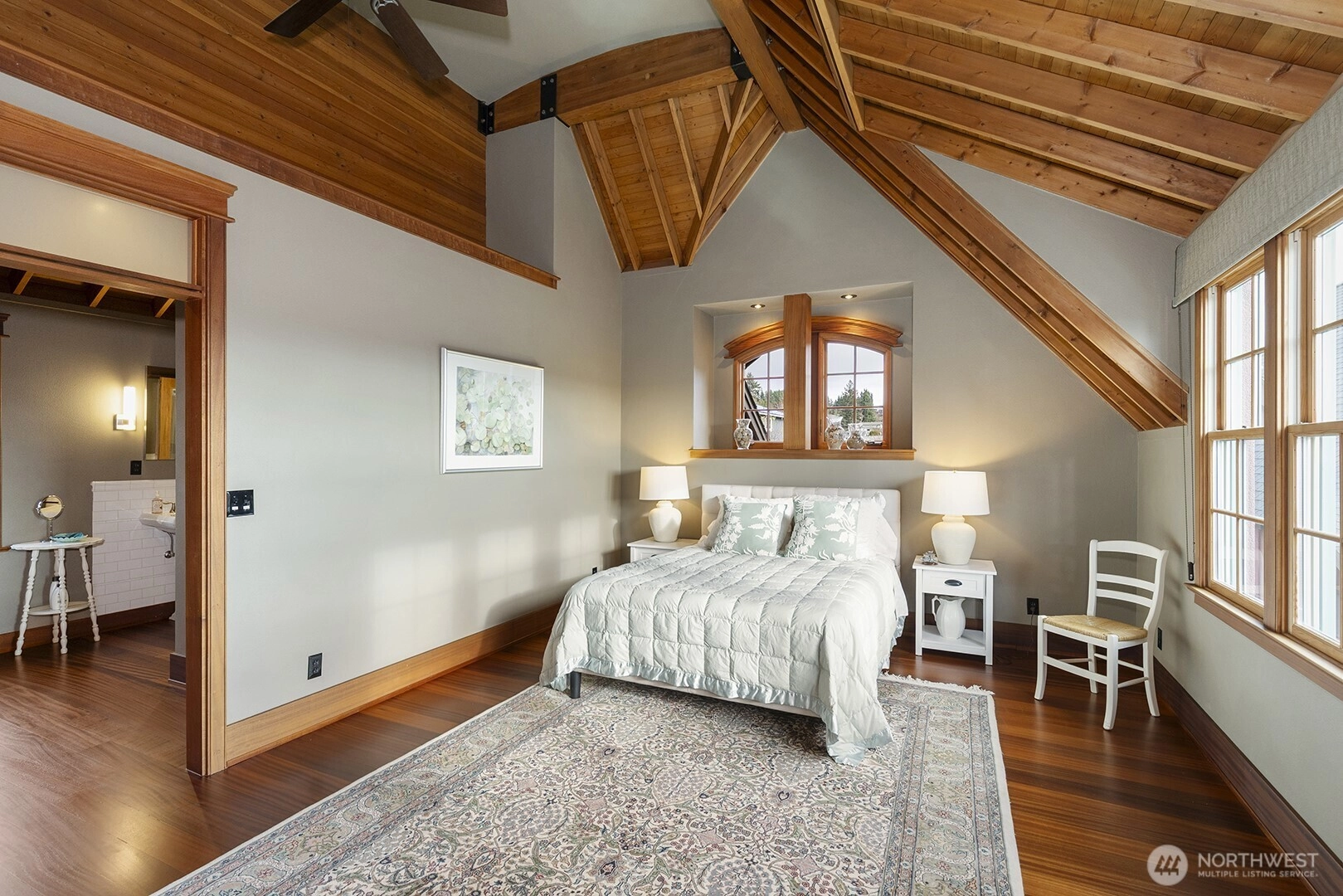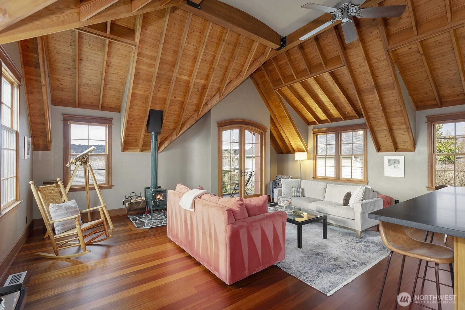 A rare opportunity to live a beautiful life in the heart of picturesque Poulsbo. In-town estate enjoys sweeping Liberty Bay & Olympic Mountain views + instant access to historic Old Town, the marina, parks, dining & waterfront trails. Prized single story blends mid-century w/ refined updates & exceptional natural light. Beautifully landscaped courtyard + glass-covered breezeway connect to a custom craftsman carriage house & stunning studio/office/shop on one level + a vaulted guest retreat above w/ a private deck overlooking the bay. Another garage w/ 14' ceilings offers parking for multiple vehicles, extensive storage + flexible space for collectors, hobbies, or creative pursuits. 3rd bay features an enclosed Endless Pool xercise/spa area