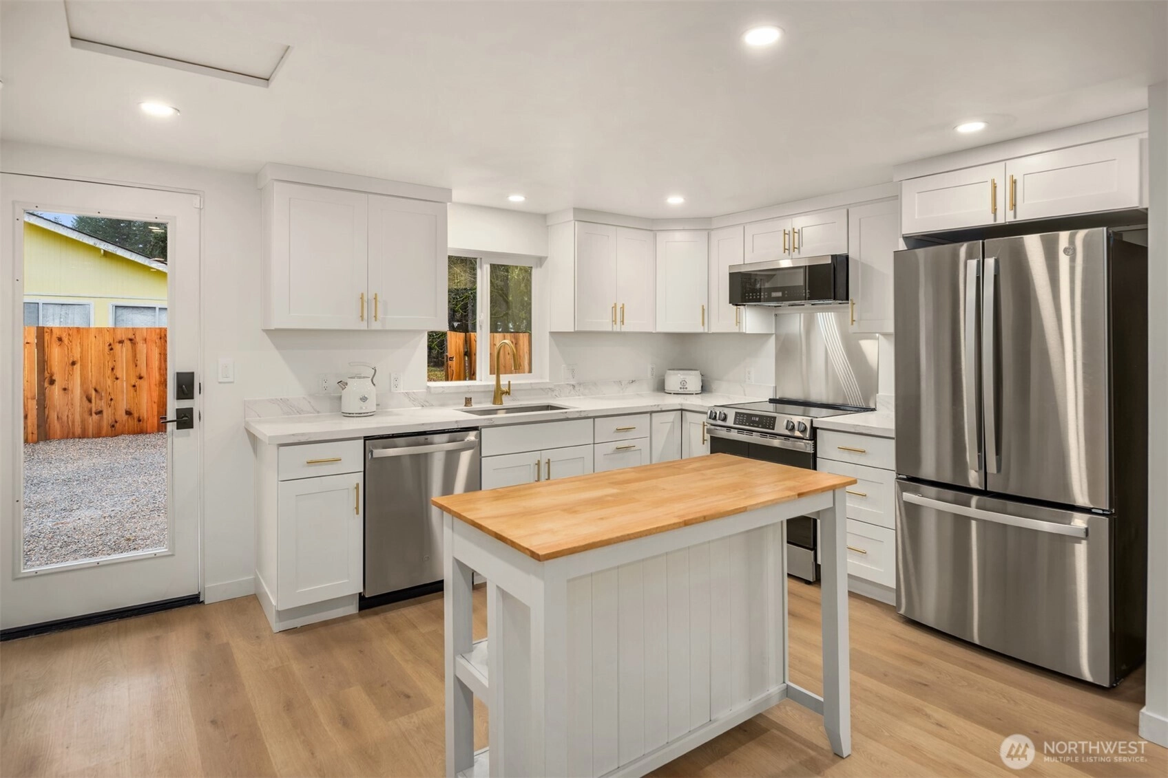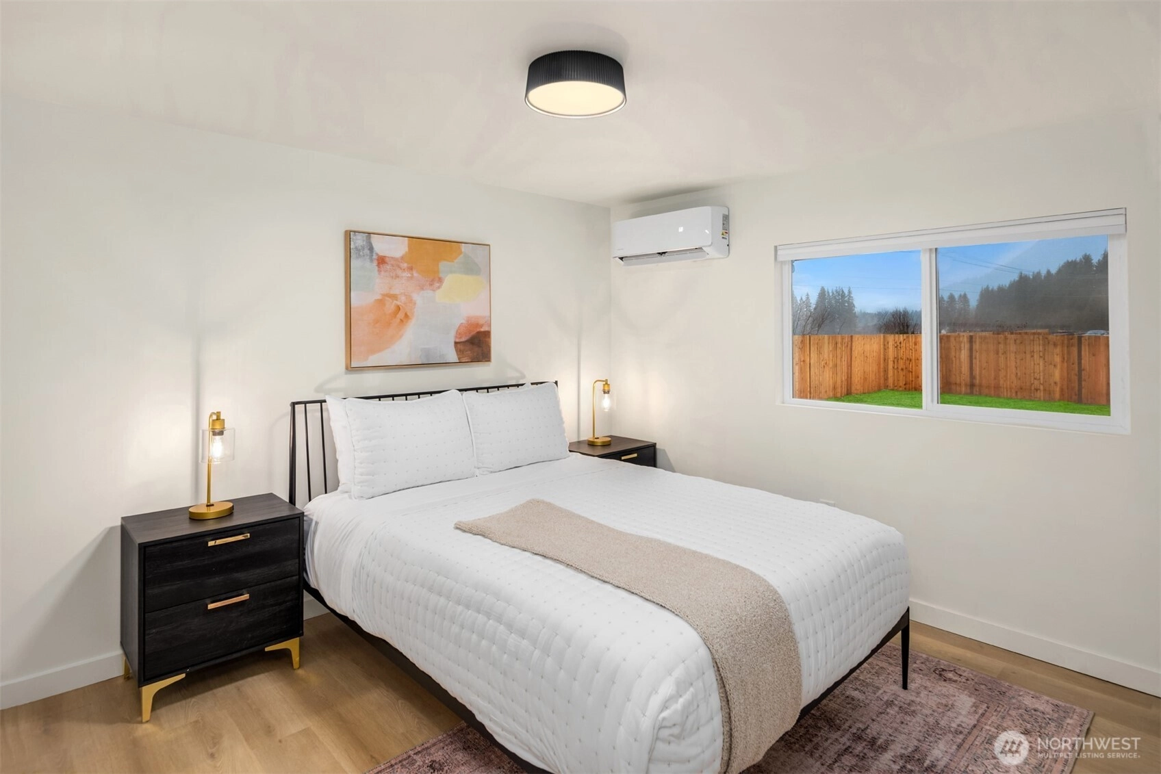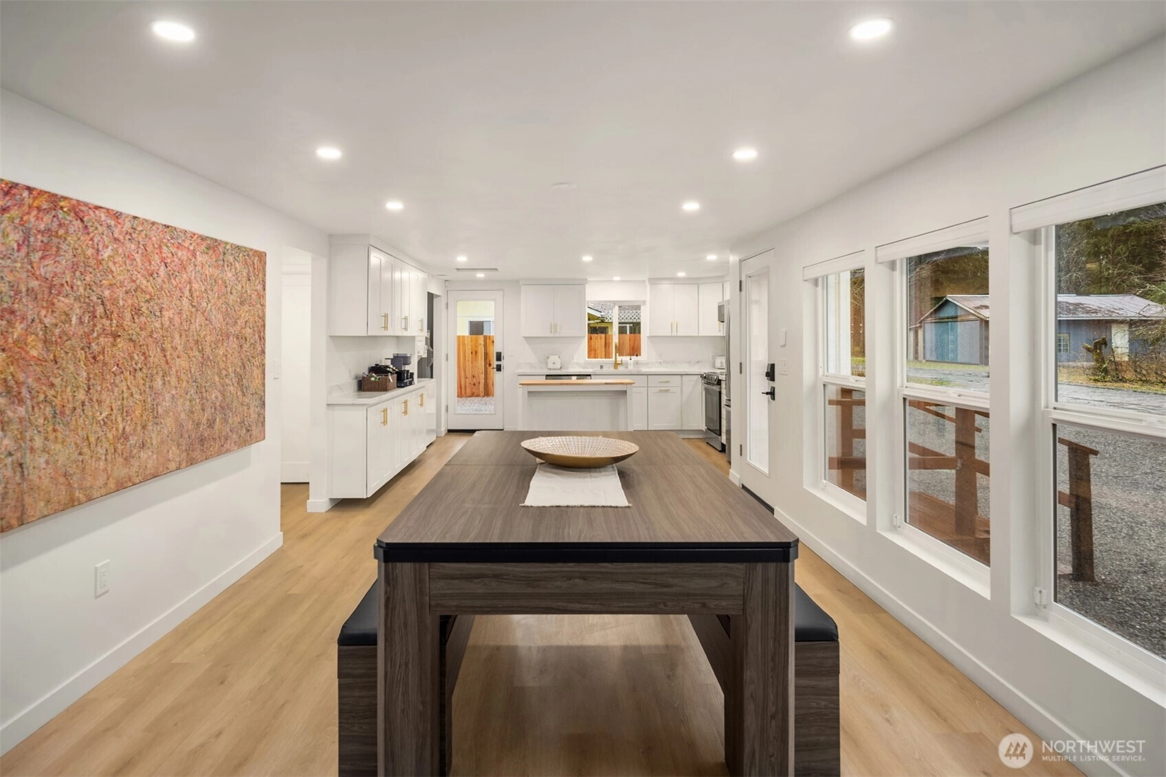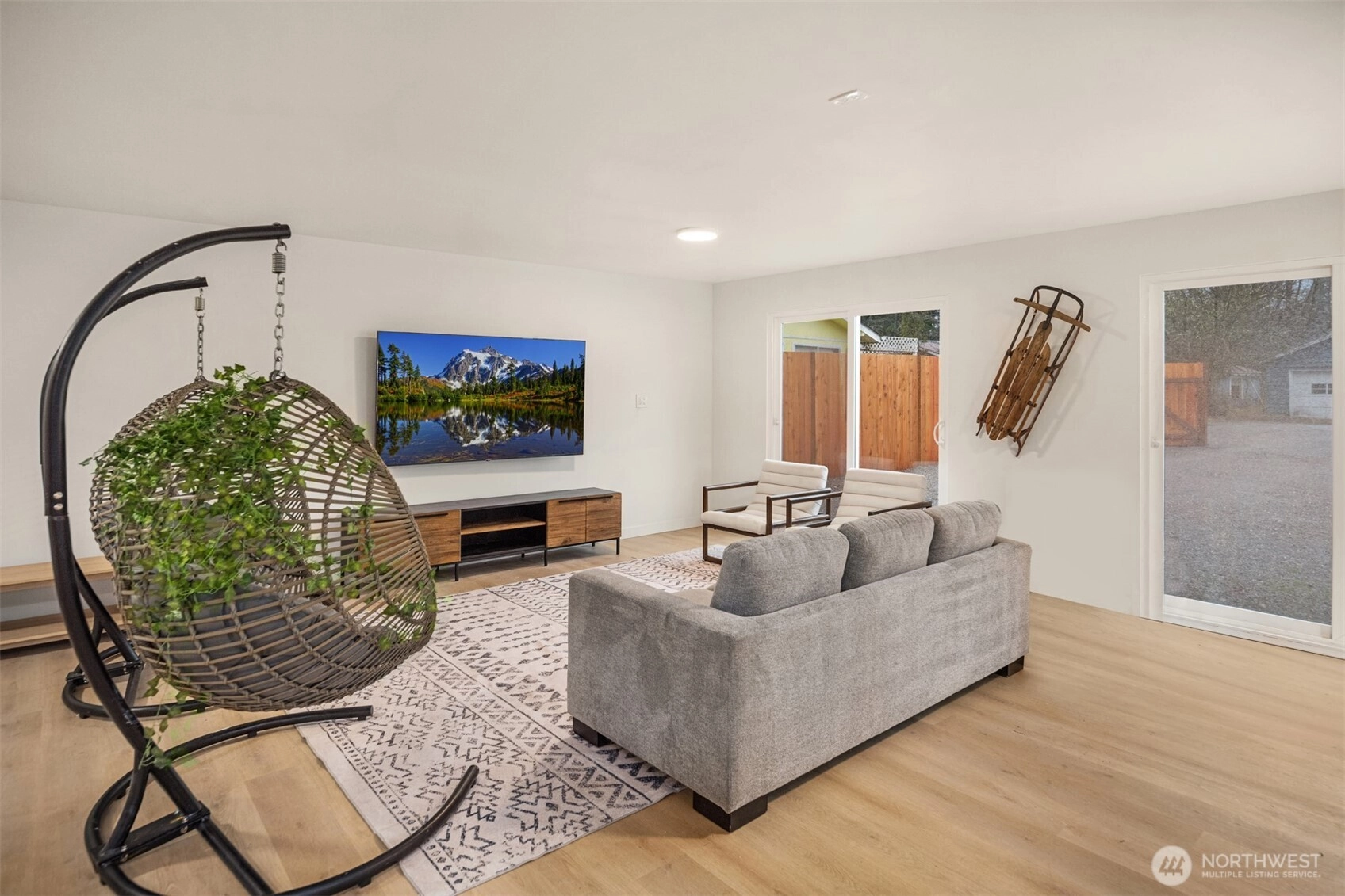 Beautifully remodeled 3 bed/1.75 bath home in Darrington with mountain views, near the North Cascades with endless hiking opportunities. Features include LVP flooring throughout, a spacious primary suite with double vanity, quartz counters, tile shower and floors. Two large bedrooms share a stylish full bath. The kitchen boasts shaker cabinets, quartz counters, and stainless appliances. Finished 672sf garage with LVP and glass sliders makes a perfect rec room. Mini splits for year-round comfort. Studs-out remodel includes new windows, doors, insulation, and roof, as well as new plumbing and electrical throughout. Fully fenced yard, detached carport with RV hookups. Offered furnished or unfurnished.