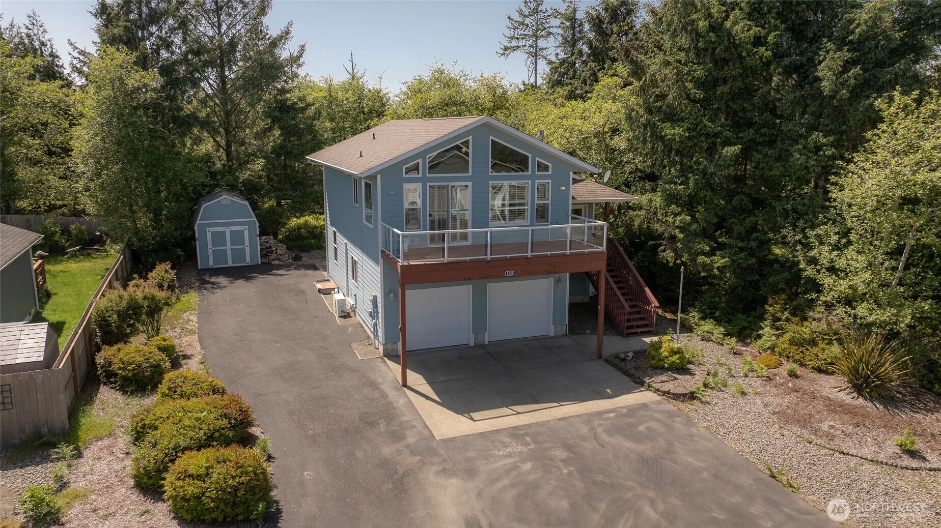 Contemporary home filled with natural light from large picture windows and vaulted ceilings, creating an airy, open feel. Stylish LVP flooring flows throughout. The modern kitchen features stainless appliances and slab granite counters—perfect for entertaining. The living room connects to a balcony with a bay view, ideal for relaxing. Stay comfortable year-round with a ductless mini split and cozy up by the gas fireplace. The primary suite offers a private bath and dual closets. Outside, enjoy the backyard fire pit, a 10x12 shed, and 50 amp RV hookup with dump. All just minutes from town—move-in ready!