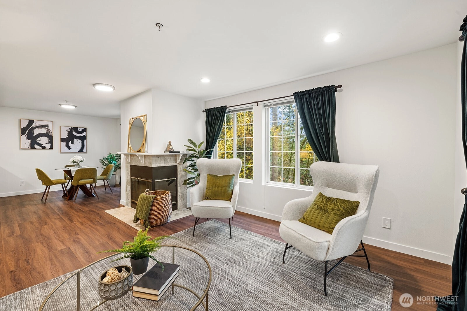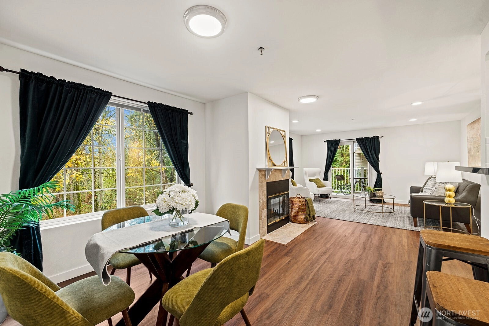 Exceptional 2-bed, 2-bath unit offering serene living across from the Mercer Slough Nature Park. This bright and freshly painted condo features a spacious open floor plan, beautifully updated kitchen, a cozy wood-burning fireplace, and a private deck overlooking a peaceful greenbelt. Enjoy rapid access to I-405, I-90, and Downtown Bellevue. Features include a large primary suite, DEDICATED garage parking, and location within the top-rated Bellevue School District. The perfect blend of tranquility and urban convenience—a smart investment in a prime location! All appliances stay! Fully Inspected!