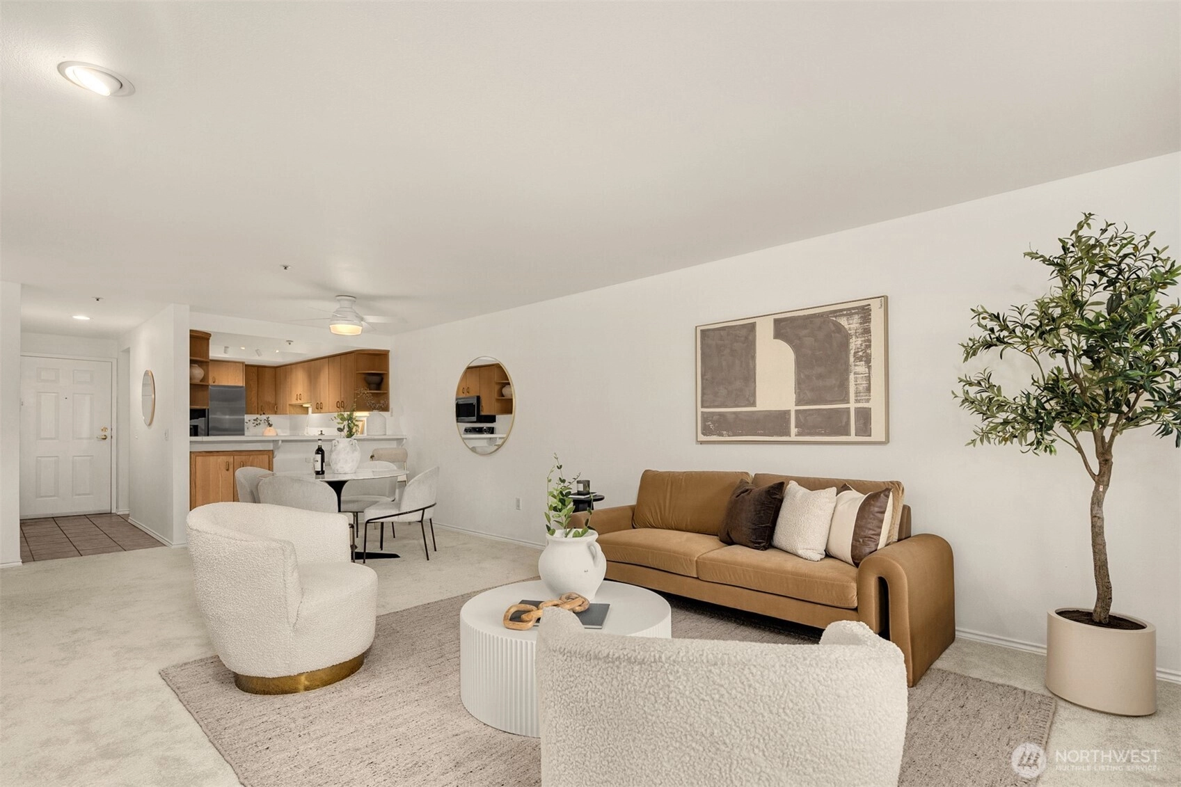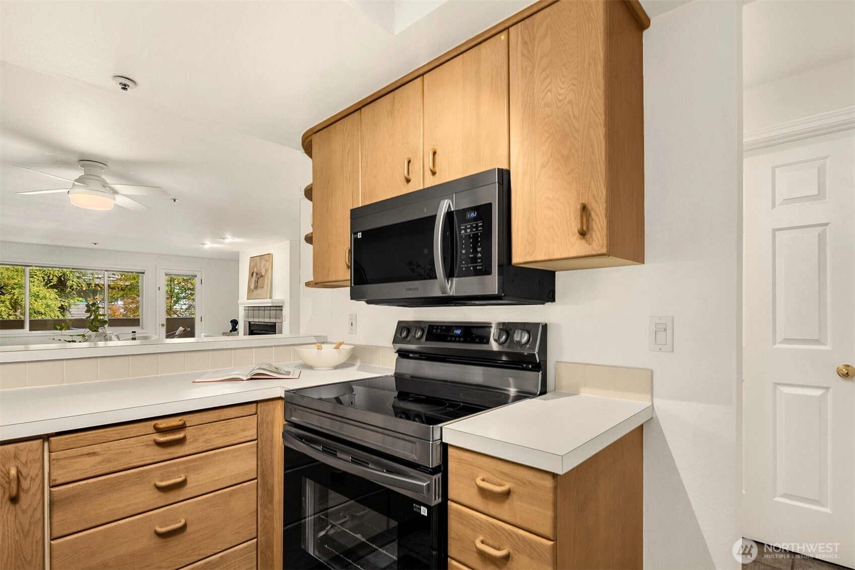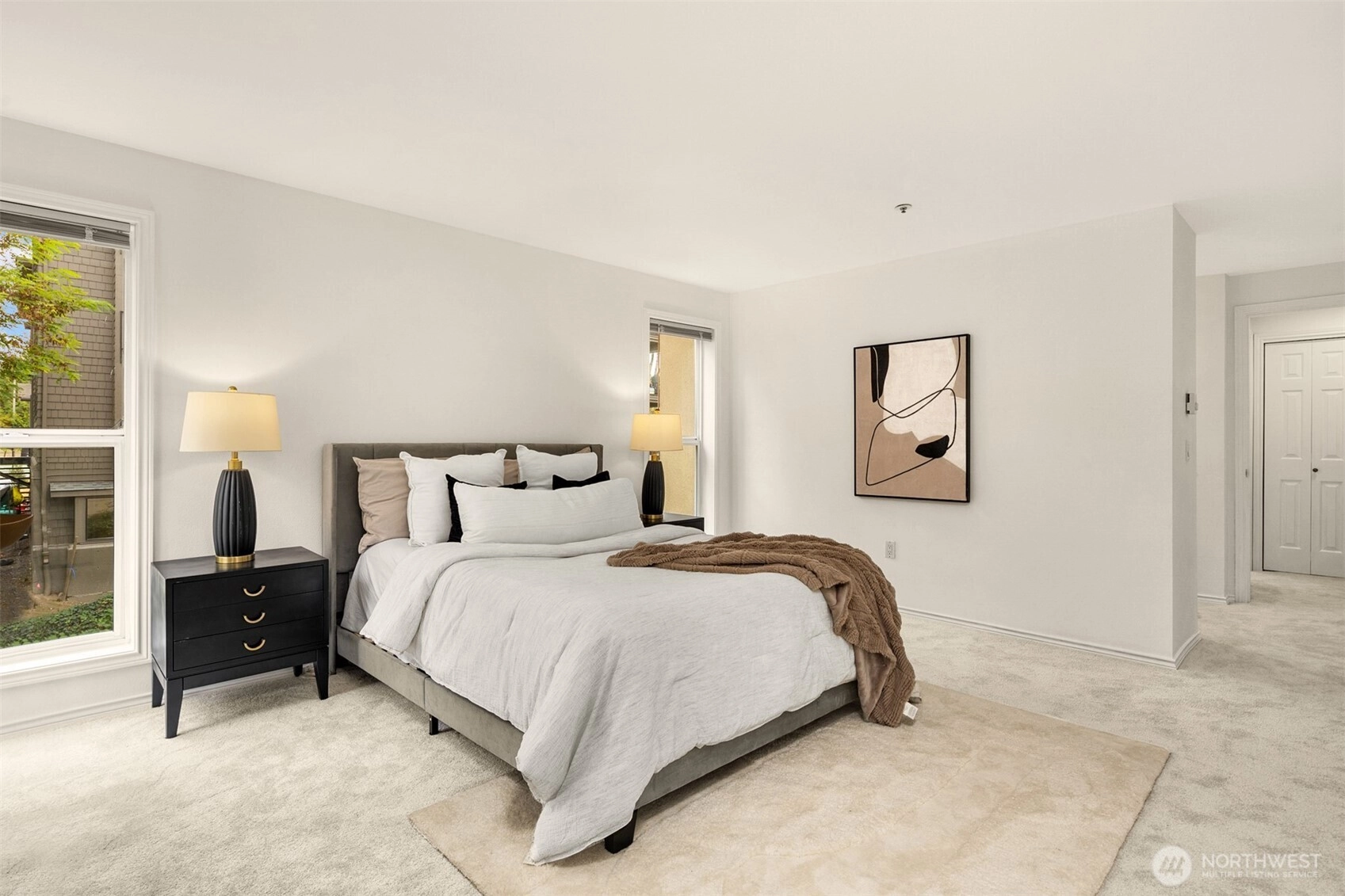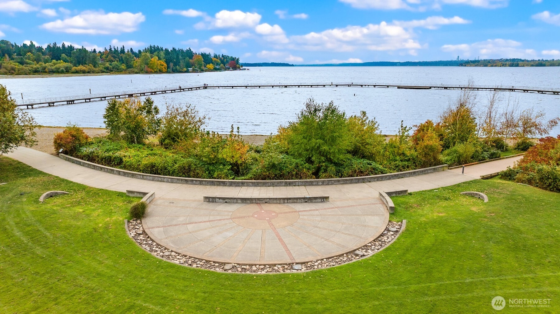Lakeside living opposite Juanita Beach Park on Lake Washington’s shores! Bright 2 bed, 1.75 bath corner unit features a spacious great room design with cozy wood-burning fireplace flowing to a large covered balcony. Modern kitchen with new stainless steel appliances, ample storage, and breakfast bar. Primary suite with en-suite bath, generous closets, and private balcony access. In-unit laundry and storage. Fresh carpet and paint. Savor serene tree and creek views from your tranquil balcony. Stroll to swimming, fishing, tennis, or Friday Market’s fresh produce and unique crafts. Vibrant Juanita Village offers craft coffee, dining, shops and conveniences. Minutes to tech hubs and I-405. No rental cap. Move-in ready, welcome home!
