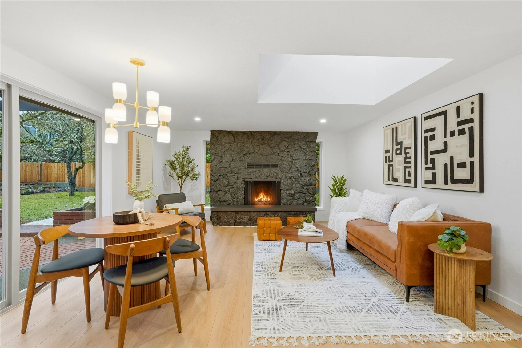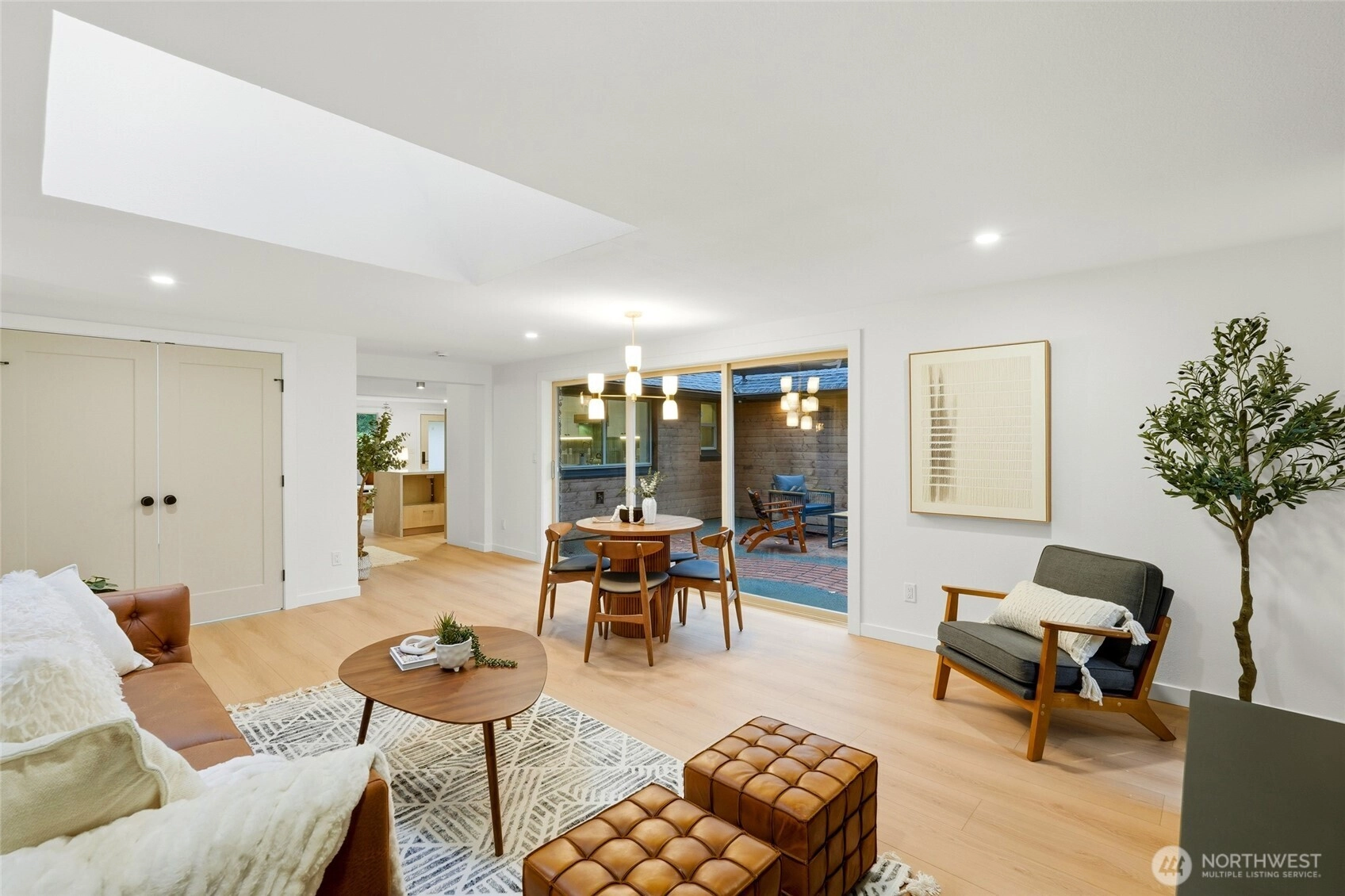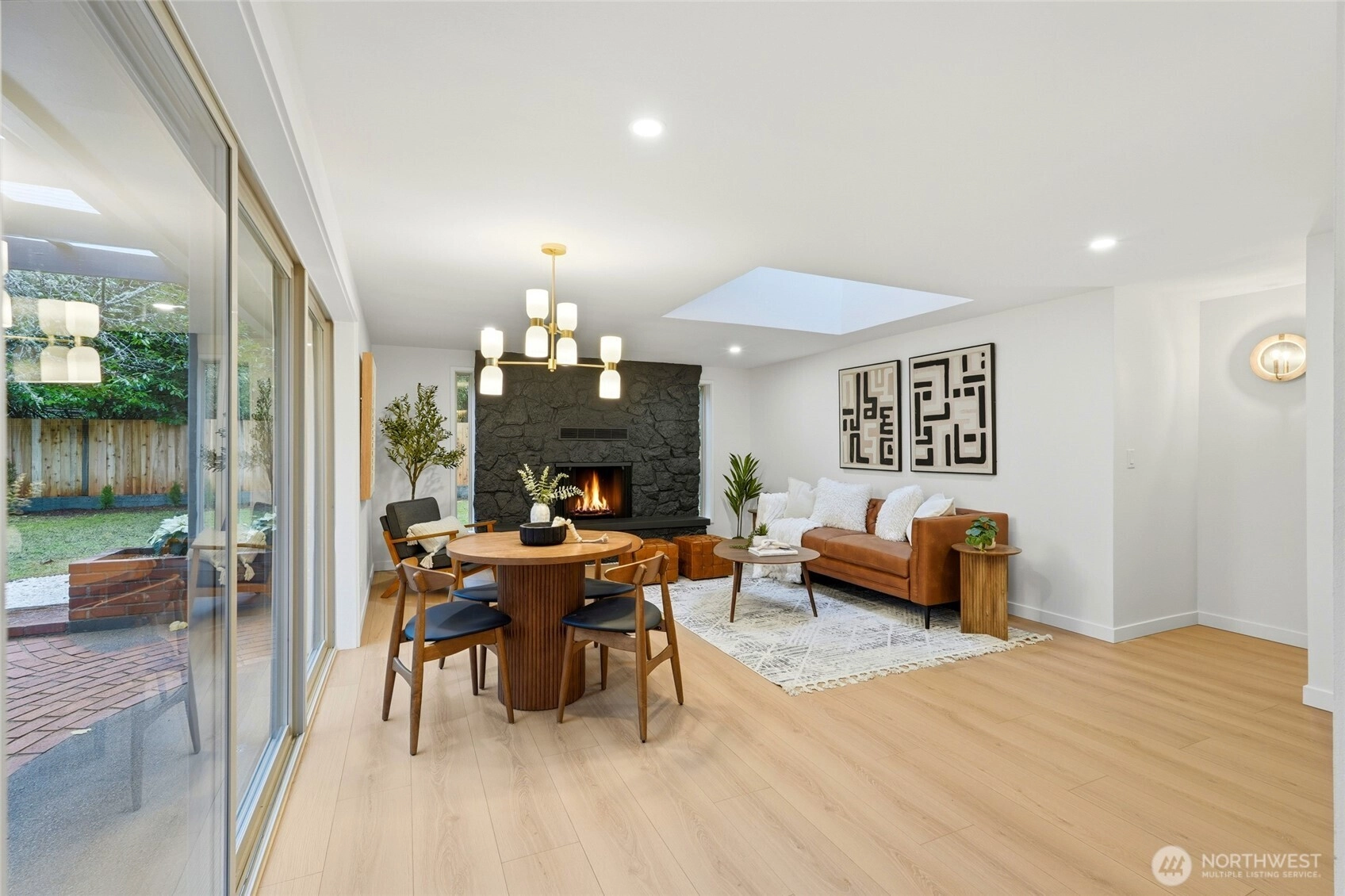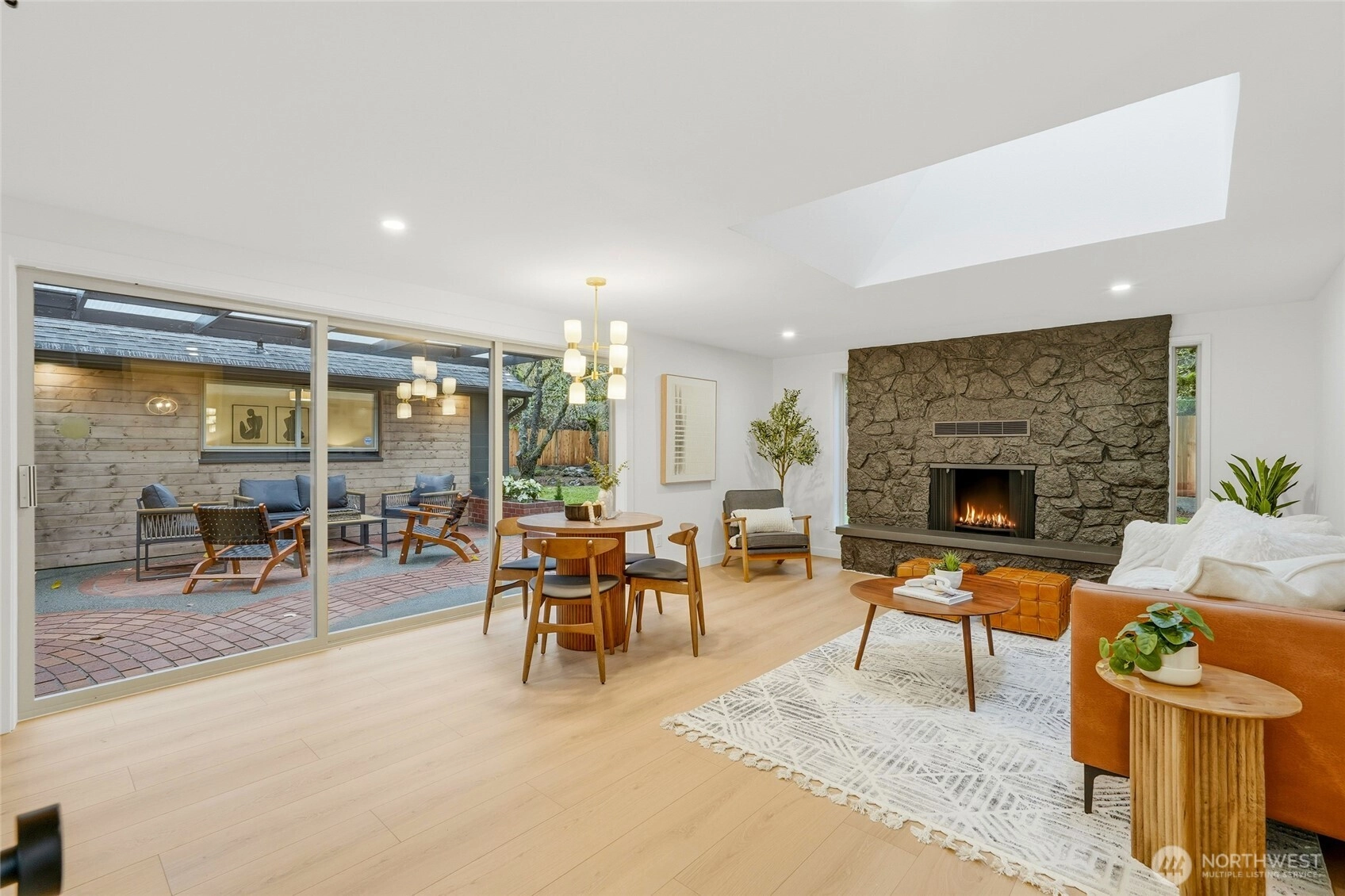 Fully permitted remodel offering easy one-story living in this 1,811 sq ft U-shaped rambler with a center covered patio. Rarely available and extensively updated with new roof, paint, flooring, doors, heaters, and more. Step into the bright living area featuring a tiled wood-burning fireplace and a custom kitchen with new appliances and a large window overlooking the patio. Dining area is positioned next to a 3-panel slider, with a comfortable family room nearby and a designer powder room off the family room. Private primary suite is set apart in its own corner and includes a spacious layout, ¾ bath with double vanity, and rain-head shower. Two additional generous bedrooms and a full bath. One-car deep garage with extra storage space and EV