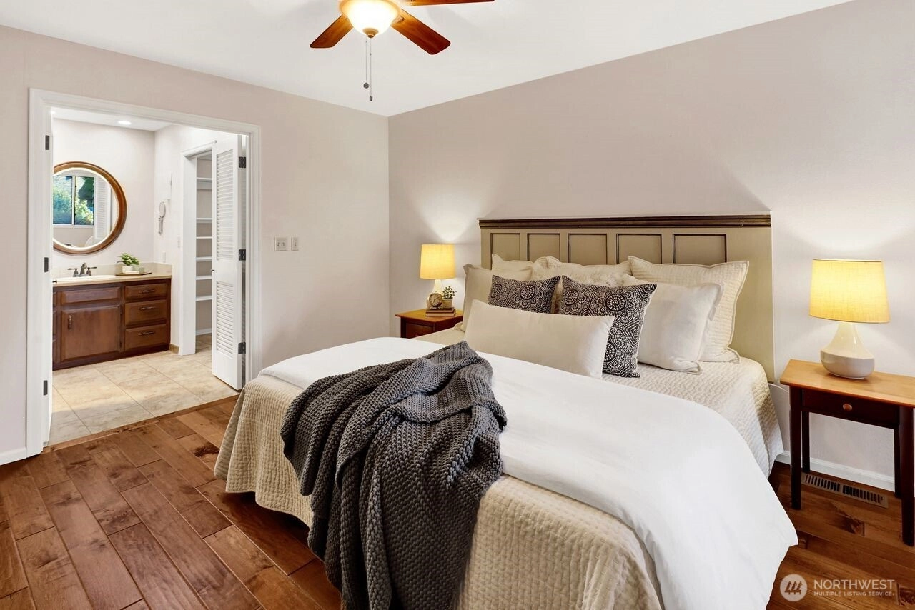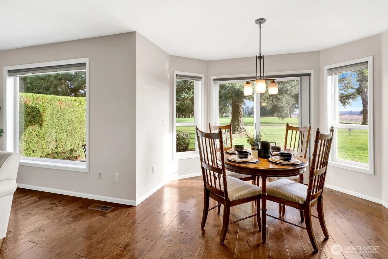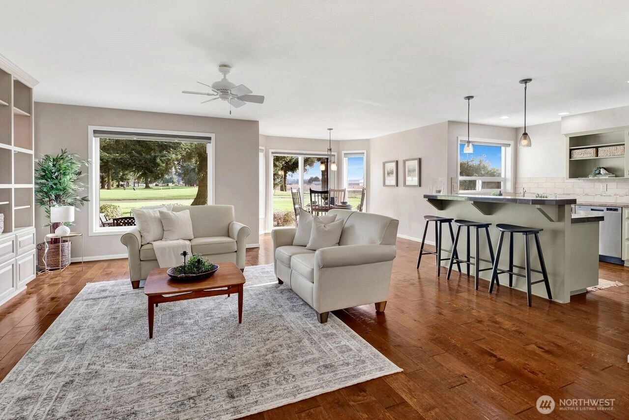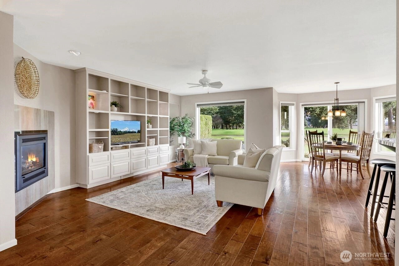 Beautifully updated condo on the 5th-hole green at Raspberry Ridge Golf Course with views of Twin Sisters Mountain. Main-floor living features 2 bedrooms, 2 baths, newer engineered hardwood floors, and a cozy gas fireplace with custom built-ins. Bright updated kitchen and dining area open to a serene patio overlooking the course and mountain views. The loft offers great flexibility—ideal as a 3rd bedroom, office, or media room. Newer hot water heater, newer dishwasher, and stainless steel appliances. Large 2-car garage on a quiet cul-de-sac and dead-end street. Low-maintenance, move-in-ready home in a desirable golf community. Centrally located between Bellingham and Lynden with easy access to shopping and services.