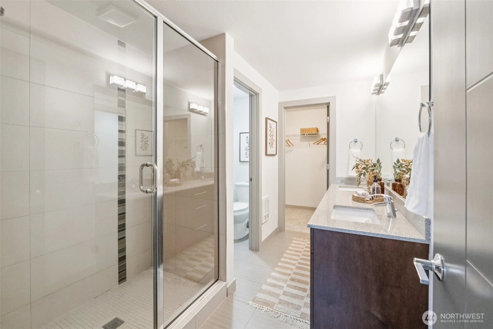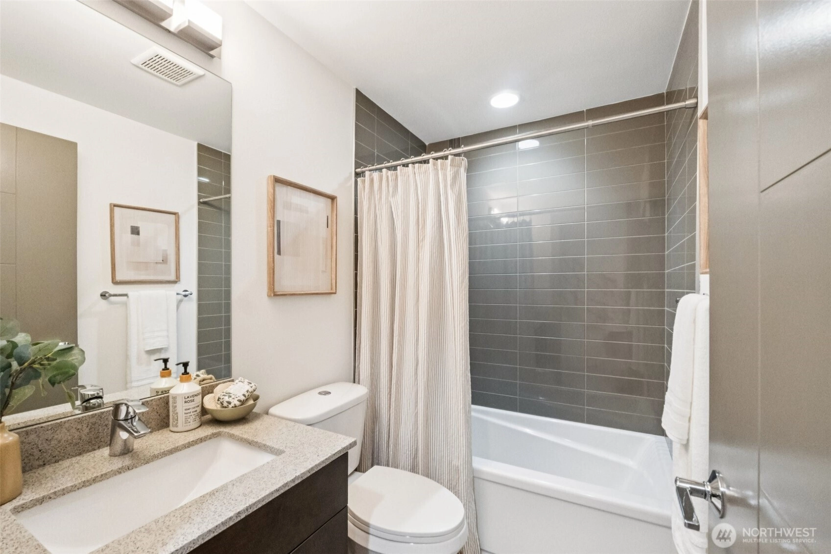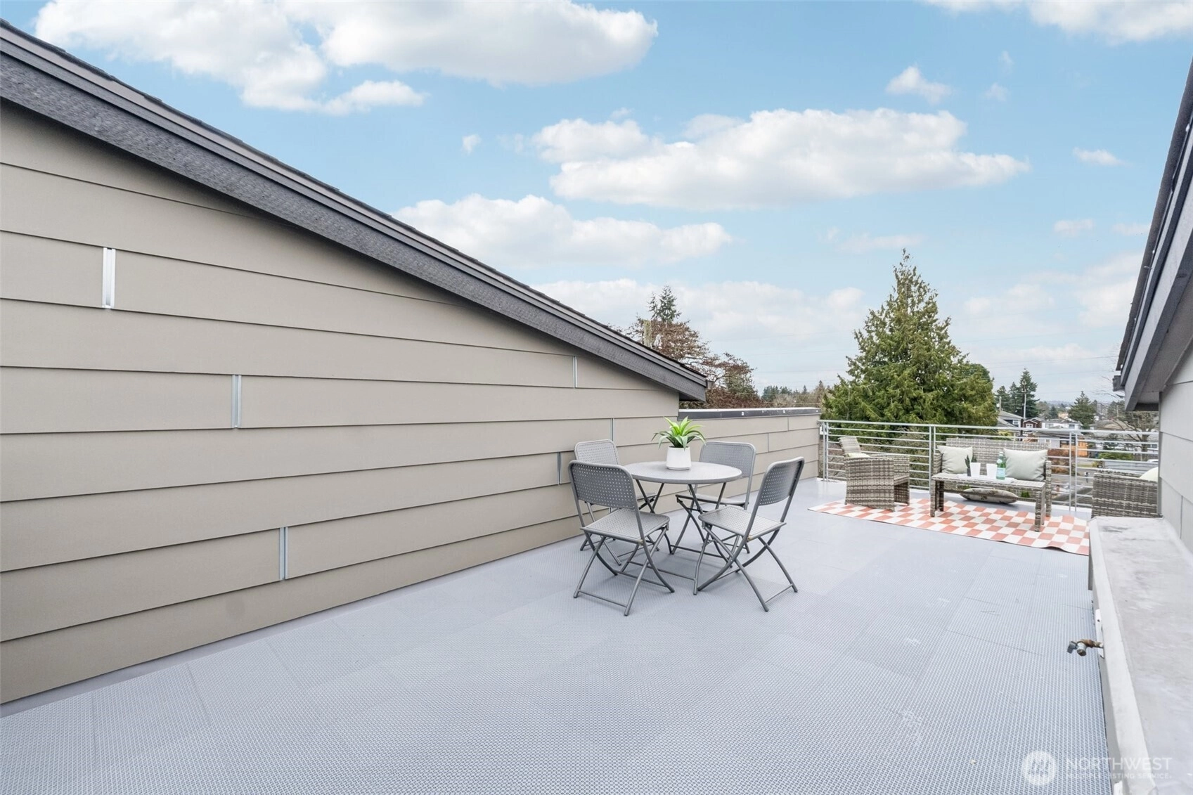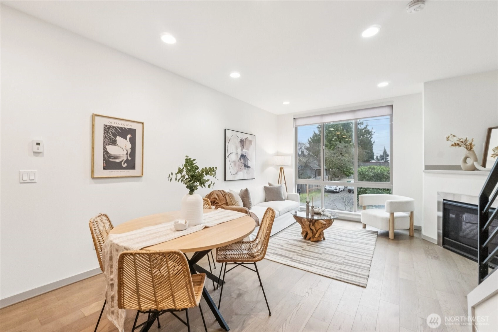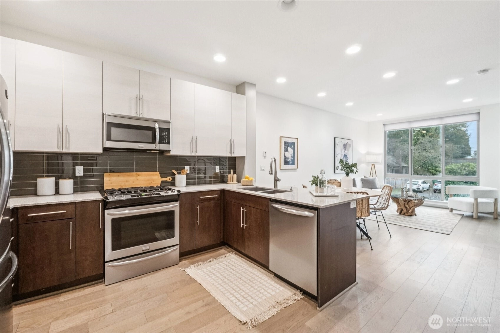 This modern townhome, built in 2017 stands out in a desirable North Seattle setting. Floor-to-ceiling windows fill the main level with natural light, accentuating the contemporary kitchen with quartz countertops, SS appliances, & an inviting living space with a cozy gas fireplace. The upper level offers a primary retreat with a stylish en suite & walk-in closet. Downstairs, two bedrooms and a full bath provide space for guests. Cap it all off with a rooftop deck featuring a gas hookup with city and mountain views—perfect for entertaining or unwinding at sunset. New roof & fresh interior paint in 2025, radiant heat, gated front yard, off-street parking, no HOA dues, and pre-inspected—this one is truly move-in ready.