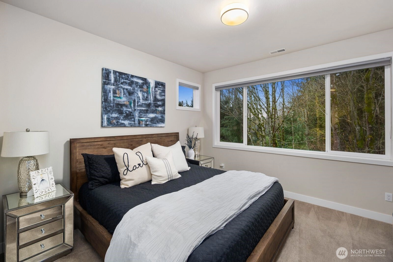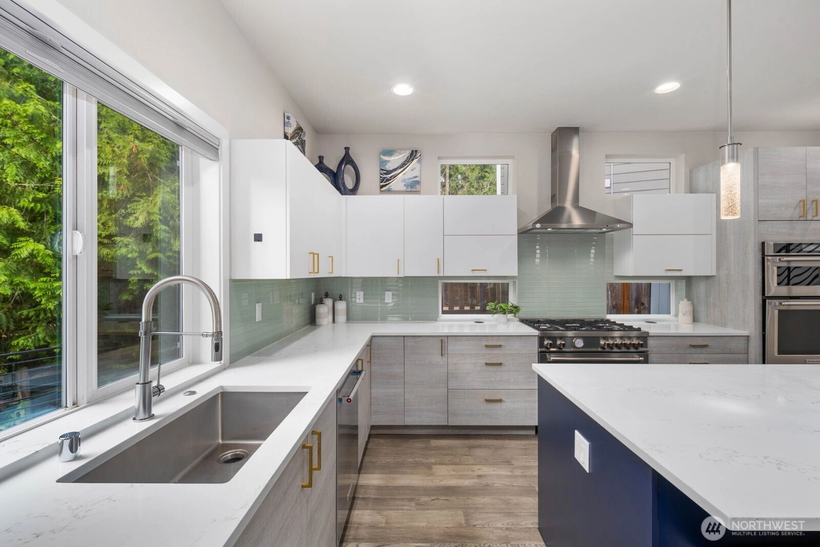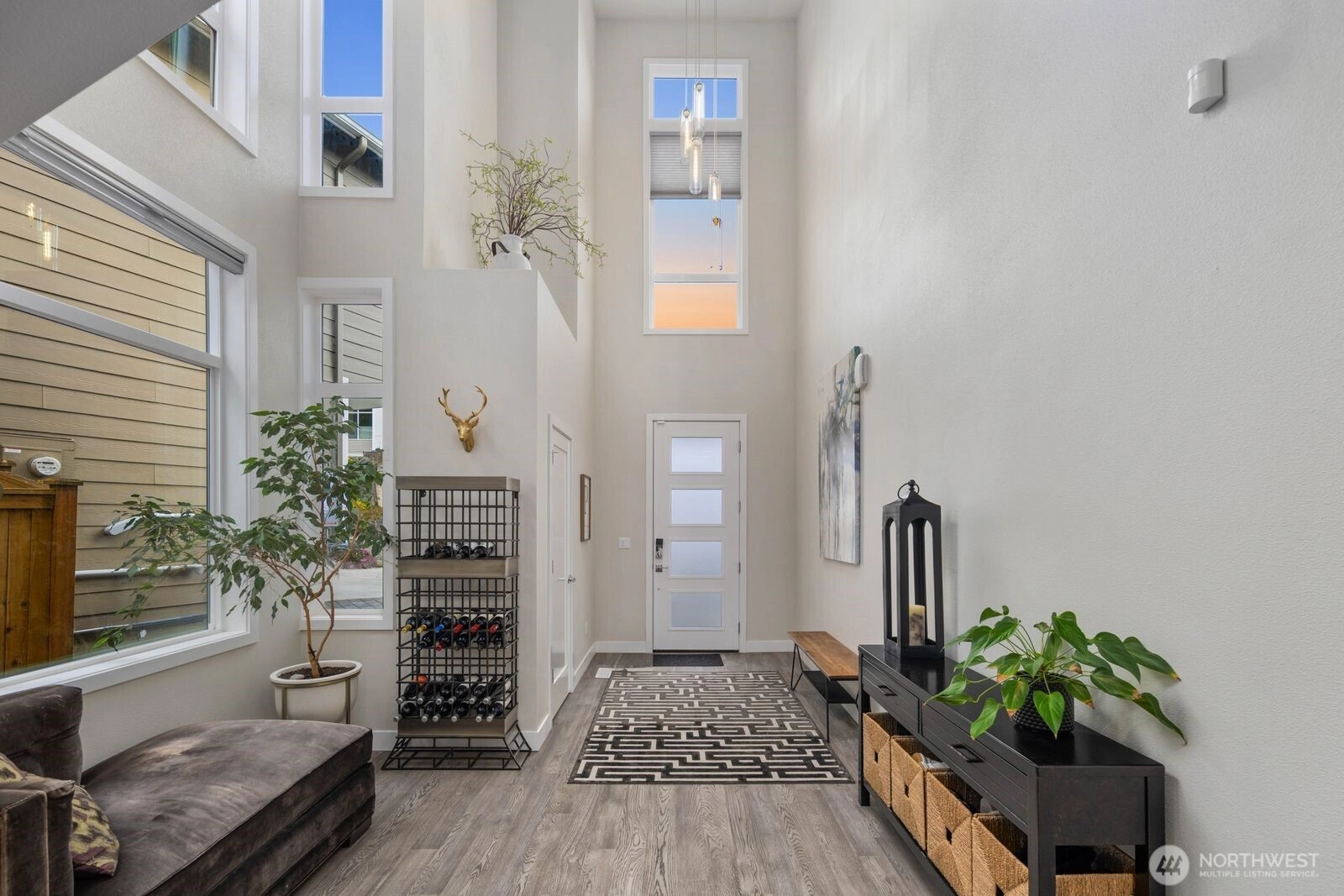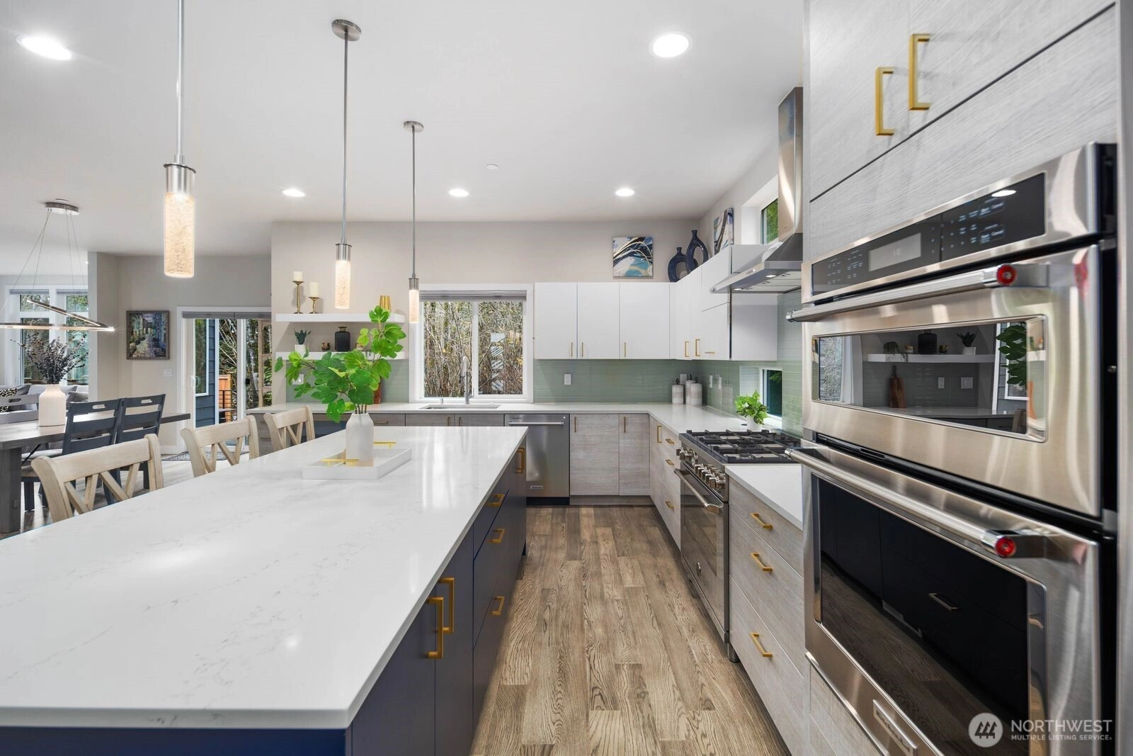Experience this stunning modern 5 bedroom home in the luxury enclave of Hidden Meadows. Upon entry you'll find a light & bright interior w/ 20 ft ceilings, a statement staircase w/ sleek metal railings & gorgeous hardwoods. The sprawling chef's kitchen includes quartz counters, a high-end Bertazonni gas range, double ovens & wine fridge. A desirable main-floor bdrm w/ full bath adds convenience & flexibility. The upper level offers 4 additional bdrms + 3 baths. The highly-functional low-maintenance backyard backs up to a protected green belt & features a $50K tiered patio w/ modern metal railings & turf. Premium blinds, A/C, 220 outlet for EV Charging. Coveted Northshore schools including Bothell High. Just mins to Downtown Bothell & I-405