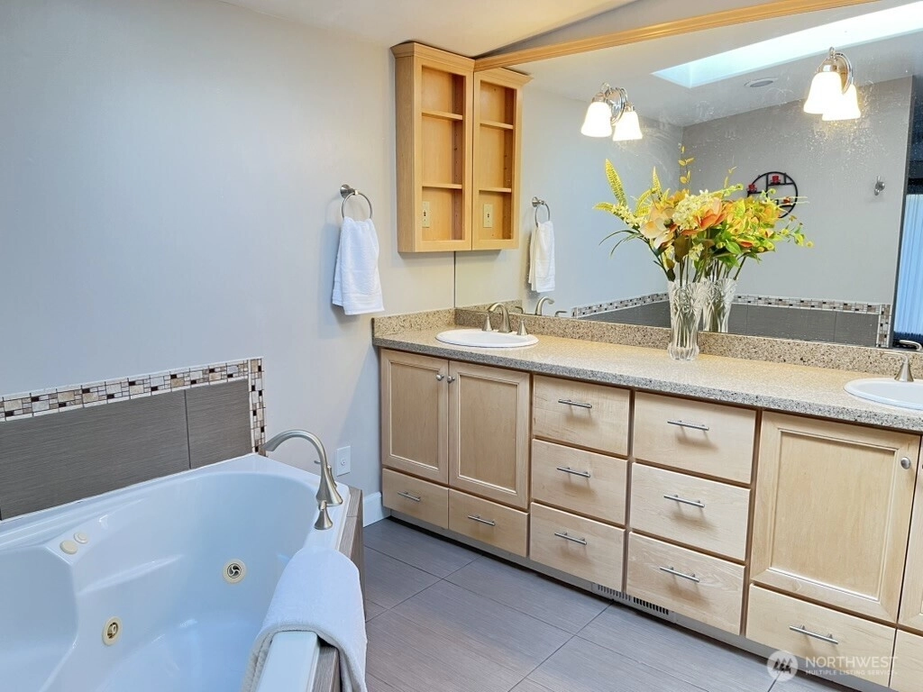 Beautifully private and surrounded by nature, this spacious home sits on a quiet, flat street with lush greenbelt privacy. Enjoy low-maintenance living and a sunny, oversized deck with treetop views. The light-filled kitchen and great room offer extensive granite counters and a large pantry. A 600 sq. ft. finished basement provides flexible space for a media room, gym, office, or play area. Upstairs features a generous primary suite, three additional large bedrooms, 2.5 baths, and a convenient laundry room. Skylights brighten the home throughout, and ample storage adds easy organization. Centrally located near top schools, parks, the library, and the Amazon Shuttle stop.