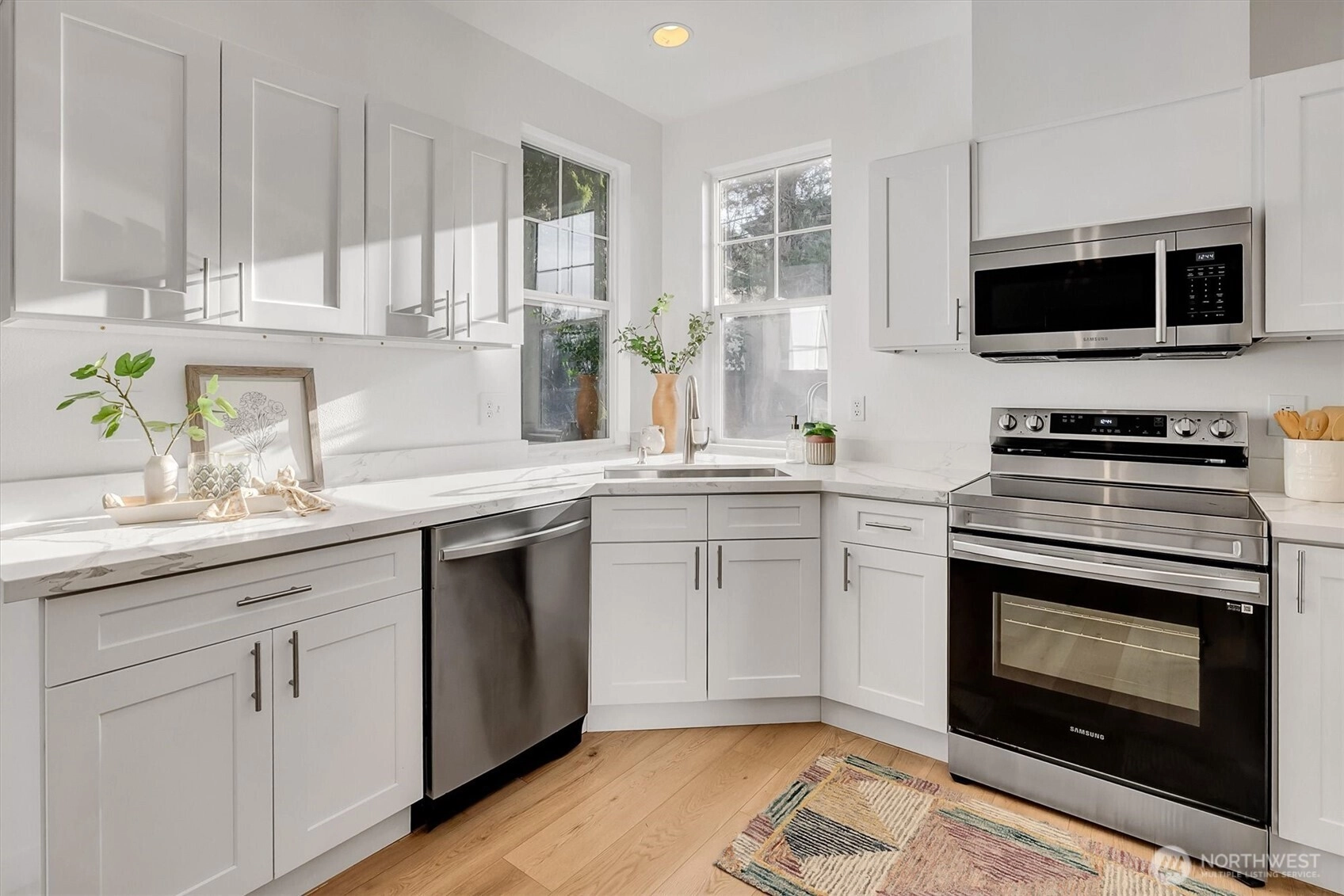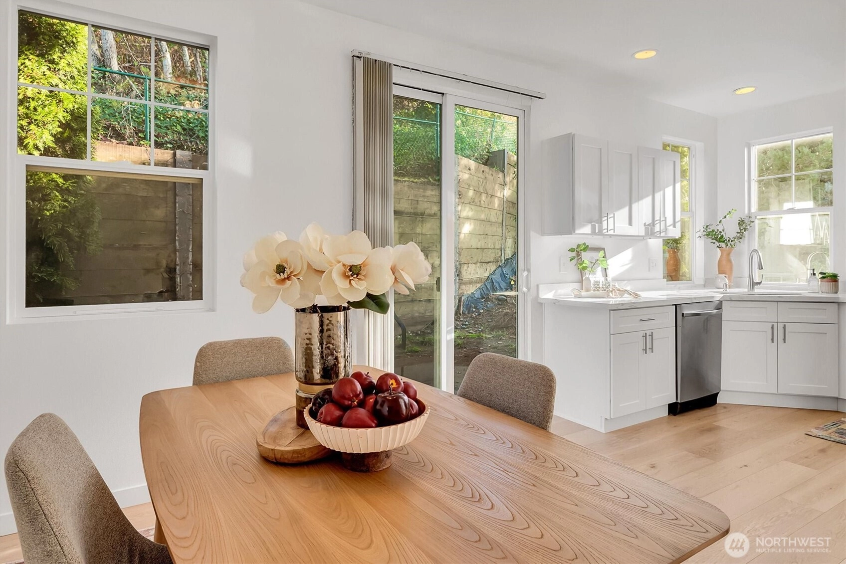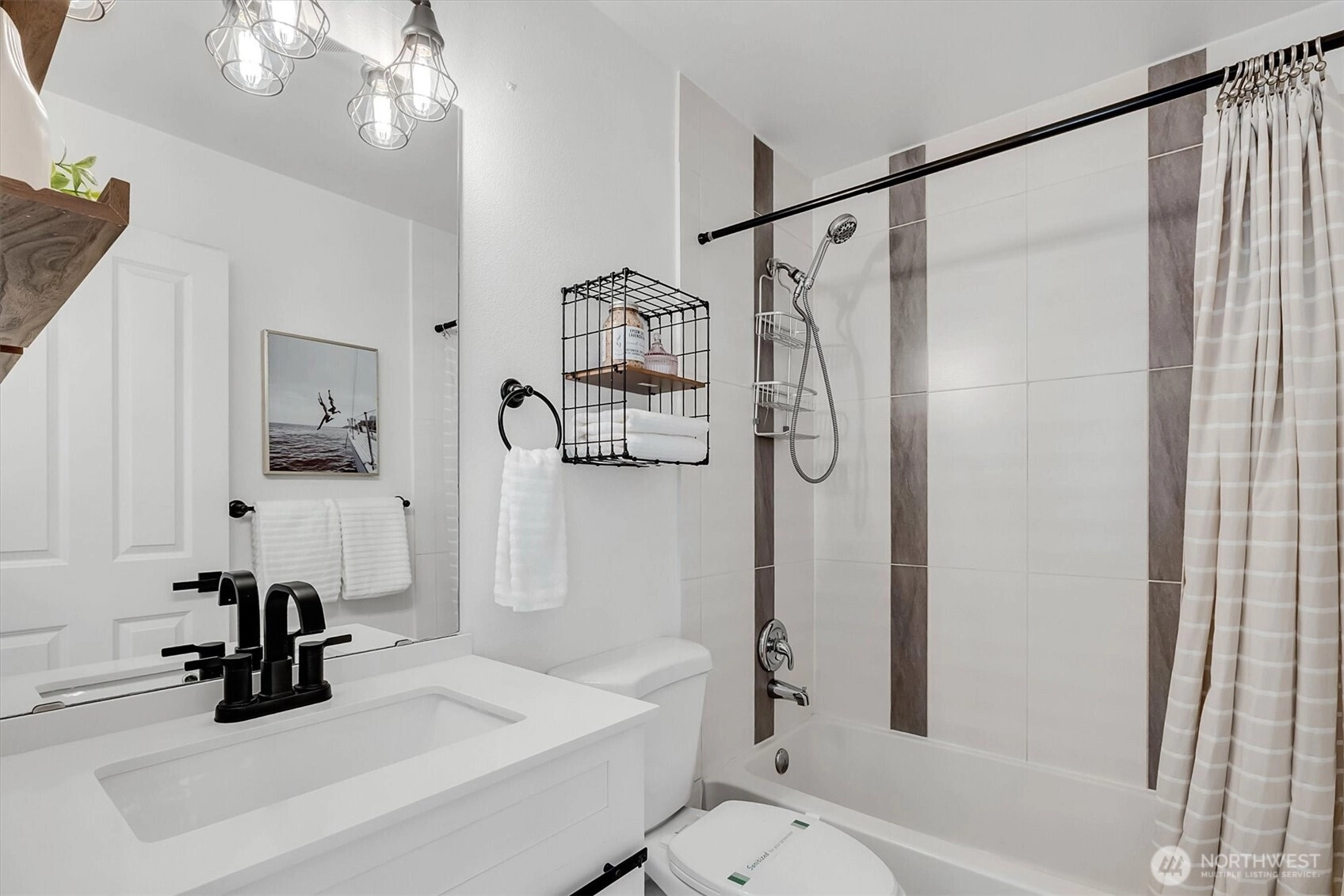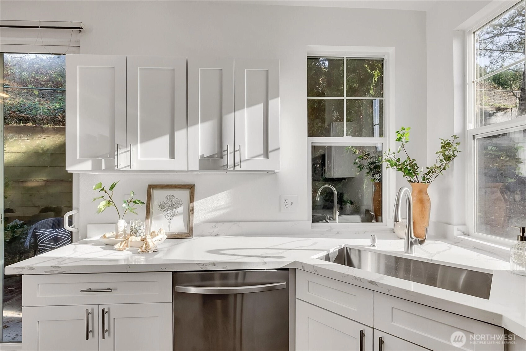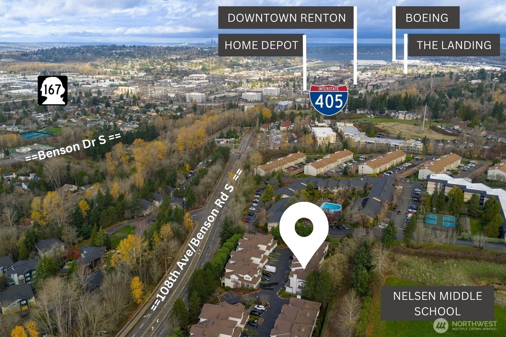 Welcome to this beautifully updated end-unit townhome with stylish finishes thru-out! The refreshed kitchen shines w/new white shaker cabinets & sleek quartz countertops, a sunny nook that opens to a private patio. The bright living room features newly installed LVP flooring, a cozy gas fireplace & expansive windows that frame stunning sunset views. 3 bedrooms in upstairs including a generous primary suite w/a walk-in closet & an updated bathroom. A refreshed full guest bath. Don't miss the spacious bonus room in basement! A gas HVAC, a side-by-side 2 car garage w/extra storage. Located in a quiet, convenient community close to shopping, I-405, Valley Medical Center, The Landing & Sea-Tac Airport. Enjoy nearby guest parking. No rental cap!