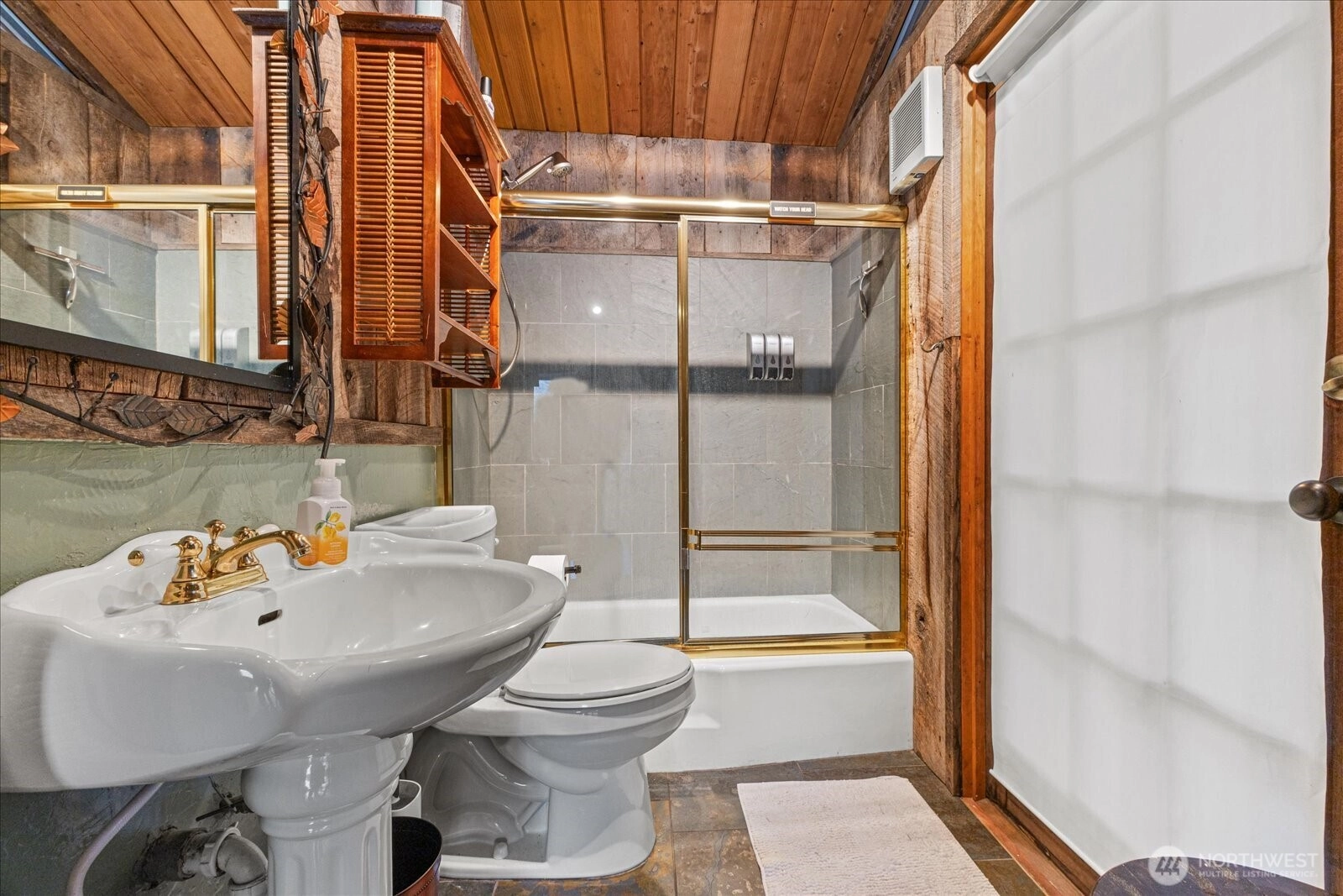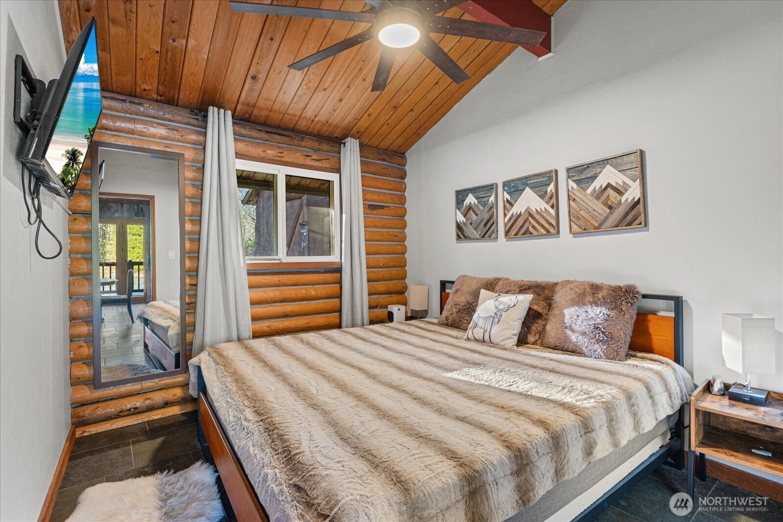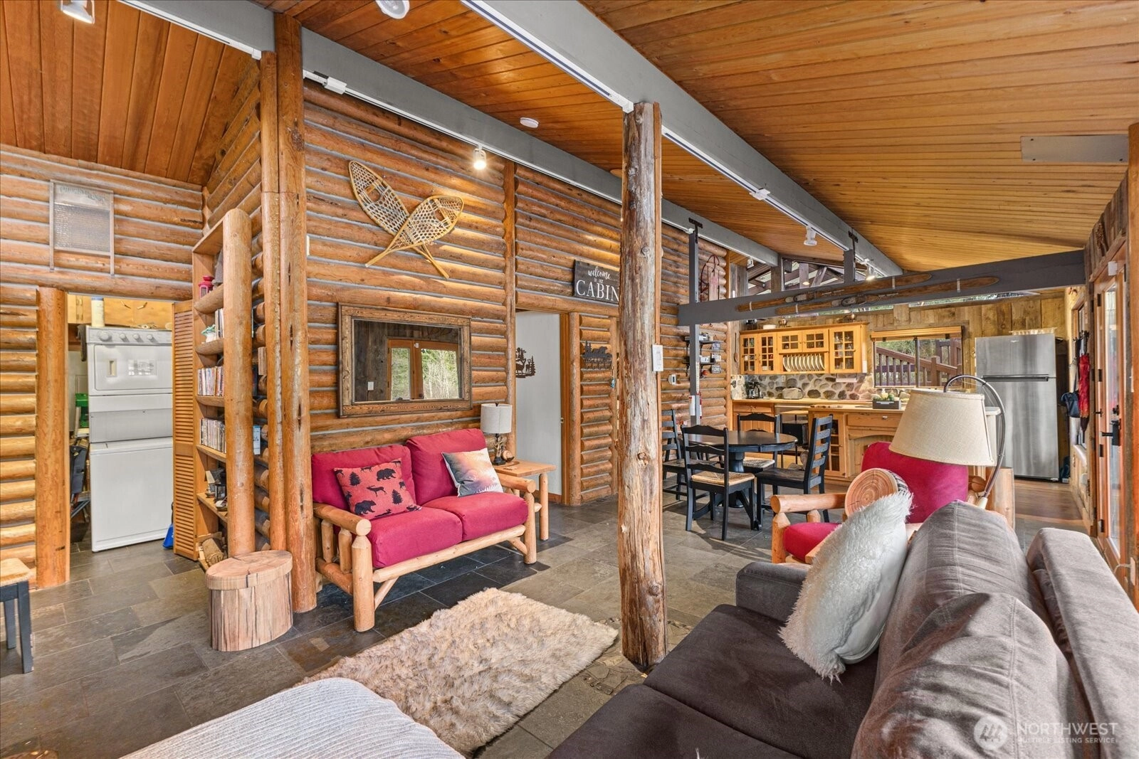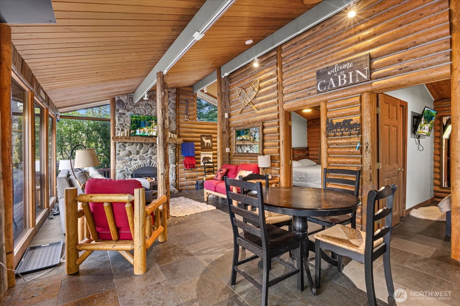Skykomish Riverfront GEM on 2 lots. Riverfront cabin with full-length windows, high-bank setting, and wraparound deck with sweeping Skykomish views. Excellent for gatherings, outdoor dining, and year-round recreation. Interior features Okanogan Valley barn wood, split-log accents, slate and river rock finishes, plus a striking river rock fireplace. Kitchen offers pine cabinets, slate counters, and a cook island with glass shelving. Full bath with French doors to hot-tub deck—enjoy river views from your private spa. Property includes a SECOND lot with RV access, storage shed, and paths to the riverbank. Direct river access for steelhead fishing, rafting, kayaking, swimming, and proximity to Stevens Pass. Is a short term rental w/Vacasa.