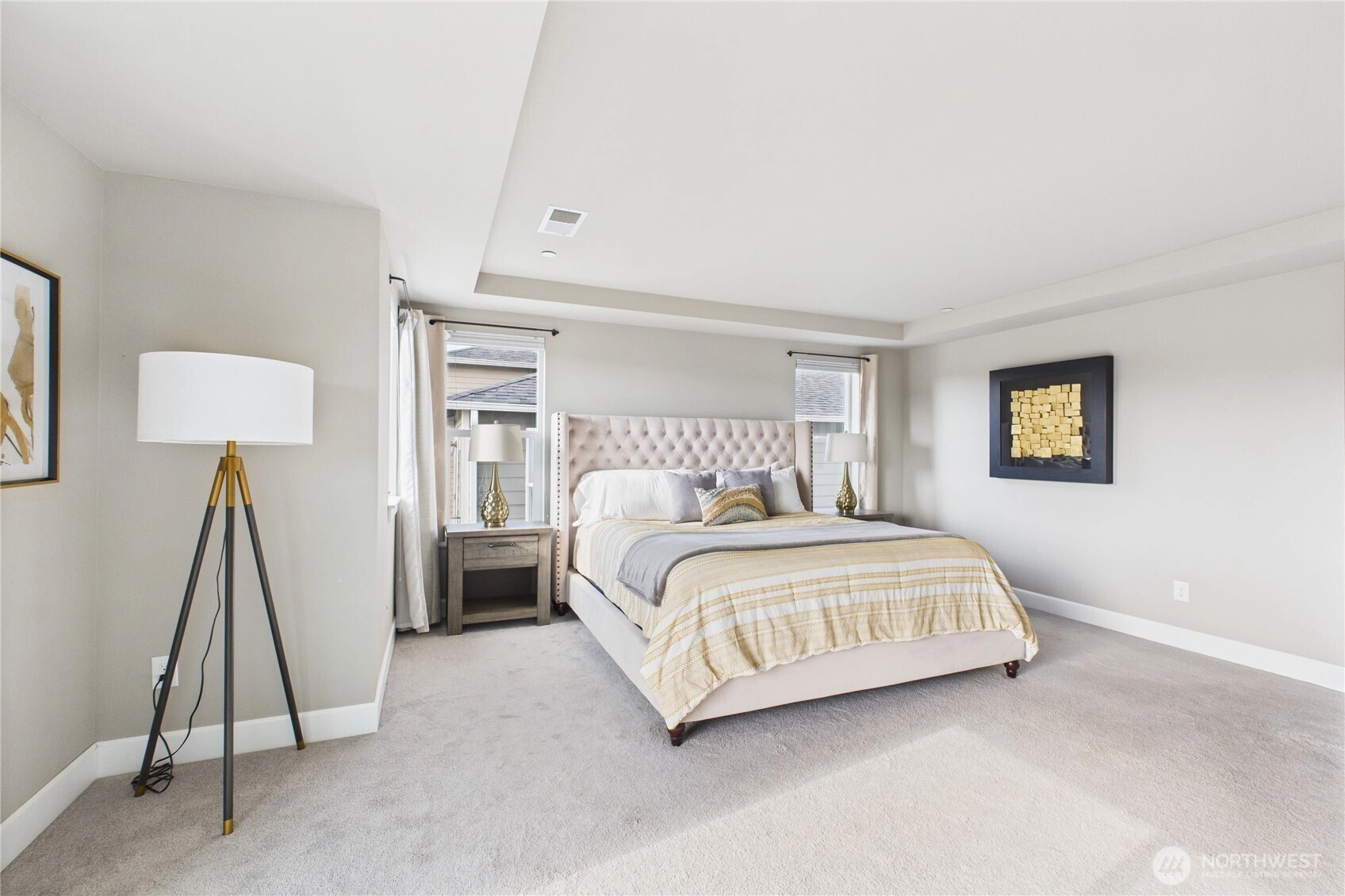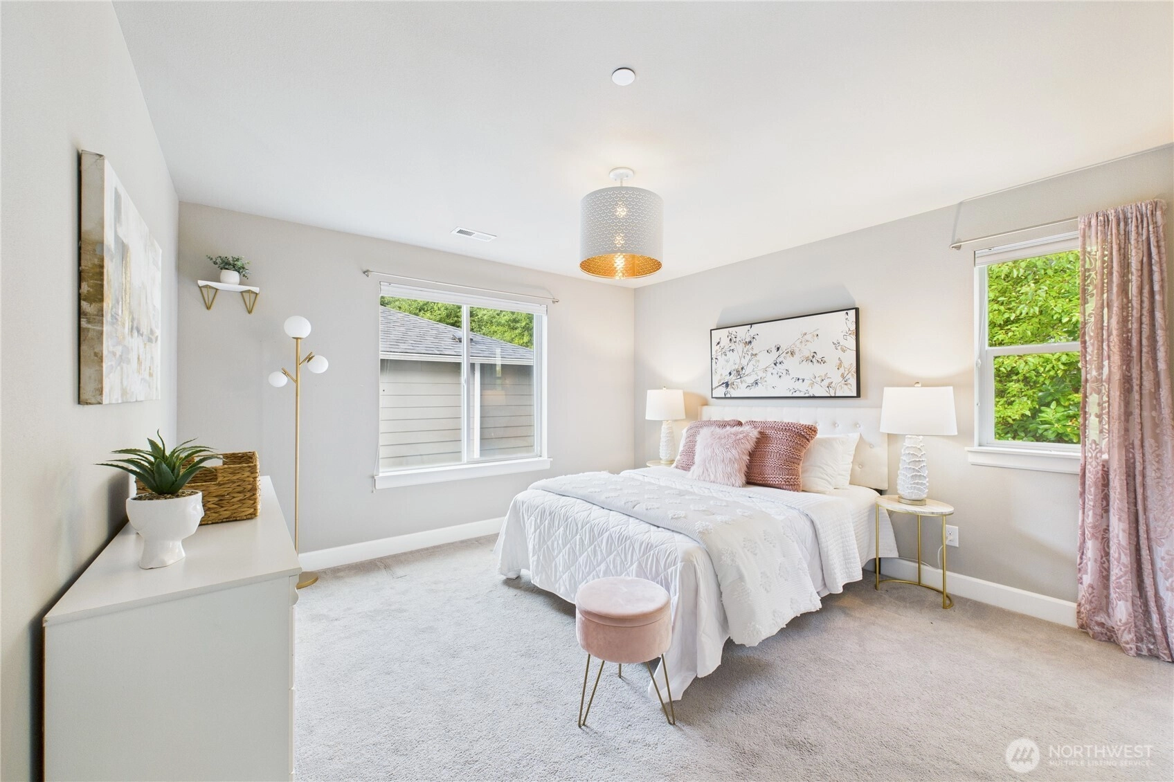This light-filled 4-bedroom, 2.5-bath home blends comfort and everyday elegance. The open great room connects seamlessly to a chef-inspired kitchen featuring an oversized quartz island, stainless steel appliances, gas range, and walk-in pantry—perfect for hosting or daily living. A main-level bedroom or office with French doors adds flexibility. Upstairs, the spacious primary suite offers a large walk-in closet, recessed ceiling, and spa-style bath, along with two additional bedrooms, a full bath, and a generous loft ideal for a media room or flex space. Enjoy a landscaped backyard with patio, a 2-car garage, and central A/C. Close to parks, trails, top-rated schools, and easy access to Seattle and the Eastside.