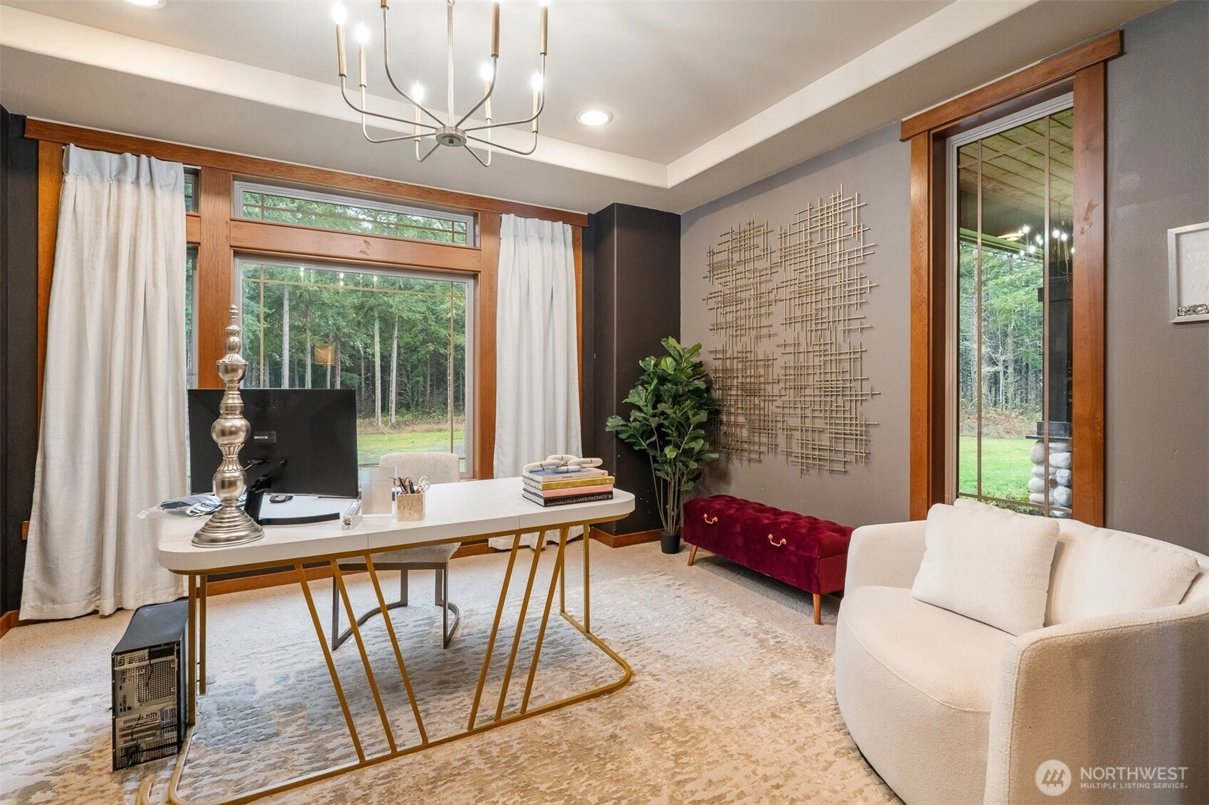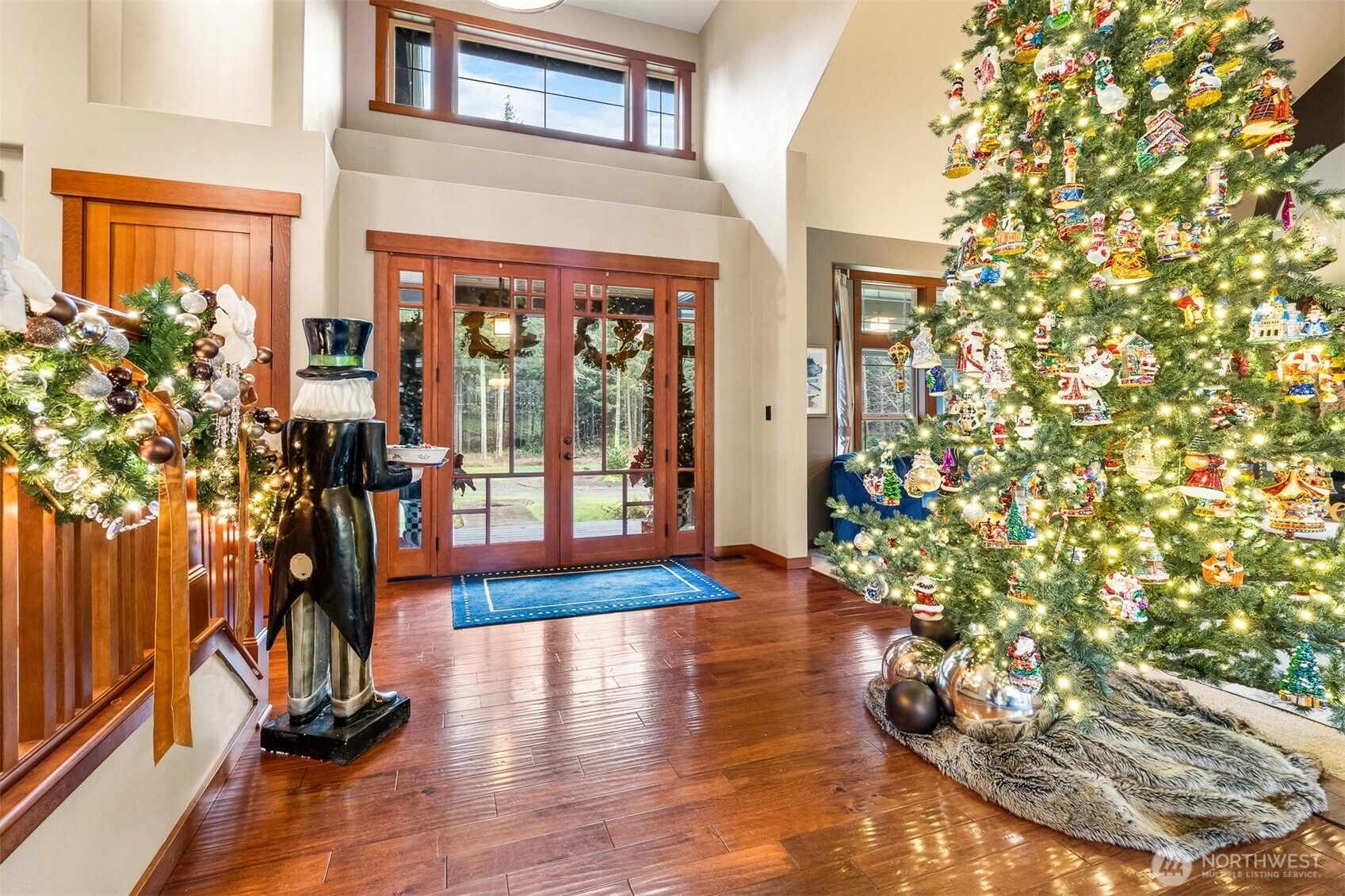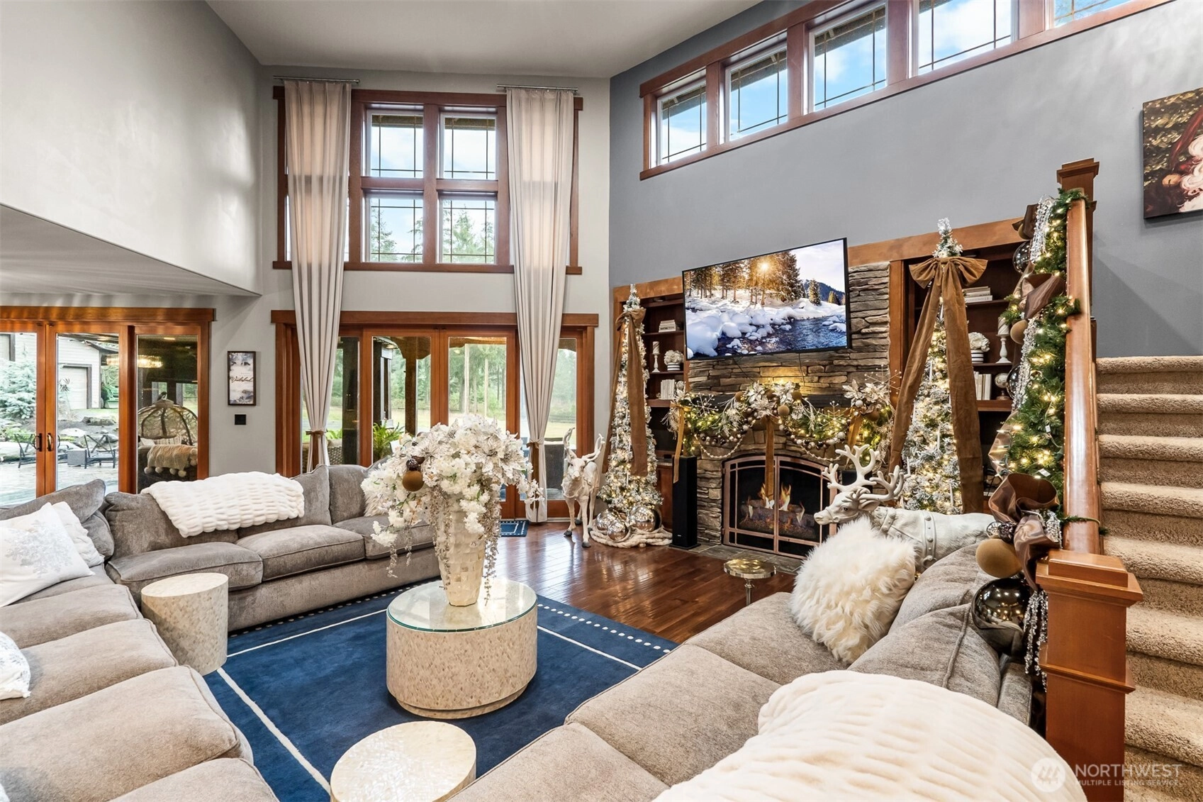 This extraordinary estate blends luxury, privacy, and thoughtful design. Enter through grand 8-foot French doors into an open-concept layout with soaring 22-foot ceilings and oversized windows that flood the home with natural light. Nearly 5,000 sq ft of living space includes a gourmet kitchen and ensuite baths for every bedroom. Starlink internet supports seamless work-from-home living, while a Kohler automatic power system offers peace of mind. Take in sweeping Mt. Rainier views, unwind in the saltwater hot tub, and enjoy the calming sounds of a private waterfall. Set on 20 private acres with a shop/barn, offering serene seclusion with a convenient commute to JBLM and Pierce County amenities. Showings welcome, Buyers have 2 day bump.