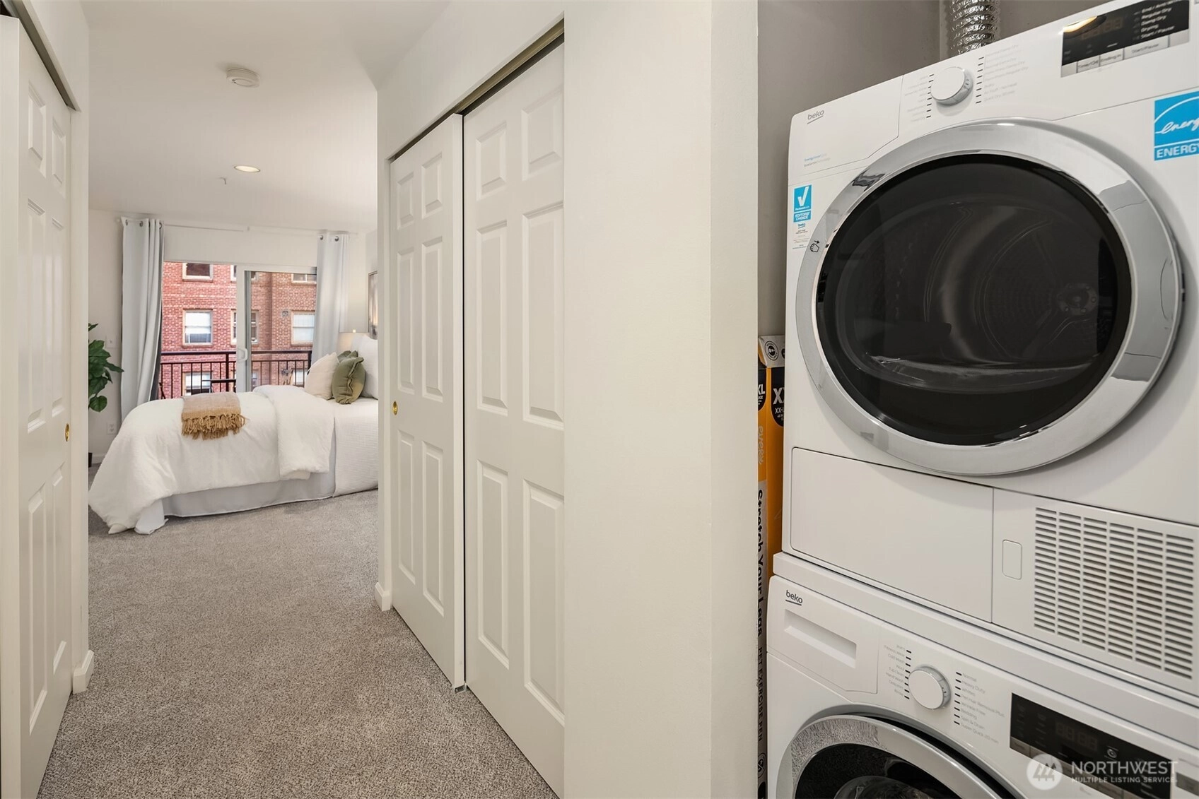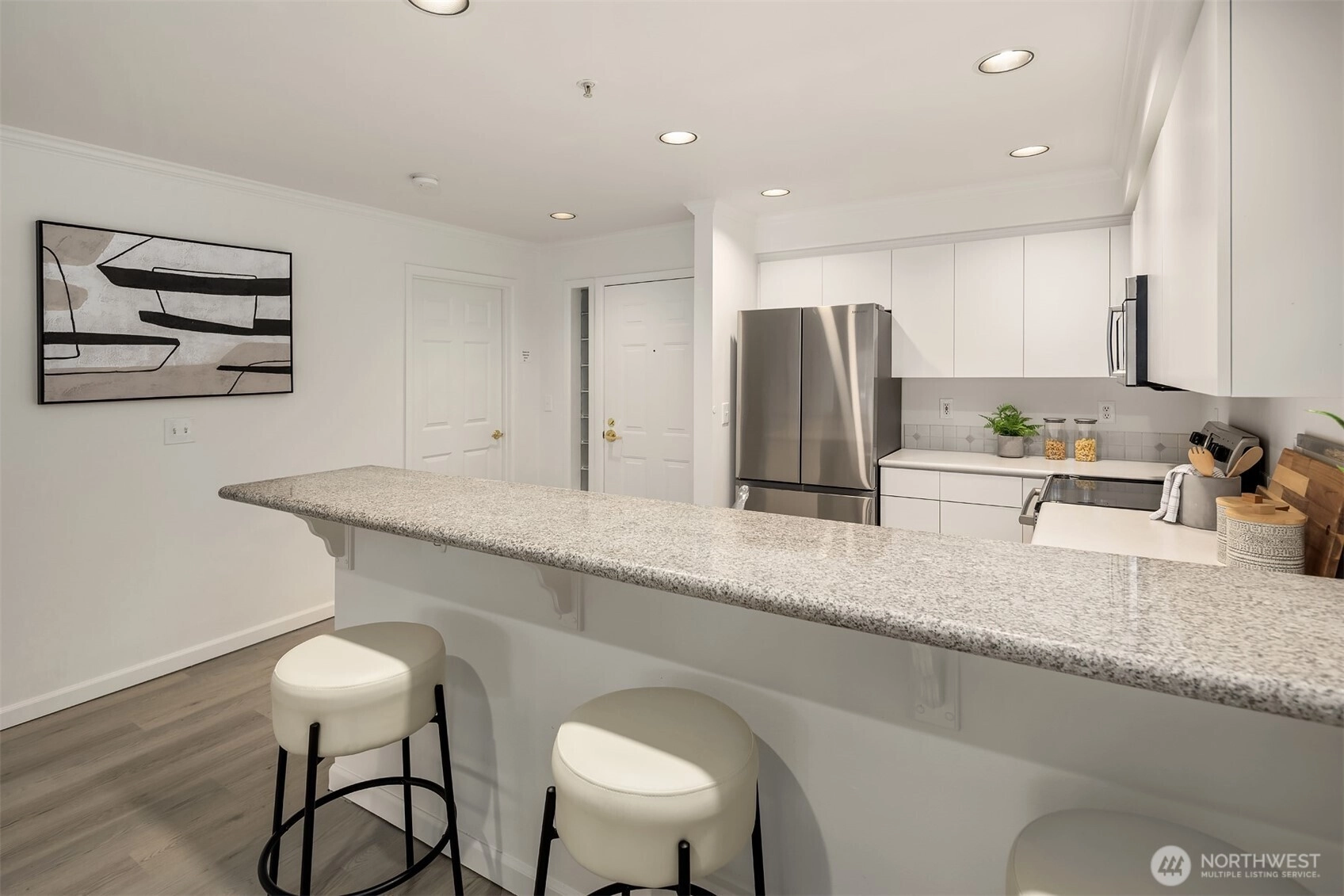 Turnkey one bedroom condominium on the top of Queen Anne Hill in Galer Gardens. Featuring a great room, suite with dual closets, new carpet, new paint, some new fixtures and new hardware, this unit has been refreshed and sits ready and waiting for your life atop this historic part of Seattle. All rooms - great room, suite, kitchen and bathroom - are spacious and open. Condo comes with one deeded parking space in a gated/secured garage, a full approx. 3 x 7' storage unit, a private balcony and a rooftop deck that is one of the highest in Queen Anne. Easily walkable to idyllic dining, socializing and shopping, or venture just down the hill to Climate Pledge Arena. Due to lobby access, showings must occur during business hours.