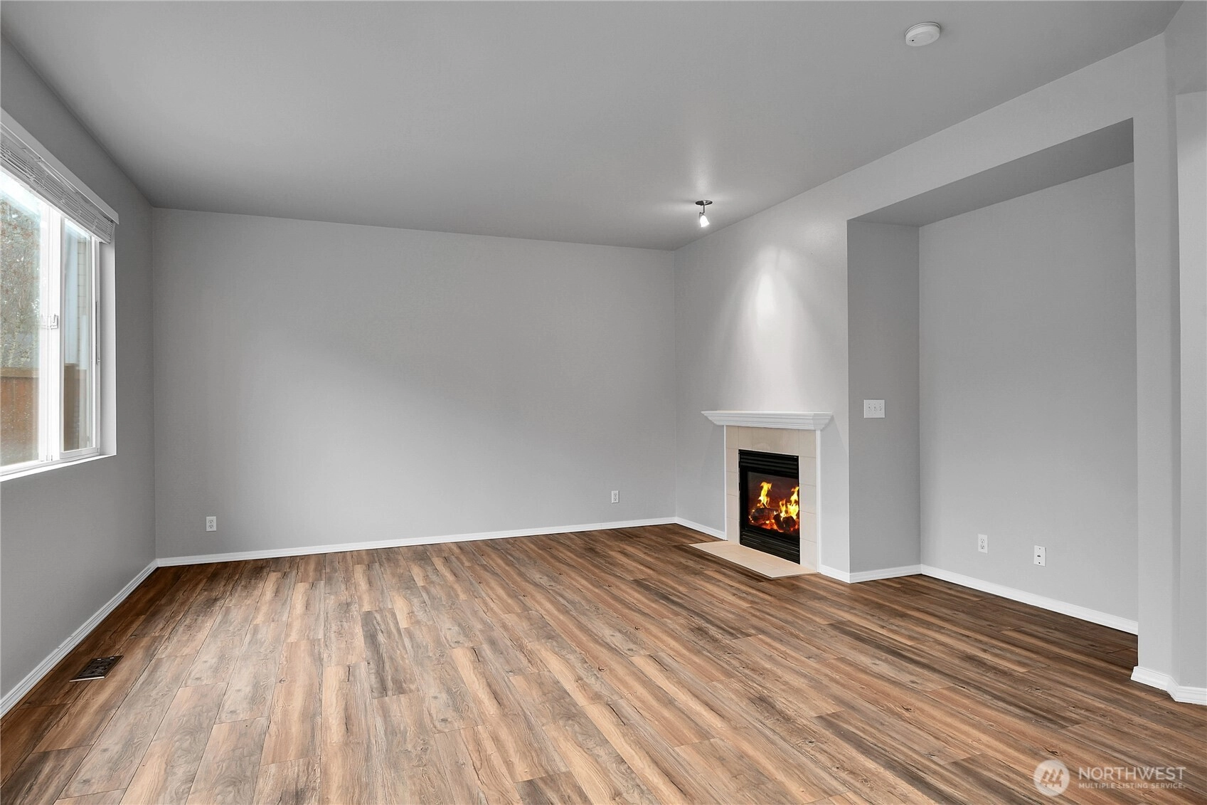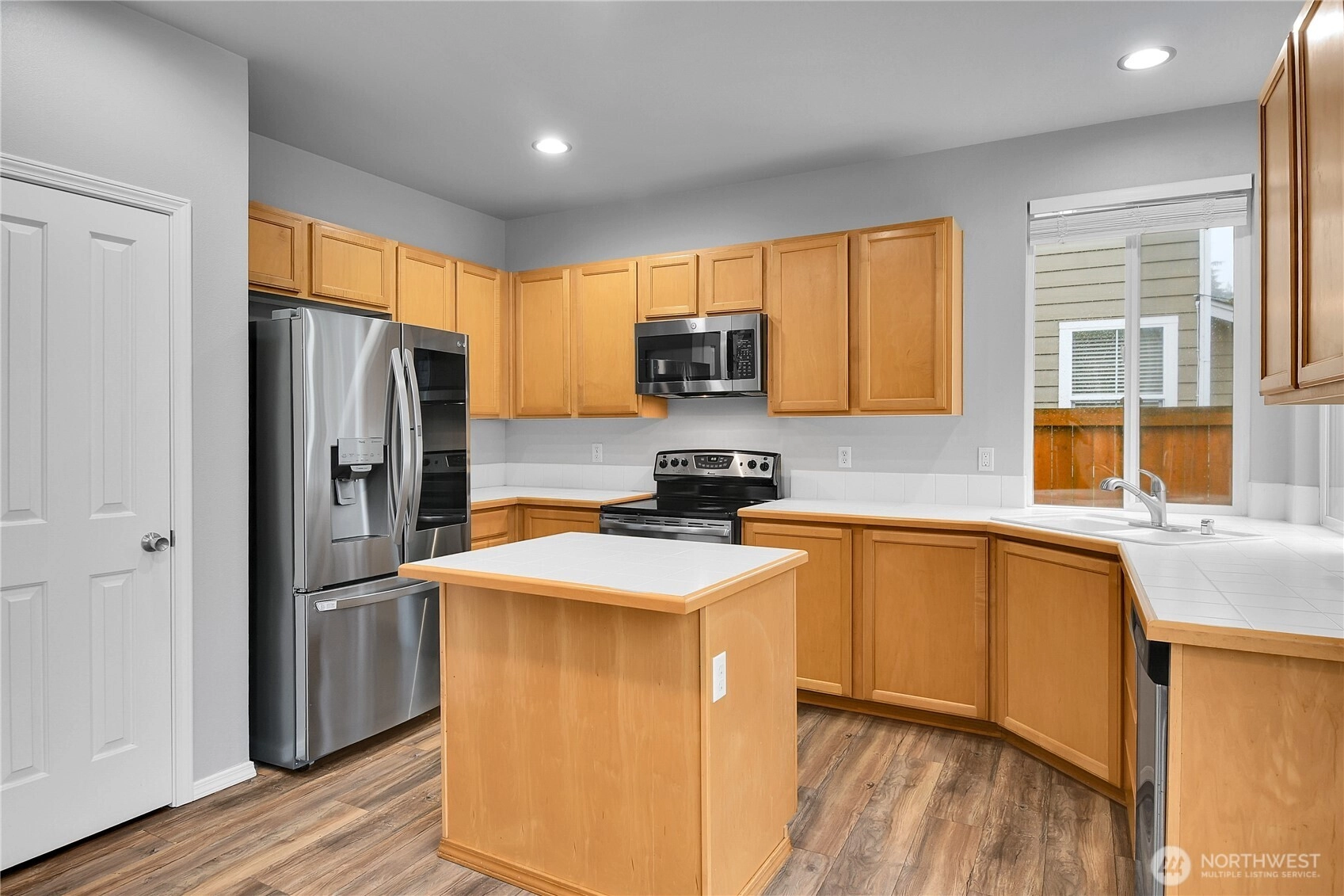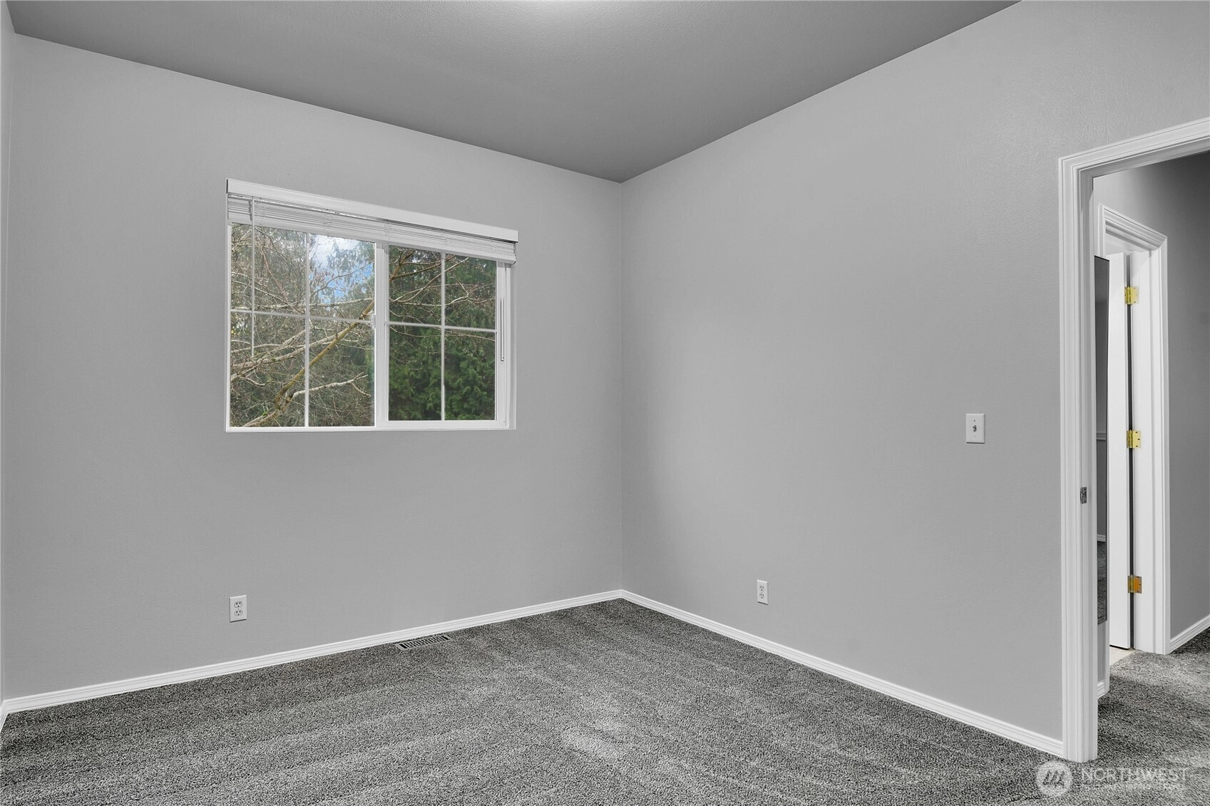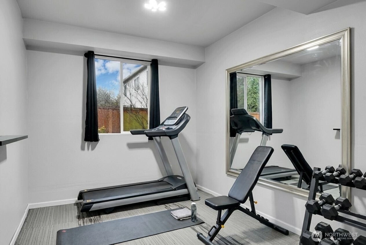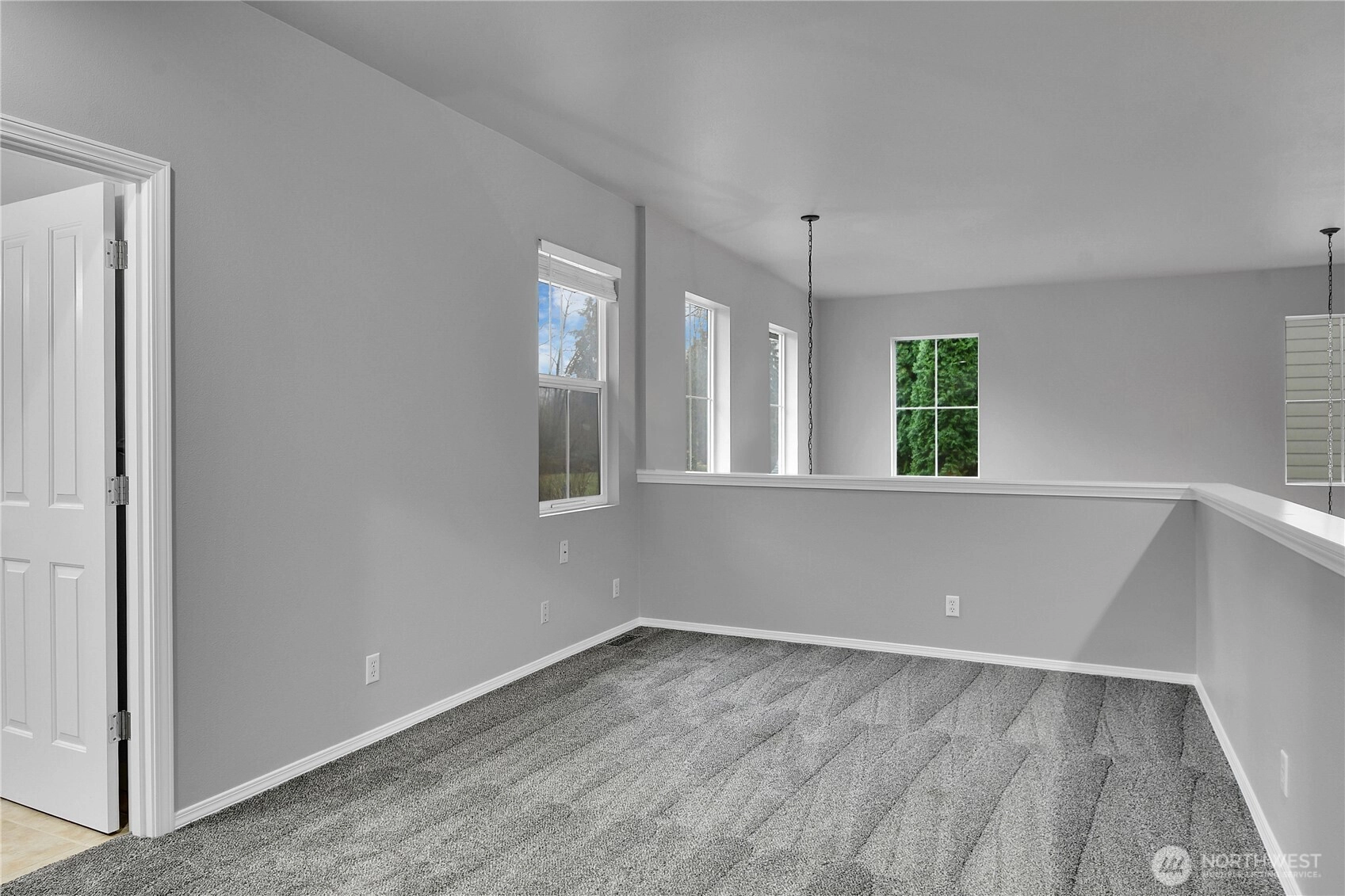 This home is on a quiet street across from acres of green space. The living room boasts soaring ceilings & windows to keep the home airy and bright. Updated LVP flooring spans entire 1st floor! Enjoy stainless steel appliances in the kitchen, gas fireplace in the family room, & slider access to the backyard patio. Newer carpet throughout upper level. Large landing overlooks living room, perfect office or flex space! 3 bedrooms upstairs, including primary w/ 5-piece en-suite bathroom & walk in closet! Full hall bathroom on upper level. Workout room in back of garage. Heat pump for efficient heating and cooling! A sprawling neighborhood great for walks or trips to the park. Close proximity to schools, shopping, public transit, and freeways!