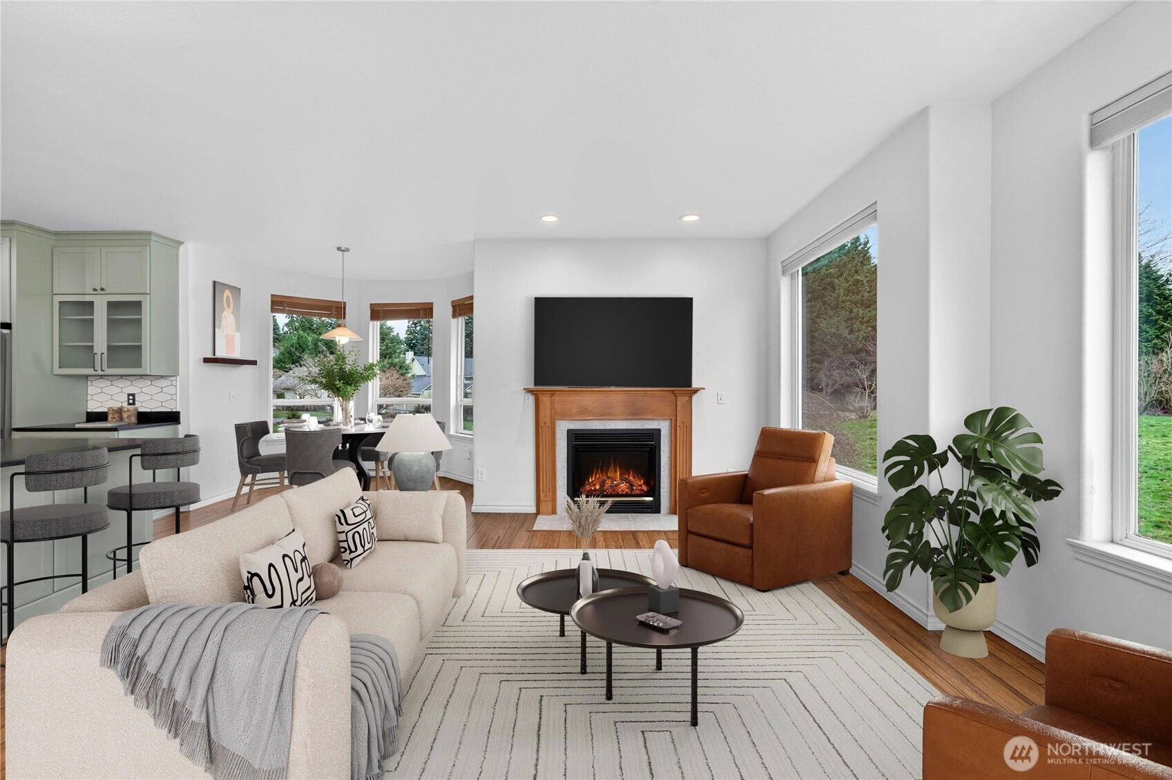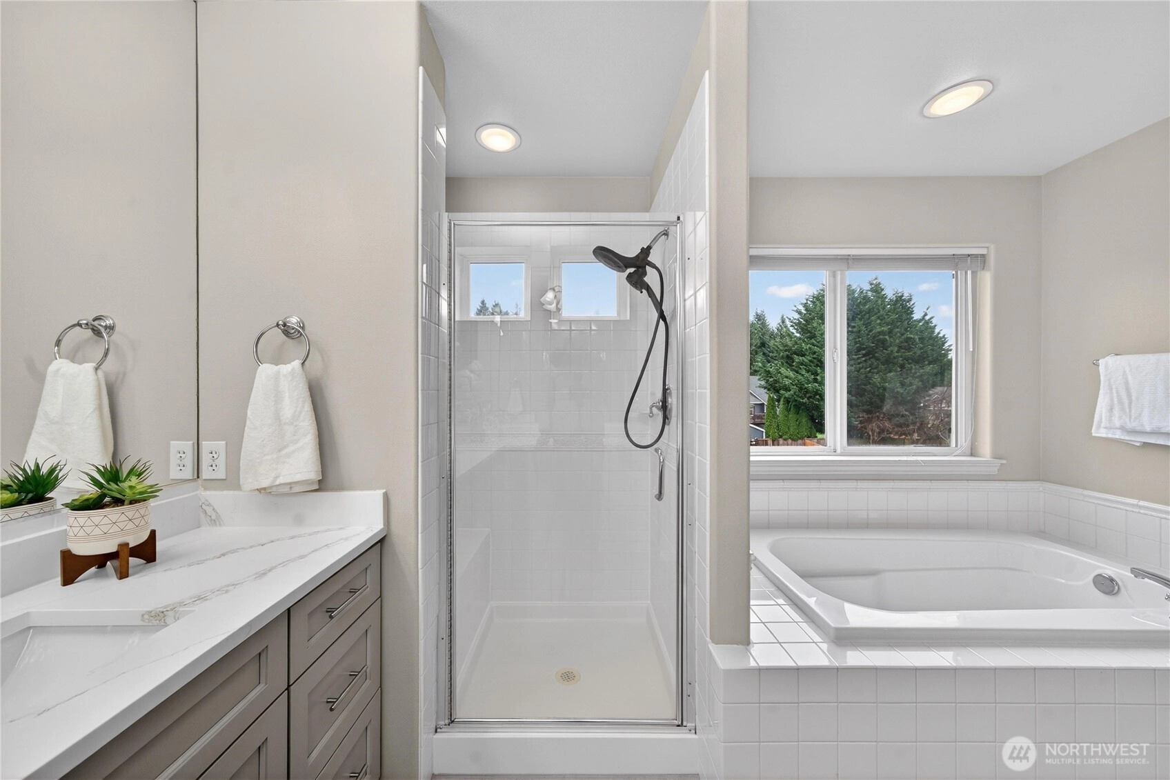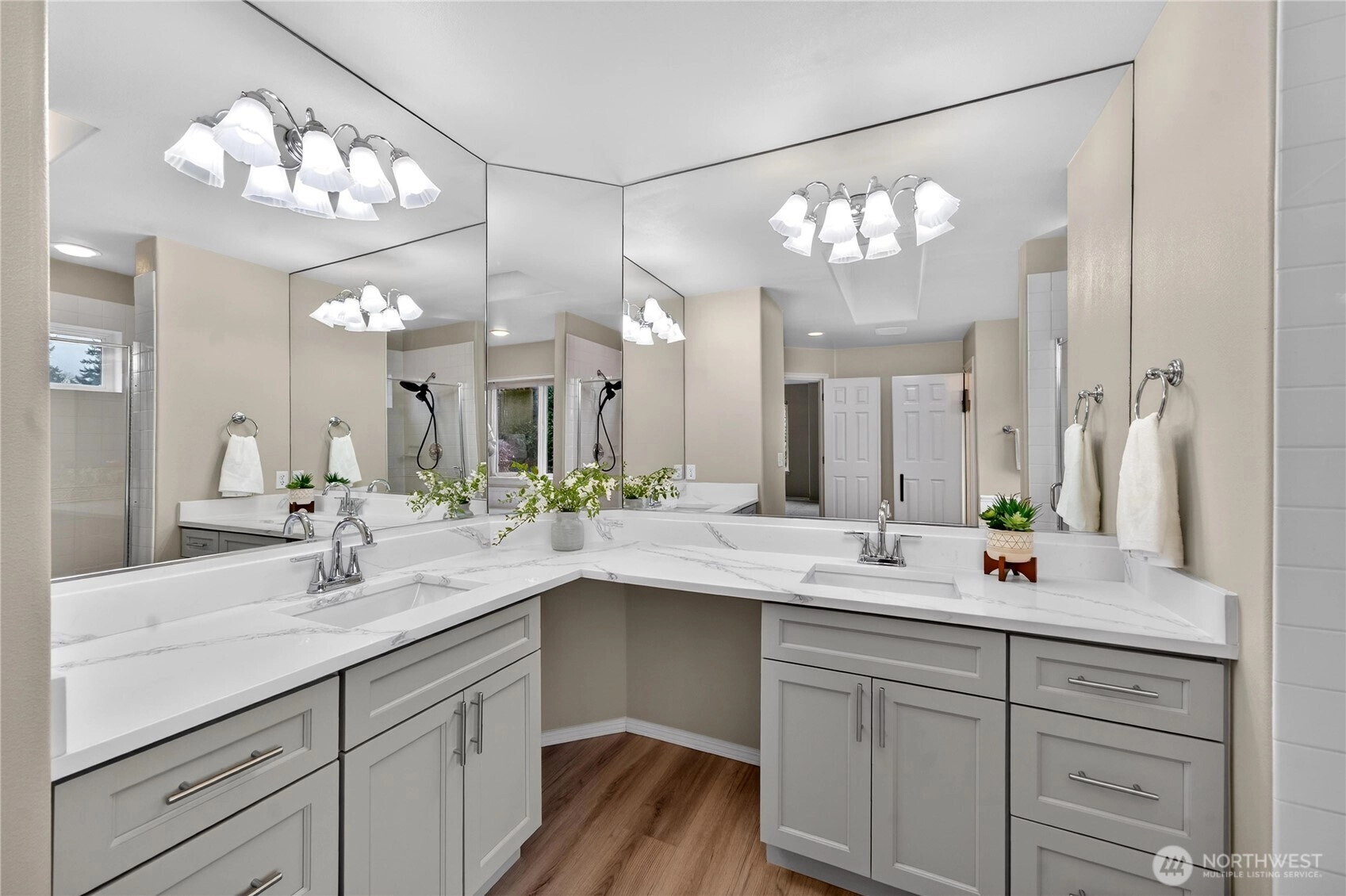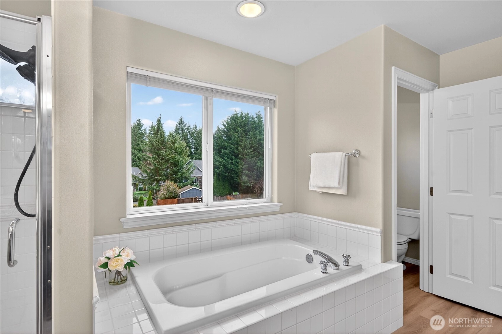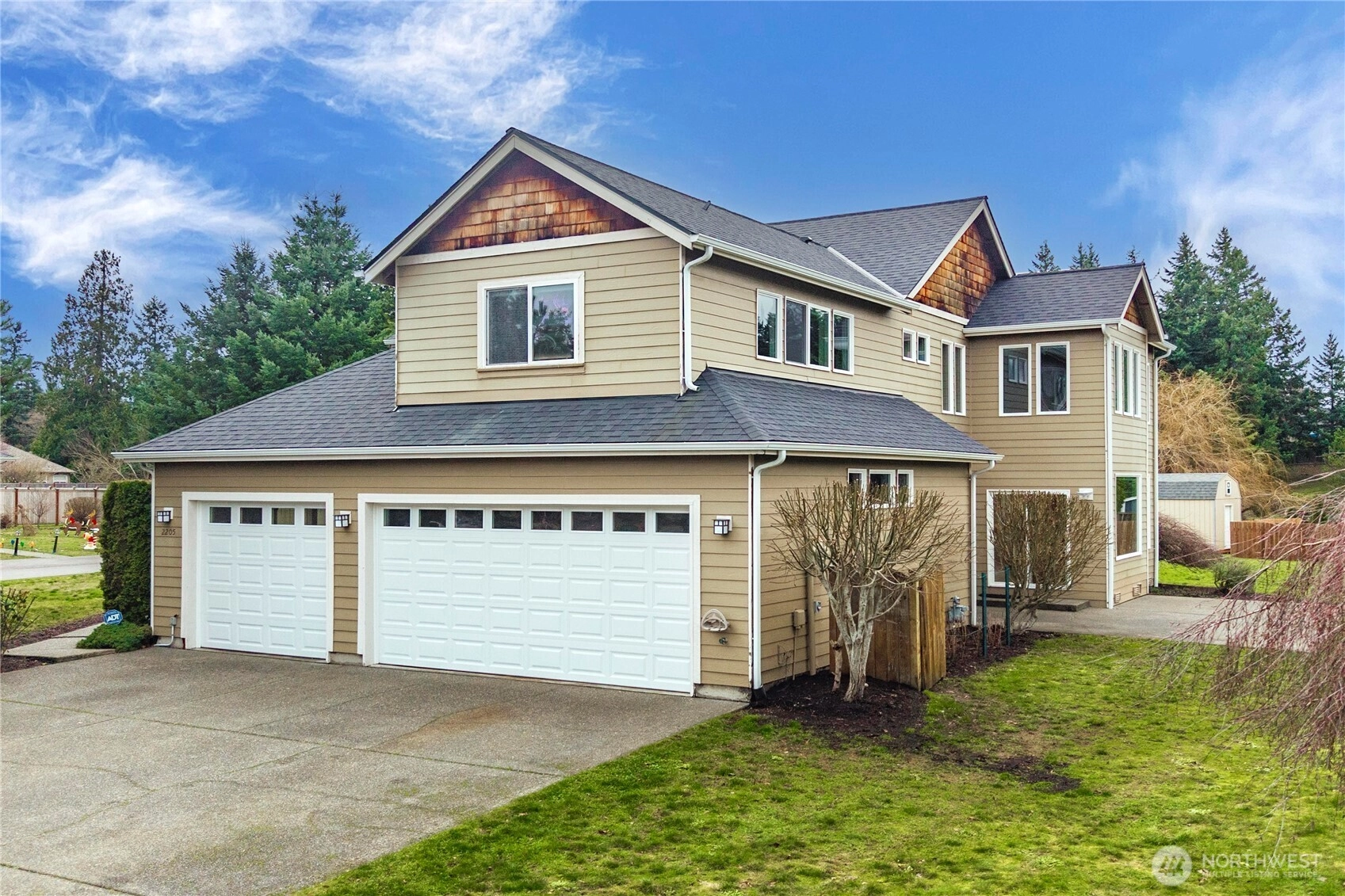 Welcome to Skyline Estates at Lake Tapps! Dieringer schools! This beautiful home sits on a rare, flat 0.78-acre corner lot in one of the area's most sought-after communities. Enjoy the charm of the covered front porch and bamboo floors on the main level. The remodeled kitchen offers soapstone counters, custom cabinetry, a 36" gas range, wall pantry, and oversized island - perfect for entertaining. Open-concept great room with gas fireplace and bay-window nook. Upstairs features a spacious bonus room and serene primary suite. Newer roof, water heater, A/C, carpet and custom blinds. 10x20 shop/shed, fenced garden, and fruit trees. Move right in!