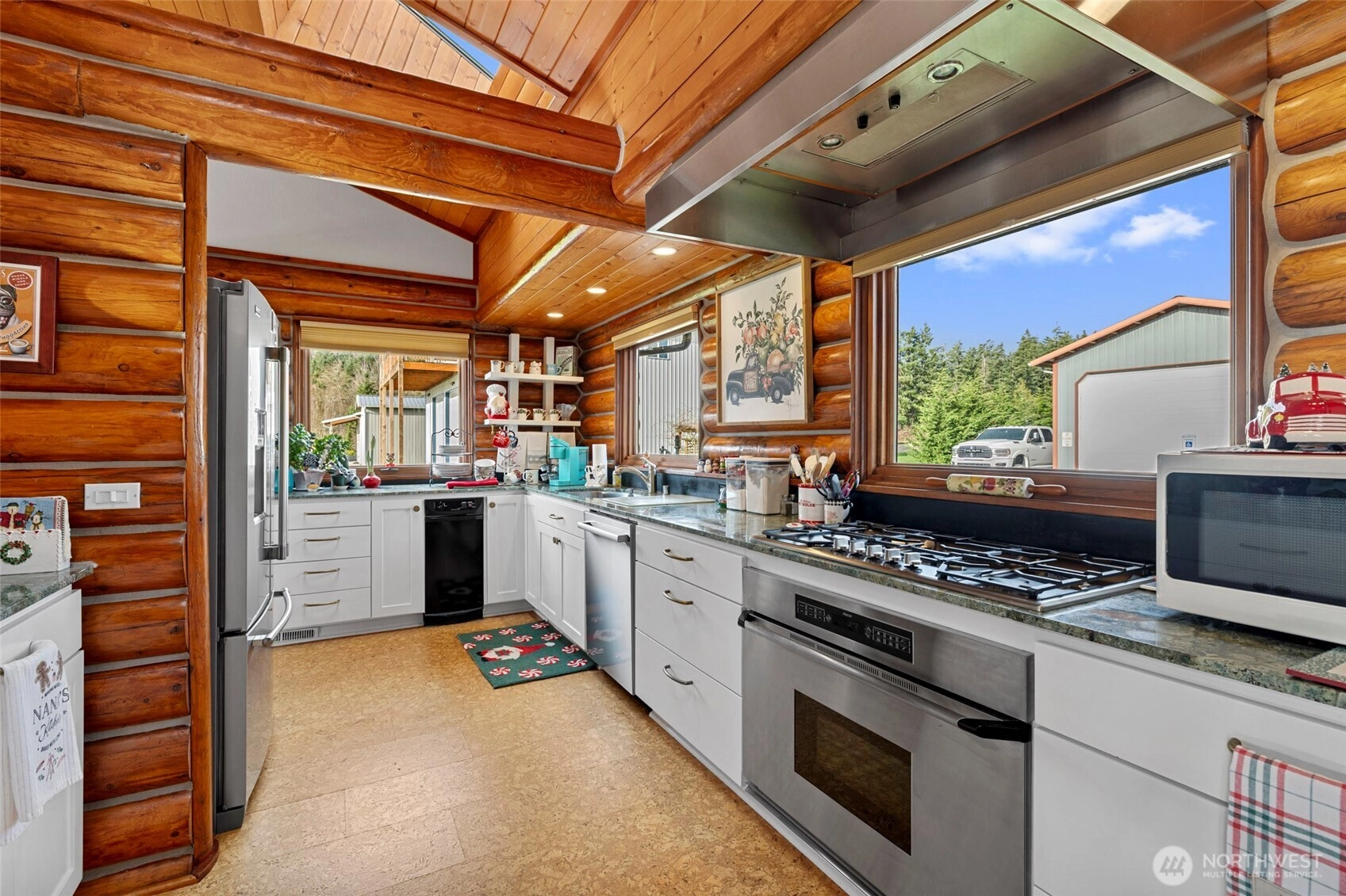 This stunning nostalgic log home was thoughtfully reconstructed in 2009 on Camano Island and features a portion of a larger home originally built on the Lake Washington in 1949. Beautiful views of Port Susan and breathtaking sunrises. Unbelievable attention to detail shines throughout.The home offers 2 bedrooms and a ¾ bath, a gourmet chef’s kitchen with a butler’s pantry, gorgeous cork floors, a striking rock fireplace, and riverbed granite countertops. Enjoy indoor-outdoor living with a full-length covered deck, patio, and garden space.Additional features include a detached shop/garage with gym and guest room, RV parking with dump and electrical hookup, and a fantastic location close to numerous amenities.