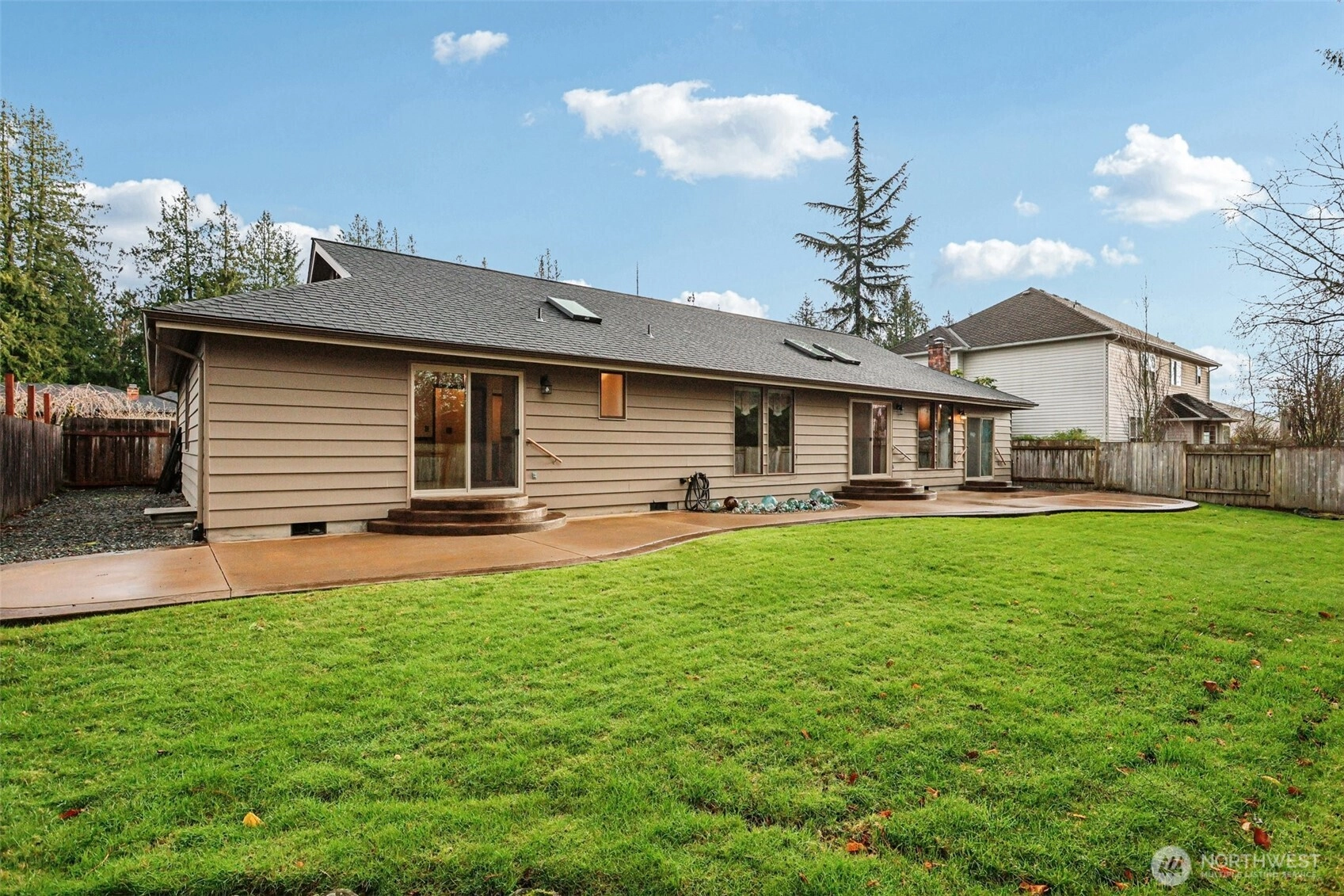 4-bed single-family home in Burlington located in Skagit Golf & Country Club. This solid 2,227 sq ft rambler sits on a quiet, fully fenced 9,583 sq ft lot with a full-width patio and private backyard. A brand new Trex front deck adds great curb appeal and easy care. Inside, the home offers a classic layout: formal living and dining rooms, a skylit kitchen with pantry, built-in desk, and sunny and large breakfast space. The cozy family room includes gas fireplace and built-ins. The spacious primary suite has patio access and ensuite bathroom. Laundry room off family room, plus another bathroom. Updates include new carpet, new garage door, and central AC. 2-car garage and easy access to Hwy 20, I-5, and local shopping. No HOA.