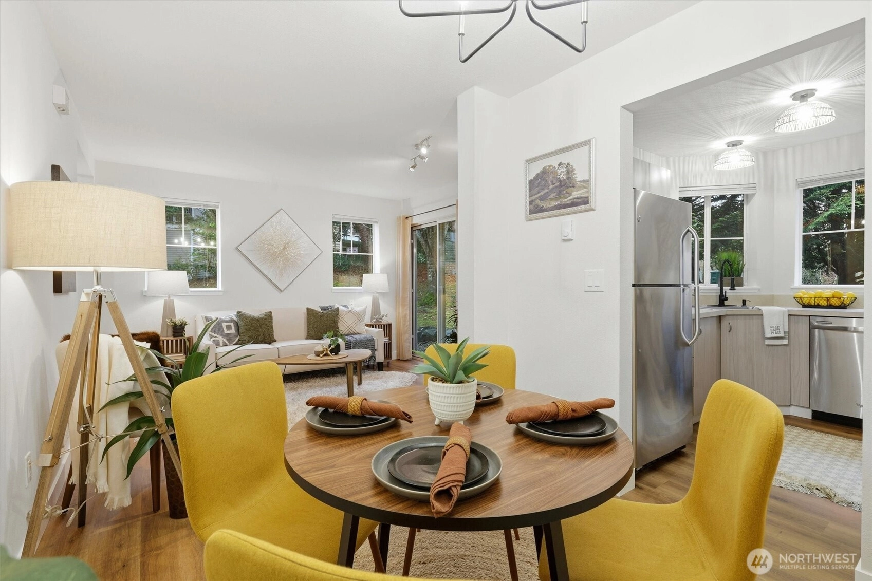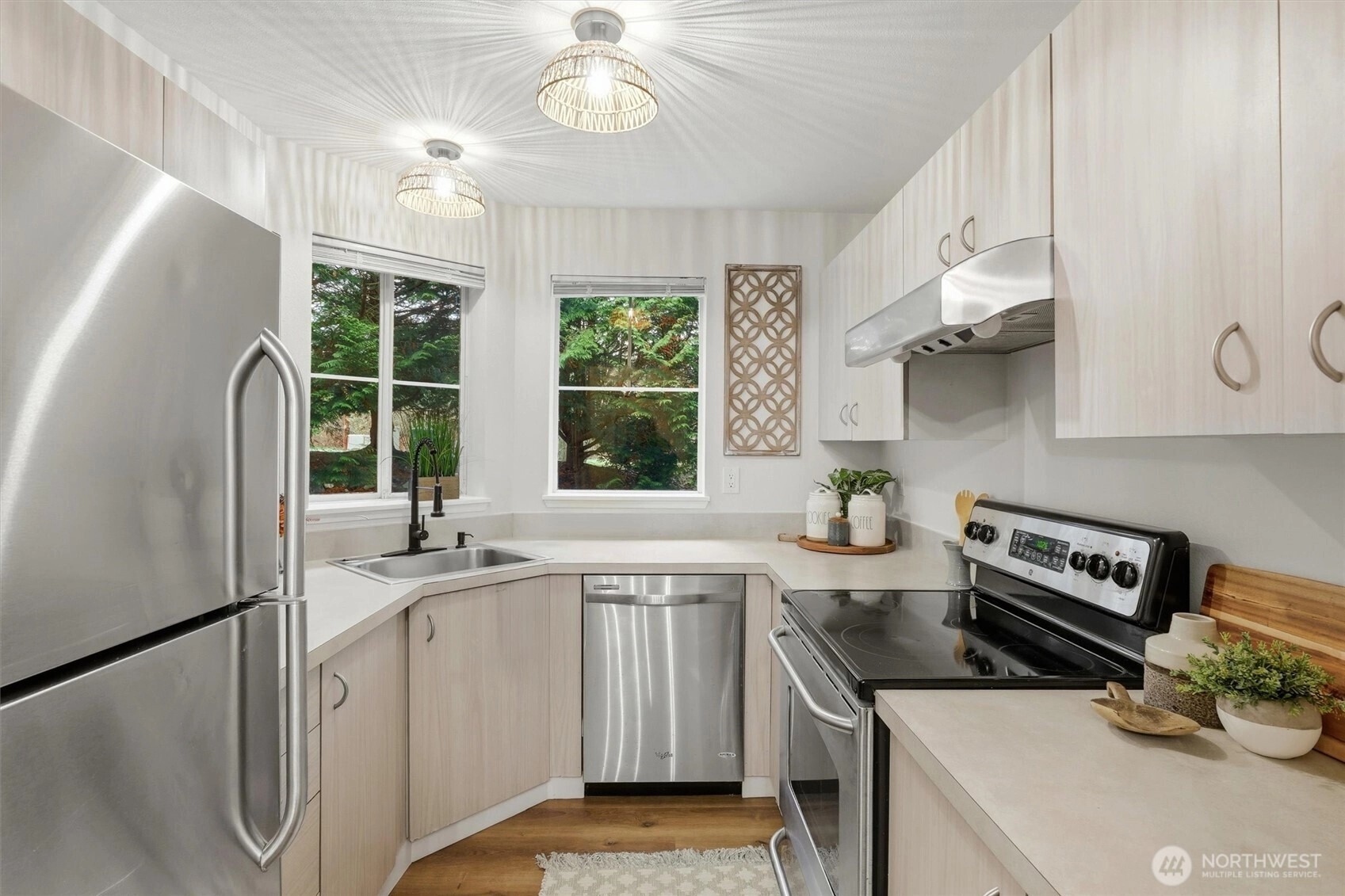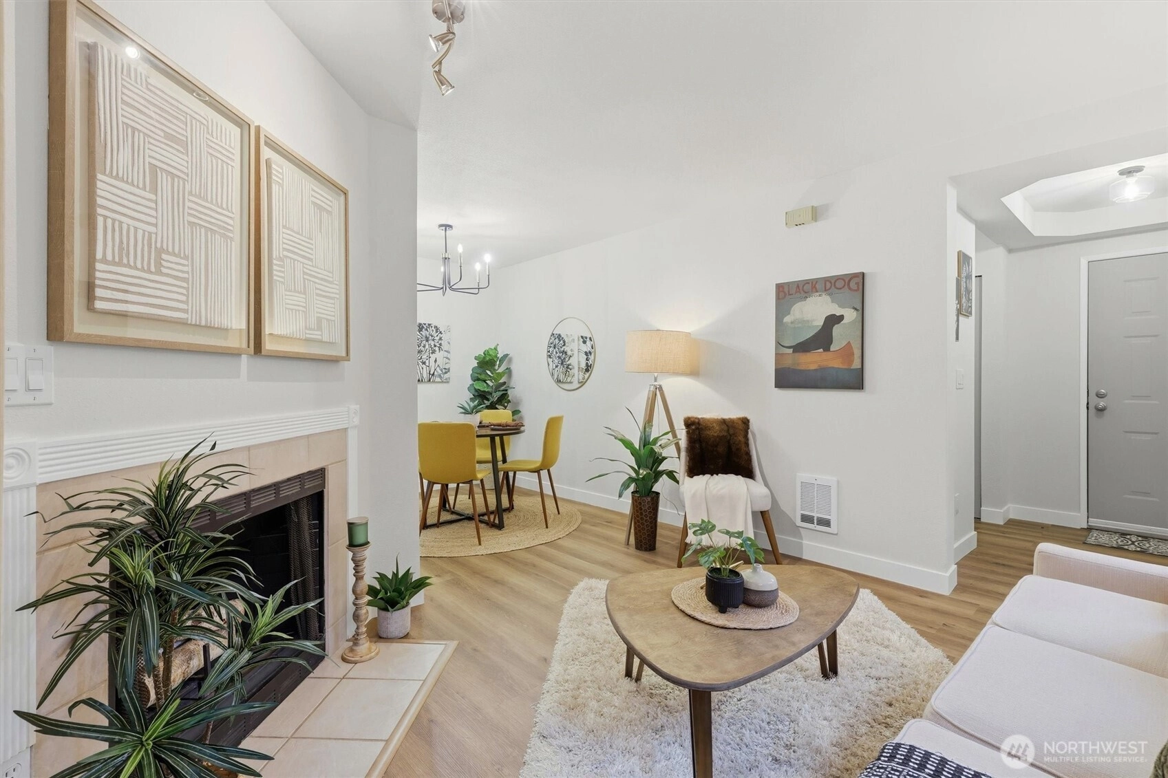 Start the New Year in style with this beautifully updated, end-unit condo! Enjoy brand-new LVP flooring throughout (no carpet), fresh paint, and designer lighting – it’s truly move-in ready! The inviting living room features a cozy wood-burning fireplace, sliding doors to a covered patio, and serene views of lush outdoor trees. Your bright kitchen offers stainless steel appliances, ample counter space, and flows seamlessly into the dining area. Down the hall, discover a full-size laundry area, storage closet, spacious bedroom, and bathroom. Additional perks include two parking spaces, an outdoor pool, and a prime location near shopping, dining, and Mukilteo Beach Park. So don't wait! Come experience the charm of the Hamptons today!