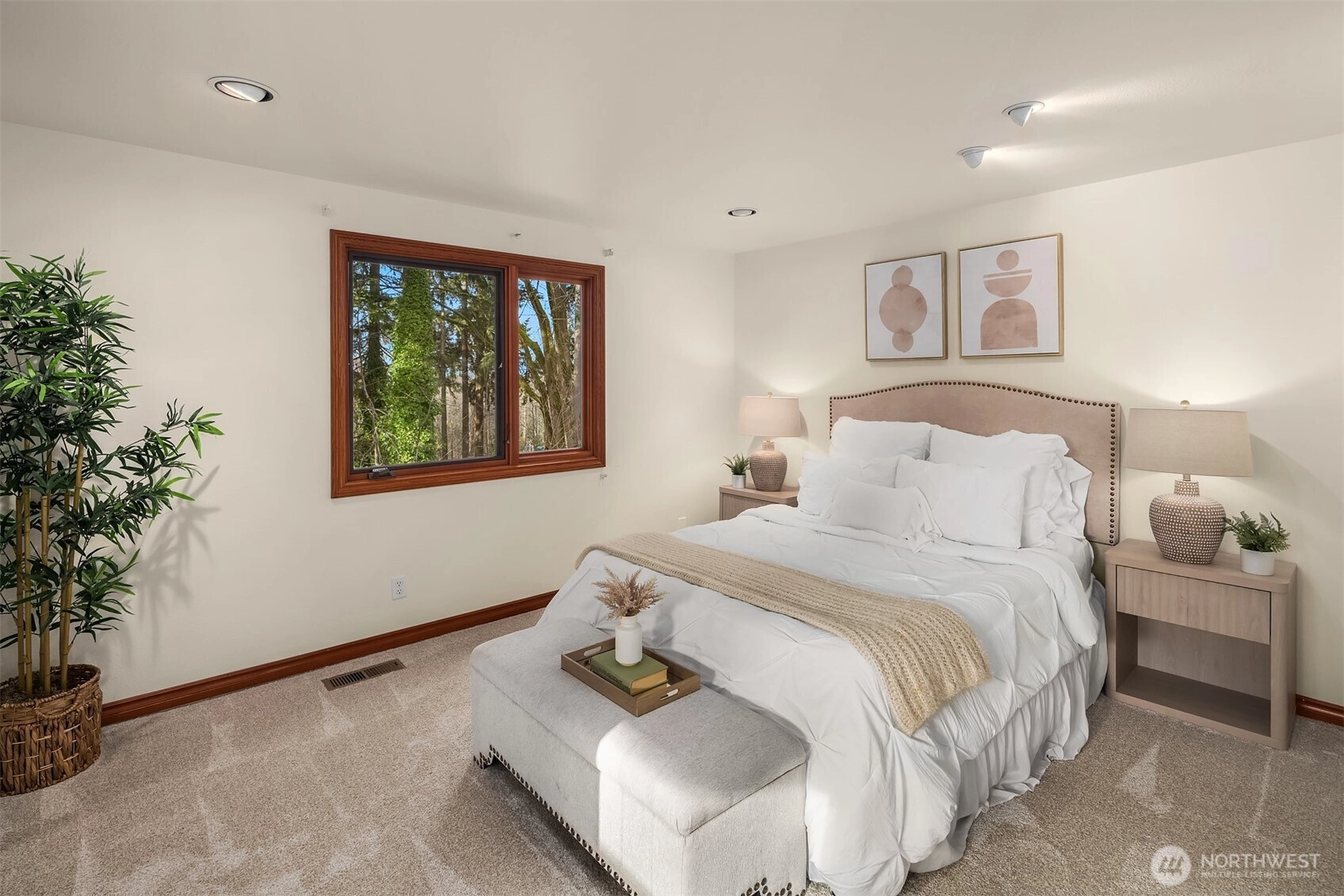 Attractive and thoughtfully updated, this home backs to a serene forest and community park, offering both privacy and natural beauty. 2025 updates including a new roof, freshly painted deck, new interior paint, and updated flooring—luxury vinyl plank in the main living areas and new carpet in the bedrooms. The kitchen offers ample cabinetry and a cozy breakfast nook, making everyday living easy and comfortable. The primary bedroom includes a walk-in closet and an updated ensuite bathroom. The generous lower-level family room offers versatile space for media room, playroom, or home office. The garage w/dedicated shop area and built-in cabinets for additional storage. Conveniently located near schools, a library, shopping, and restaurants.