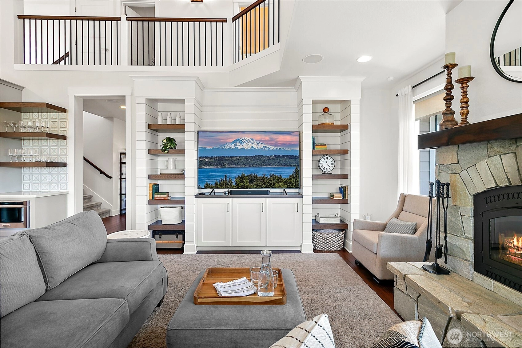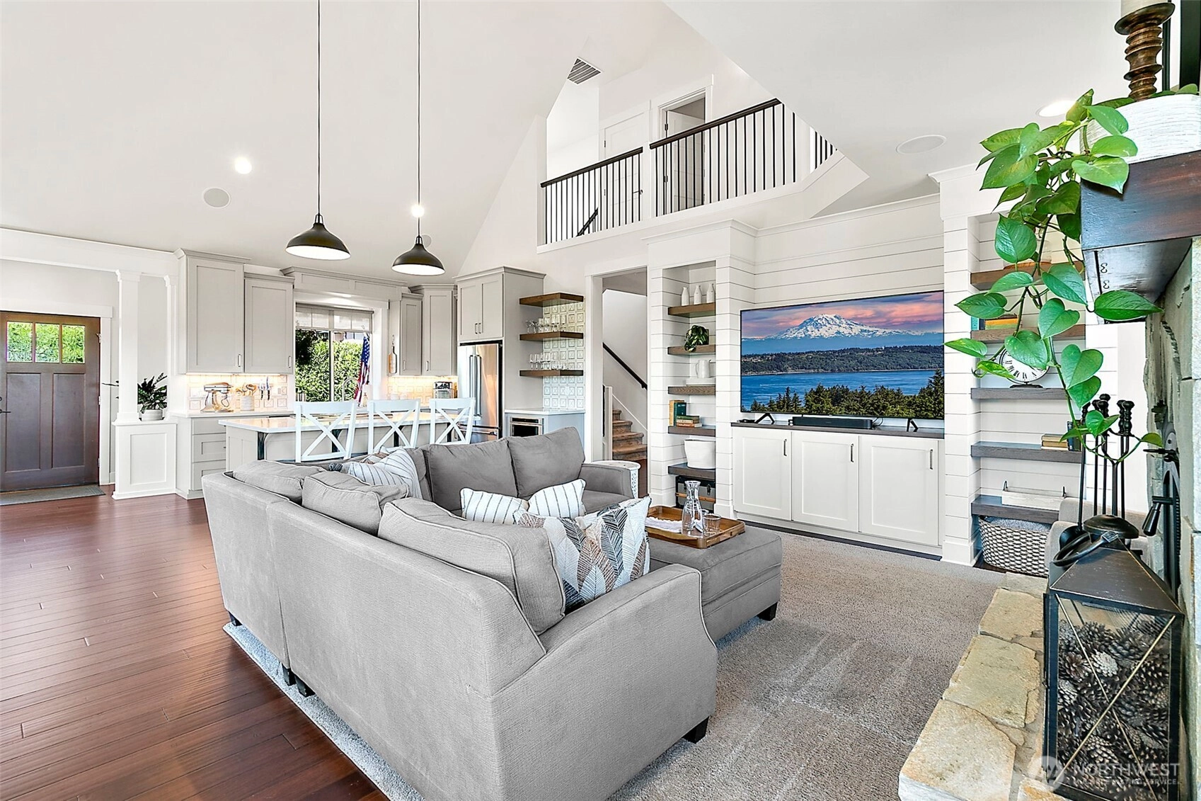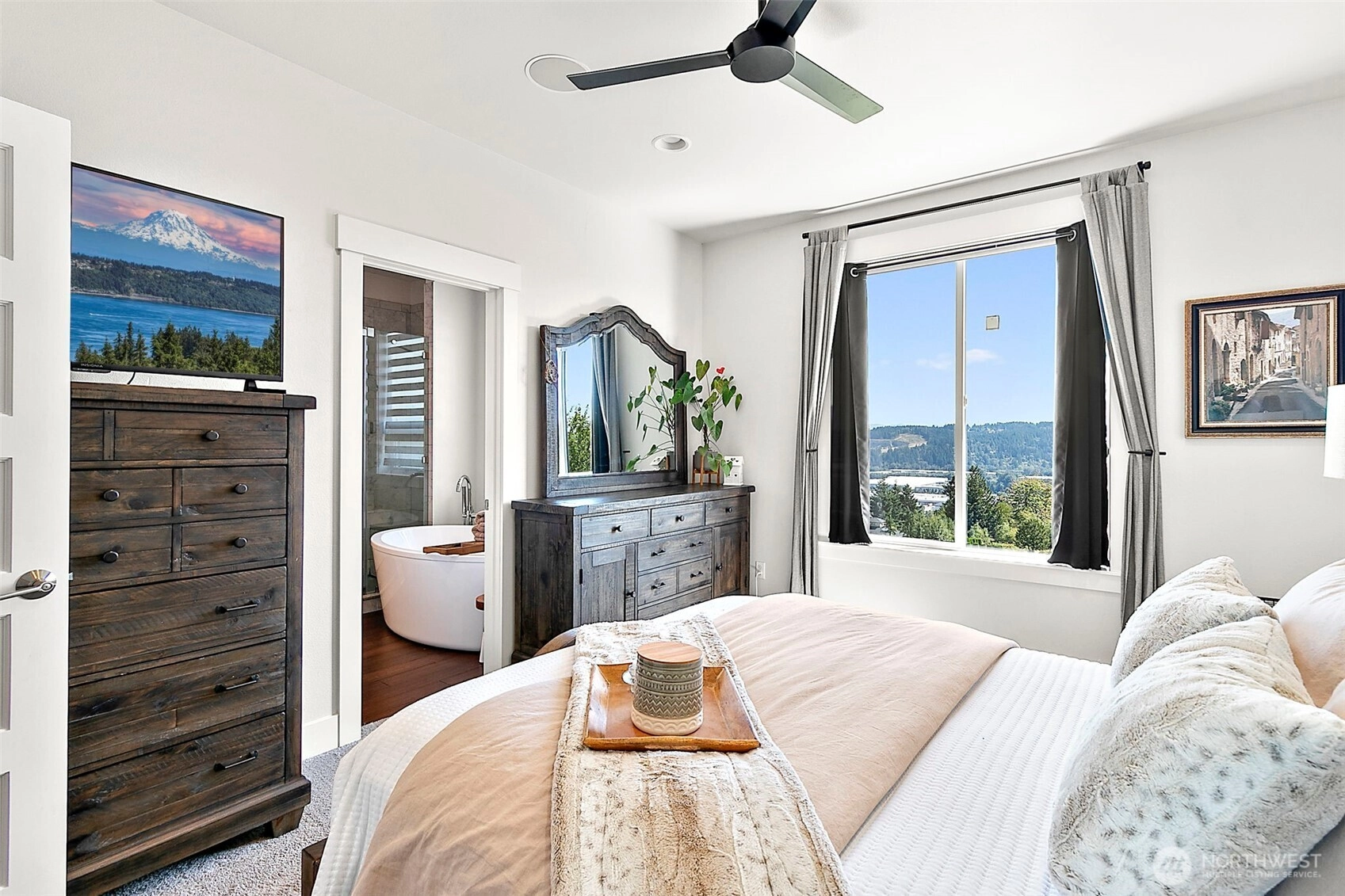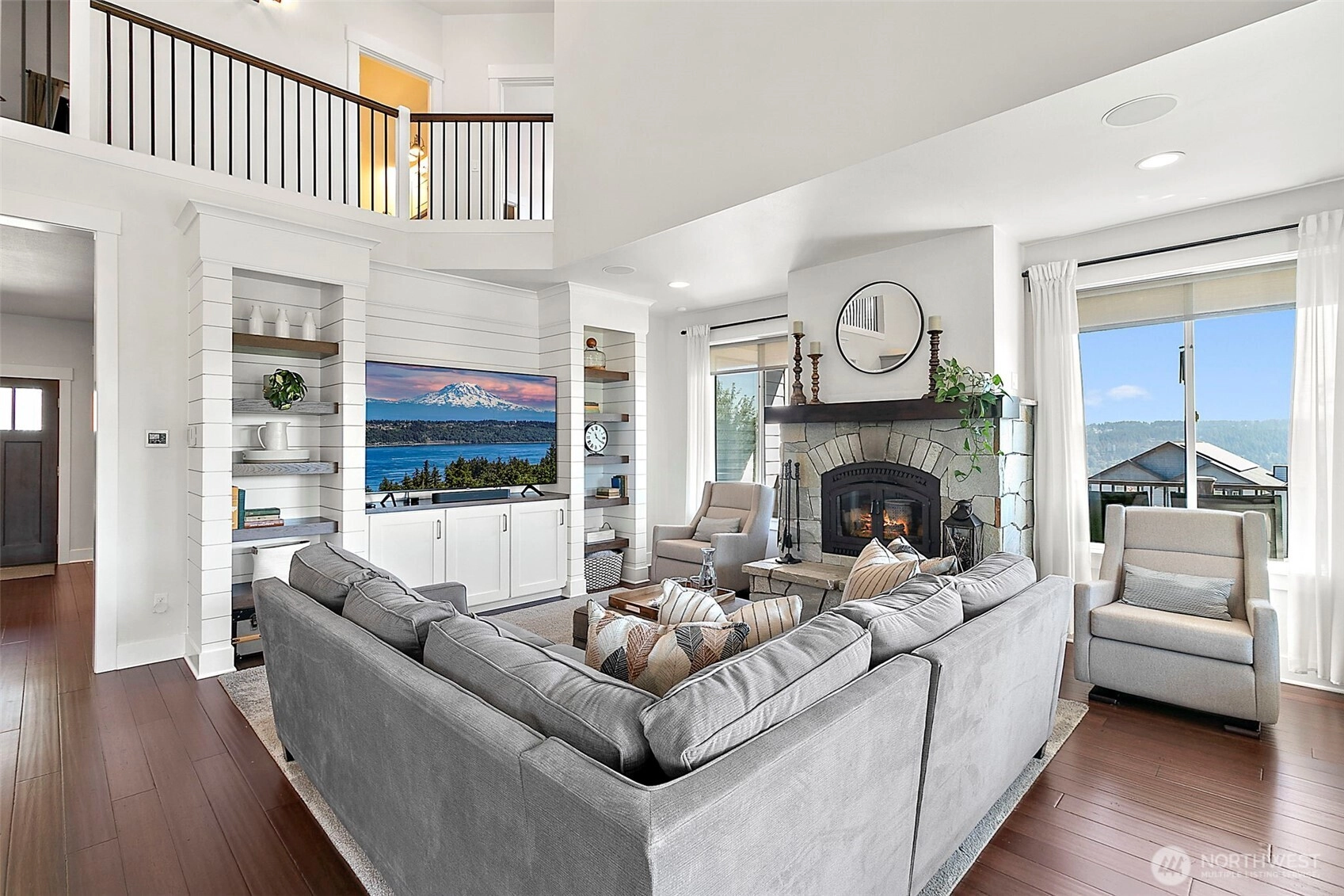 Luxury unfolds beyond a fully fenced, gated property just shy of a half-acre in Edgewood. Manicured landscaping includes mature hedges, irrigation, garden space, fruit trees, and a strawberry patch. Mount Rainier and valley views create a serene backdrop. The 3,116 sq ft home features exposed beams, a dramatic 22’ vaulted ceiling, custom built-ins, integrated sound and security systems, and abundant storage. Three bedrooms plus an office with private deck; main-level primary suite. Finished lower level offers additional living or entertaining space. Expansive concrete paver patio and deck. Oversized garage with 9’ door and shop/workbench area. A rare opportunity in one of Edgewood’s most sought-after locations.