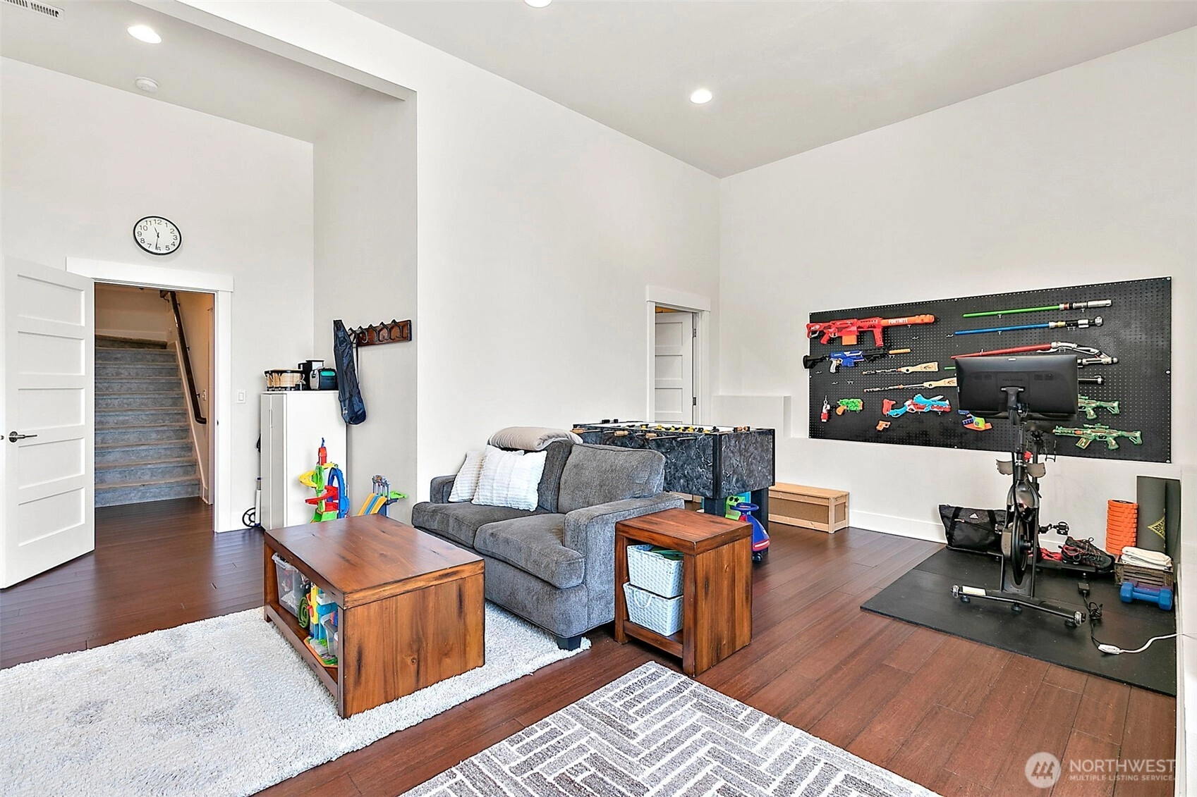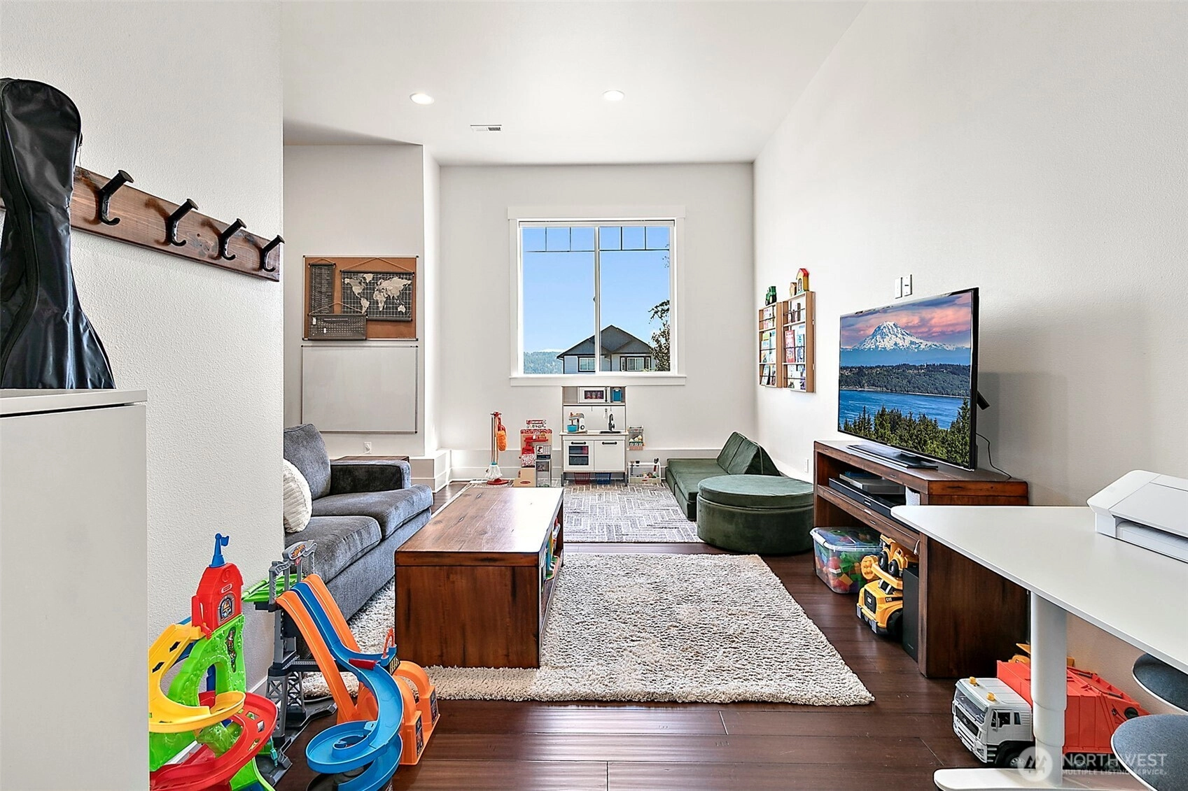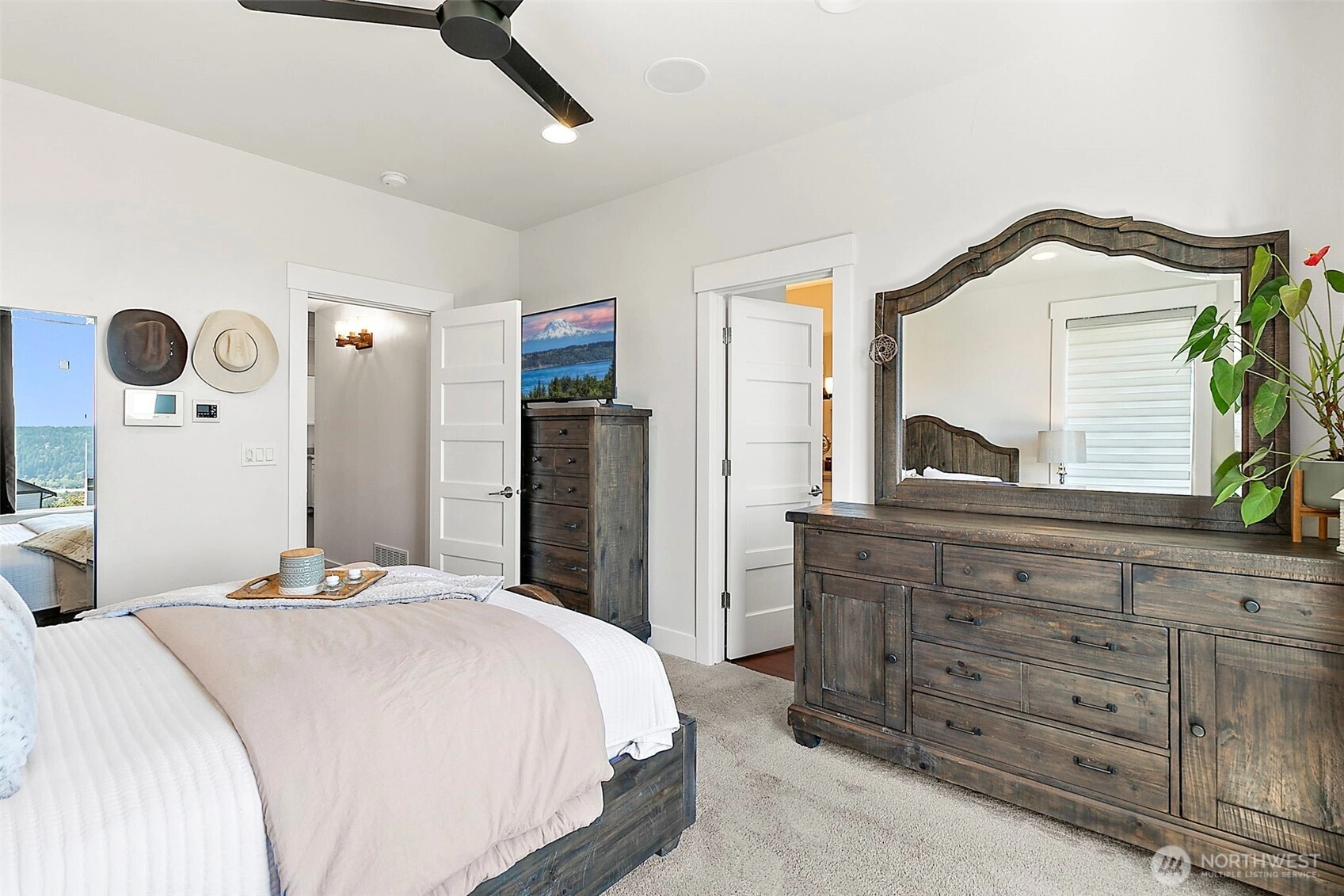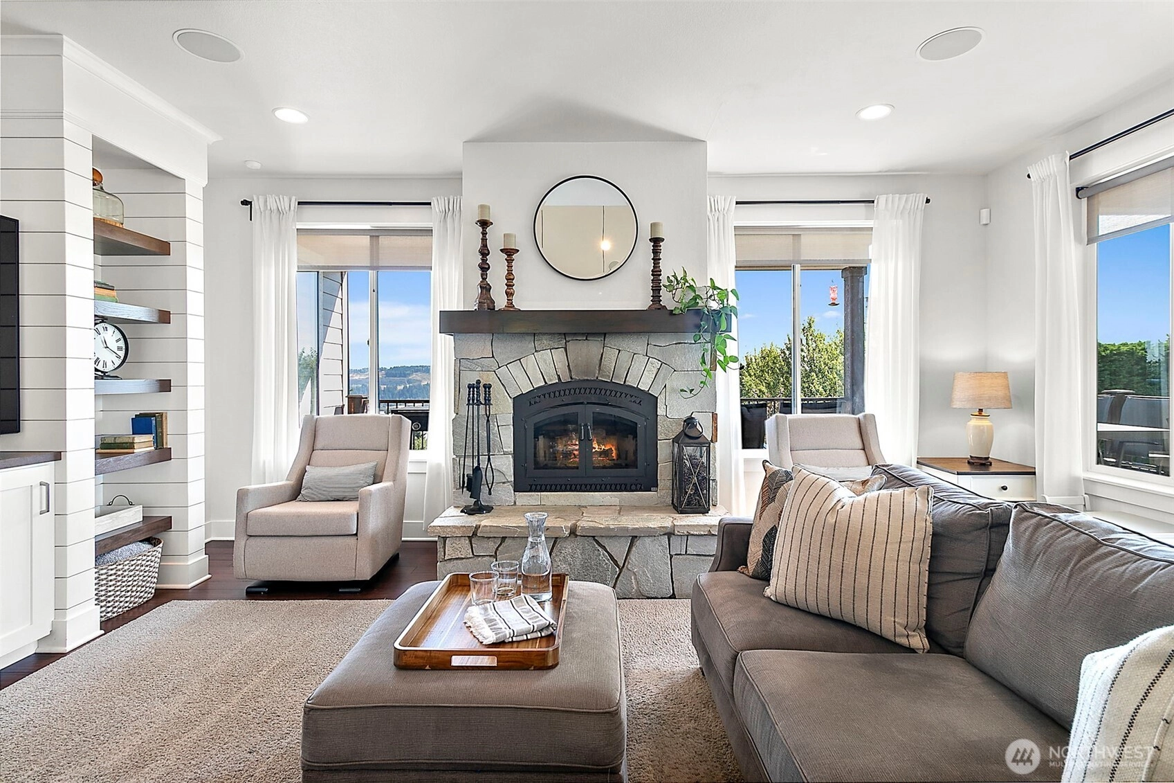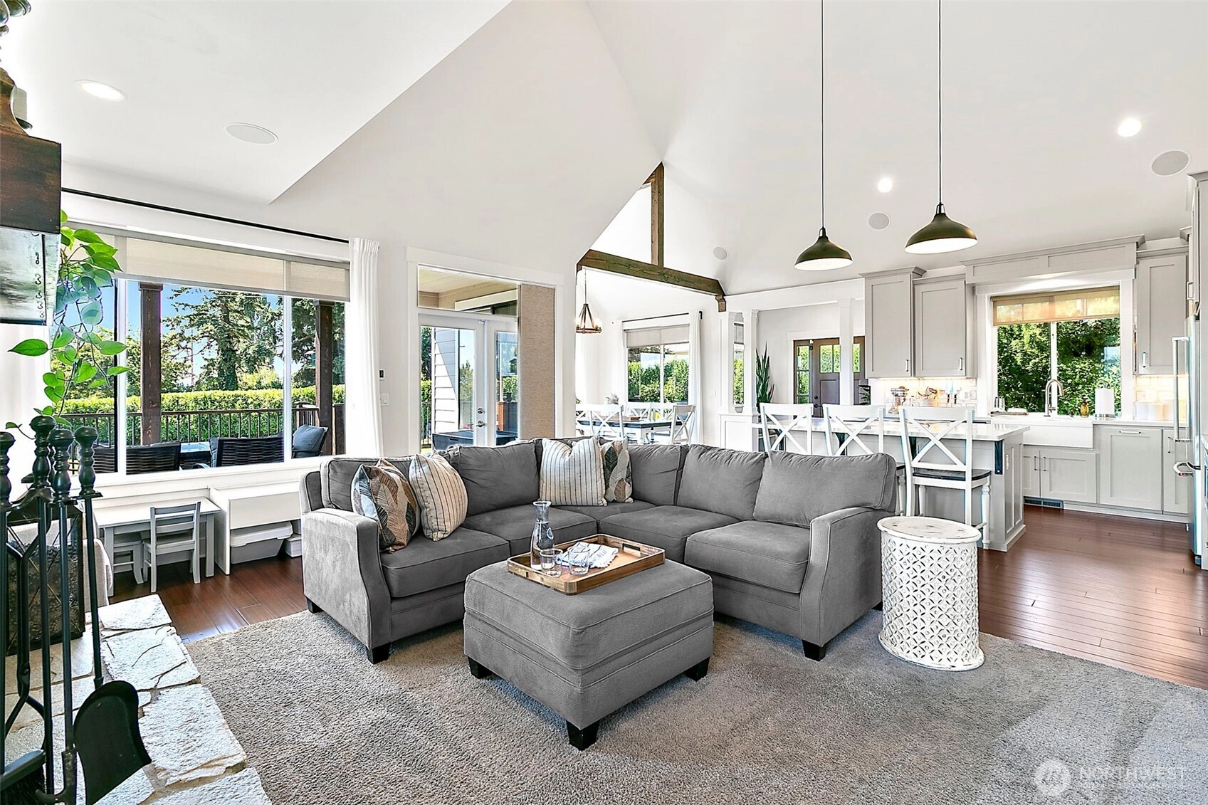 Luxury unfolds beyond a fully fenced, gated property just shy of a half-acre in Edgewood. Manicured landscaping includes mature hedges, irrigation, garden space, fruit trees, and a strawberry patch. Mount Rainier and valley views create a serene backdrop. The 3,116 sq ft home features exposed beams, a dramatic 22’ vaulted ceiling, custom built-ins, integrated sound and security systems, and abundant storage. Three bedrooms plus an office with private deck; main-level primary suite. Finished lower level offers additional living or entertaining space. Expansive concrete paver patio and deck. Oversized garage with 9’ door and shop/workbench area. A rare opportunity in one of Edgewood’s most sought-after locations.