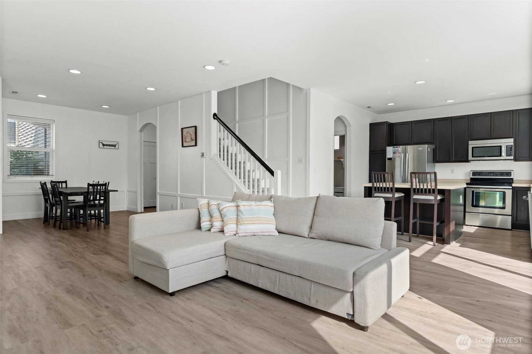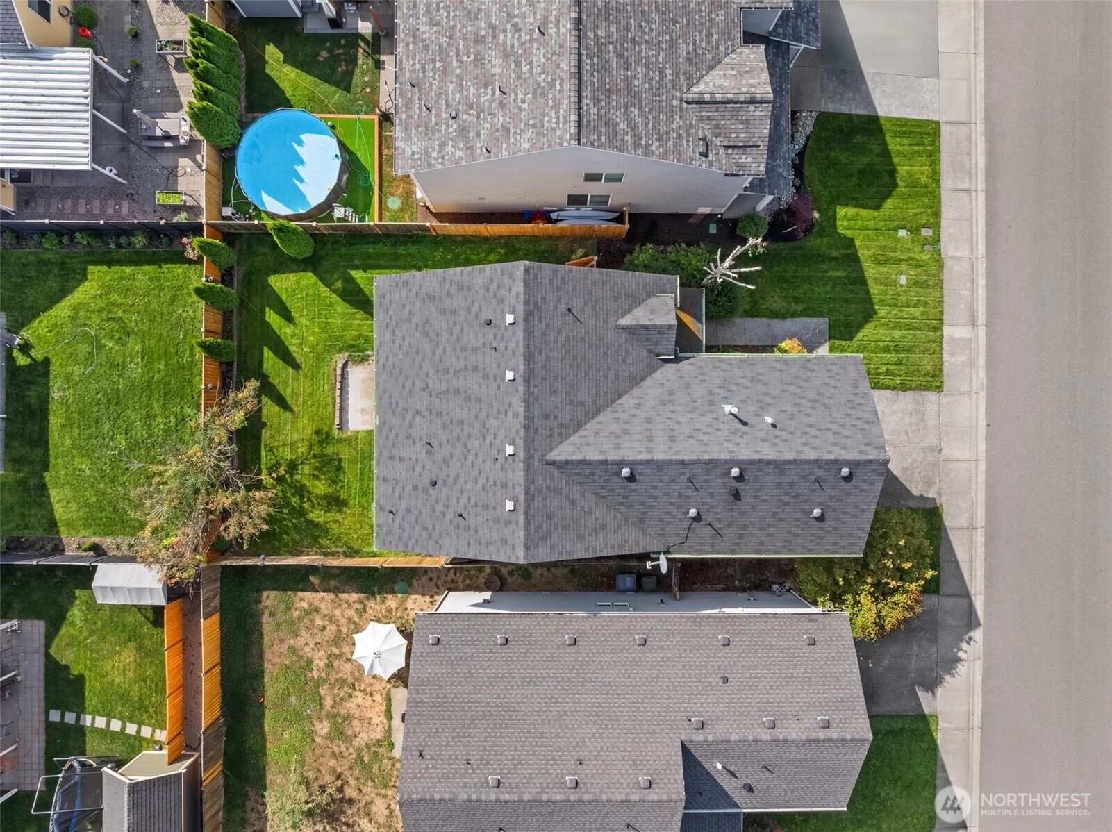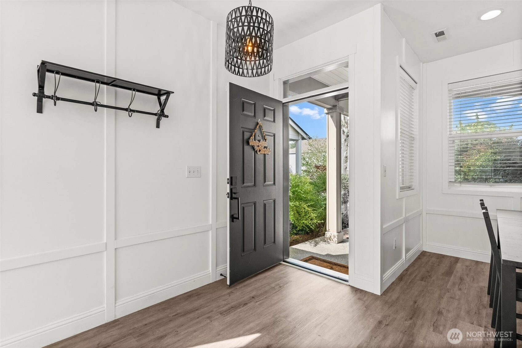 Welcome to the nicest home in the sought-after gated Wyndham Ranch Community! The entry sets the tone with custom designer walls and a statement chandelier. The spacious living room opens to a bright kitchen featuring an island with an overhang great for eating and entertaining. Upstairs, the expansive primary suite boasts LVP flooring, a large walk-in closet, and an en-suite bath. All bedrooms have a walk-in closet. Modern upgrades to the home include new LVP flooring, faux wood blinds, and central AC. Enjoy a fully fenced yard with front and backyard sprinklers. Community amenities include a gated entry, parks, walking trails, courts, common areas, and a covered picnic space—all just minutes from JBLM, shopping, and entertainment!