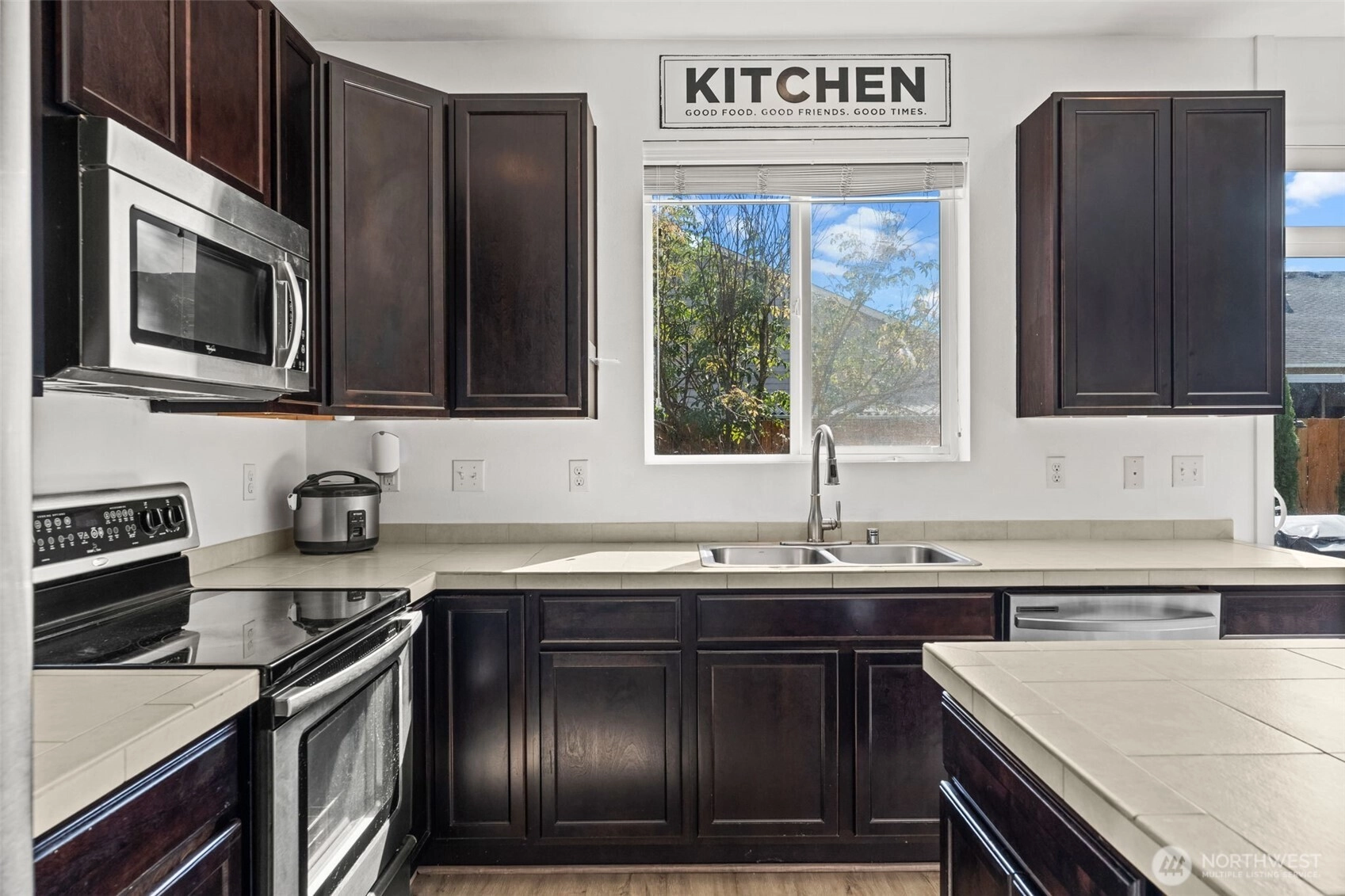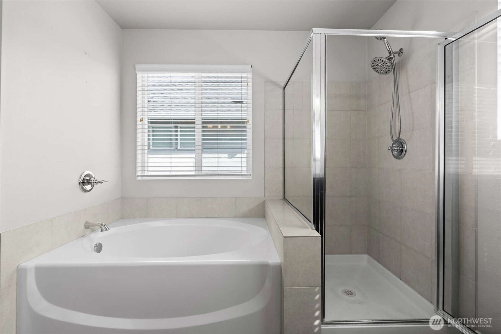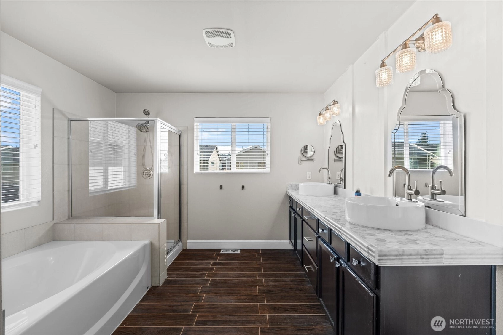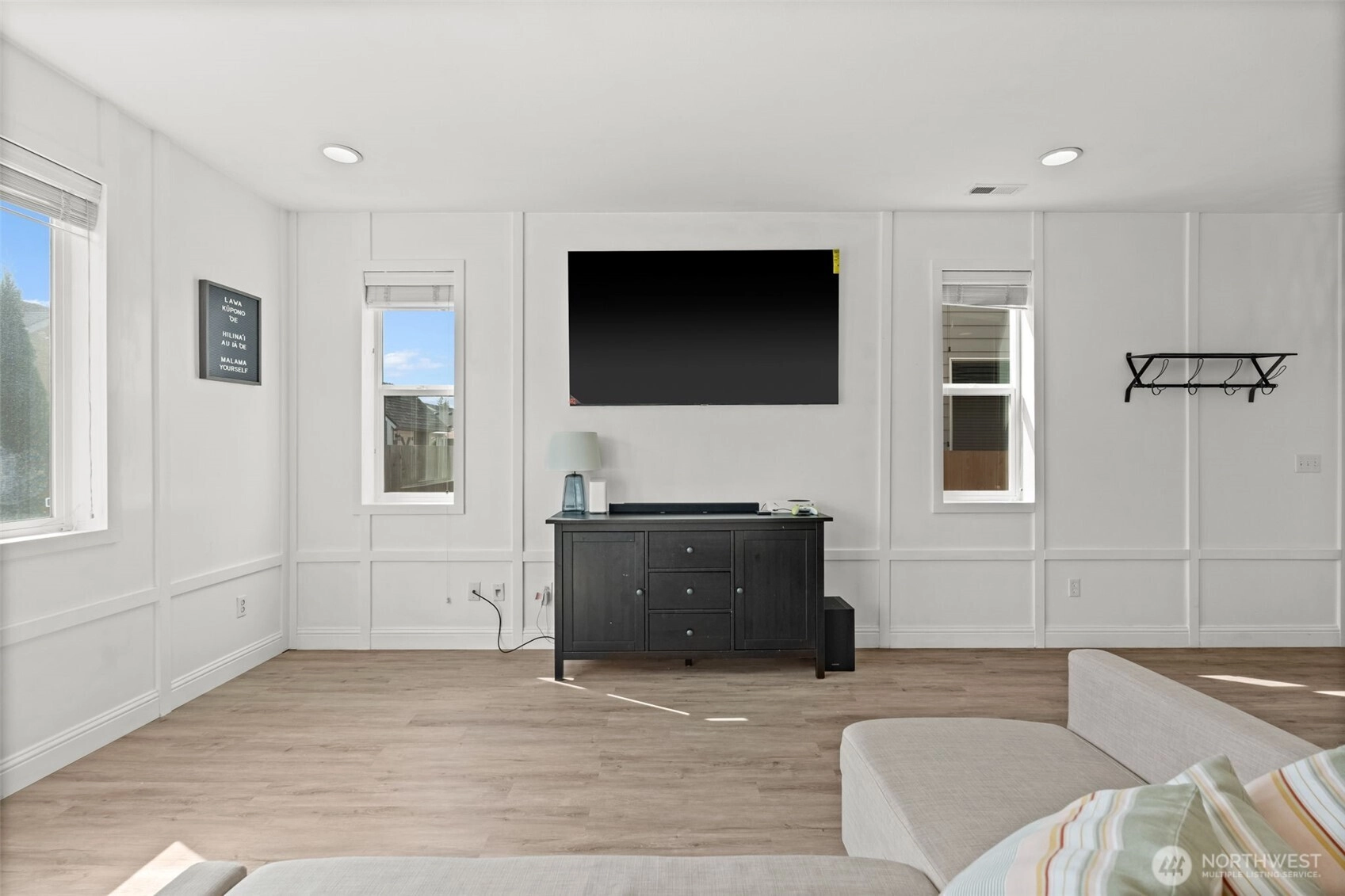 Welcome to the nicest home in the sought-after gated Wyndham Ranch Community! The entry sets the tone with custom designer walls and a statement chandelier. The spacious living room opens to a bright kitchen featuring an island with an overhang great for eating and entertaining. Upstairs, the expansive primary suite boasts LVP flooring, a large walk-in closet, and an en-suite bath. All bedrooms have a walk-in closet. Modern upgrades to the home include new LVP flooring, faux wood blinds, and central AC. Enjoy a fully fenced yard with front and backyard sprinklers. Community amenities include a gated entry, parks, walking trails, courts, common areas, and a covered picnic space—all just minutes from JBLM, shopping, and entertainment!
