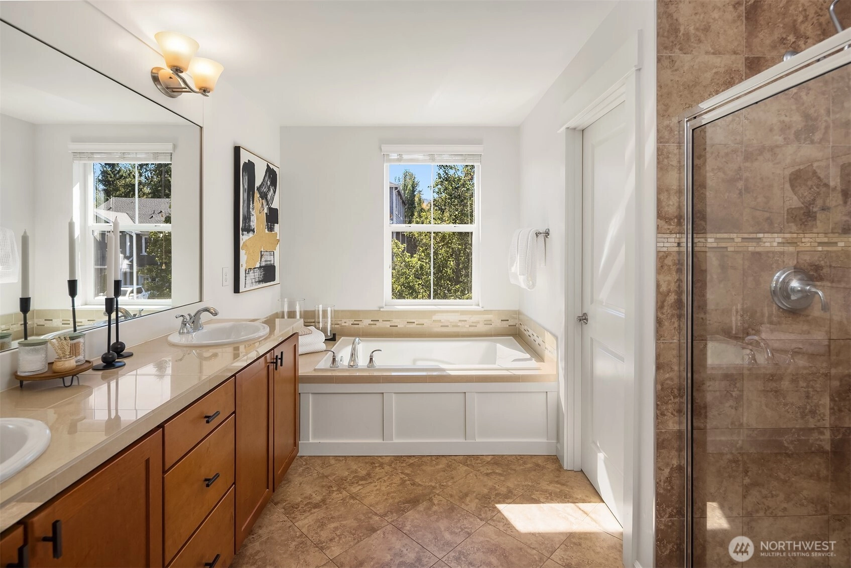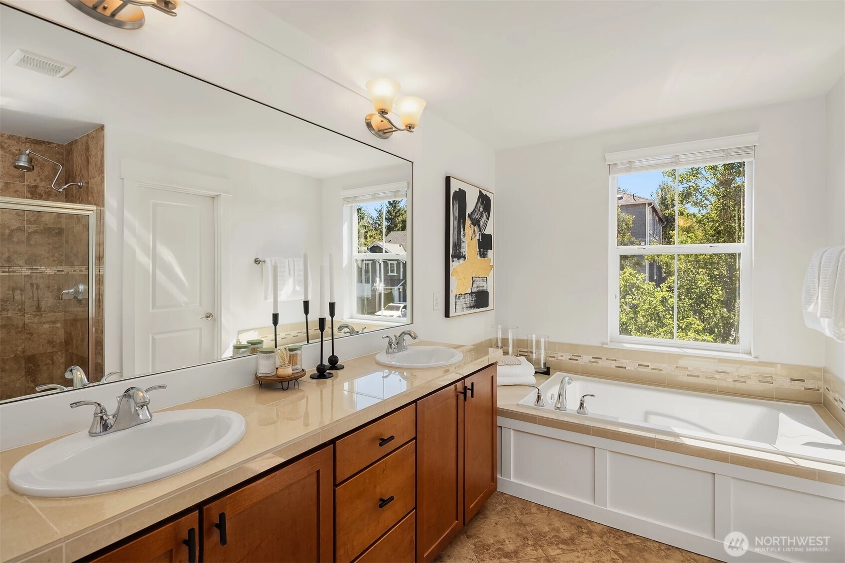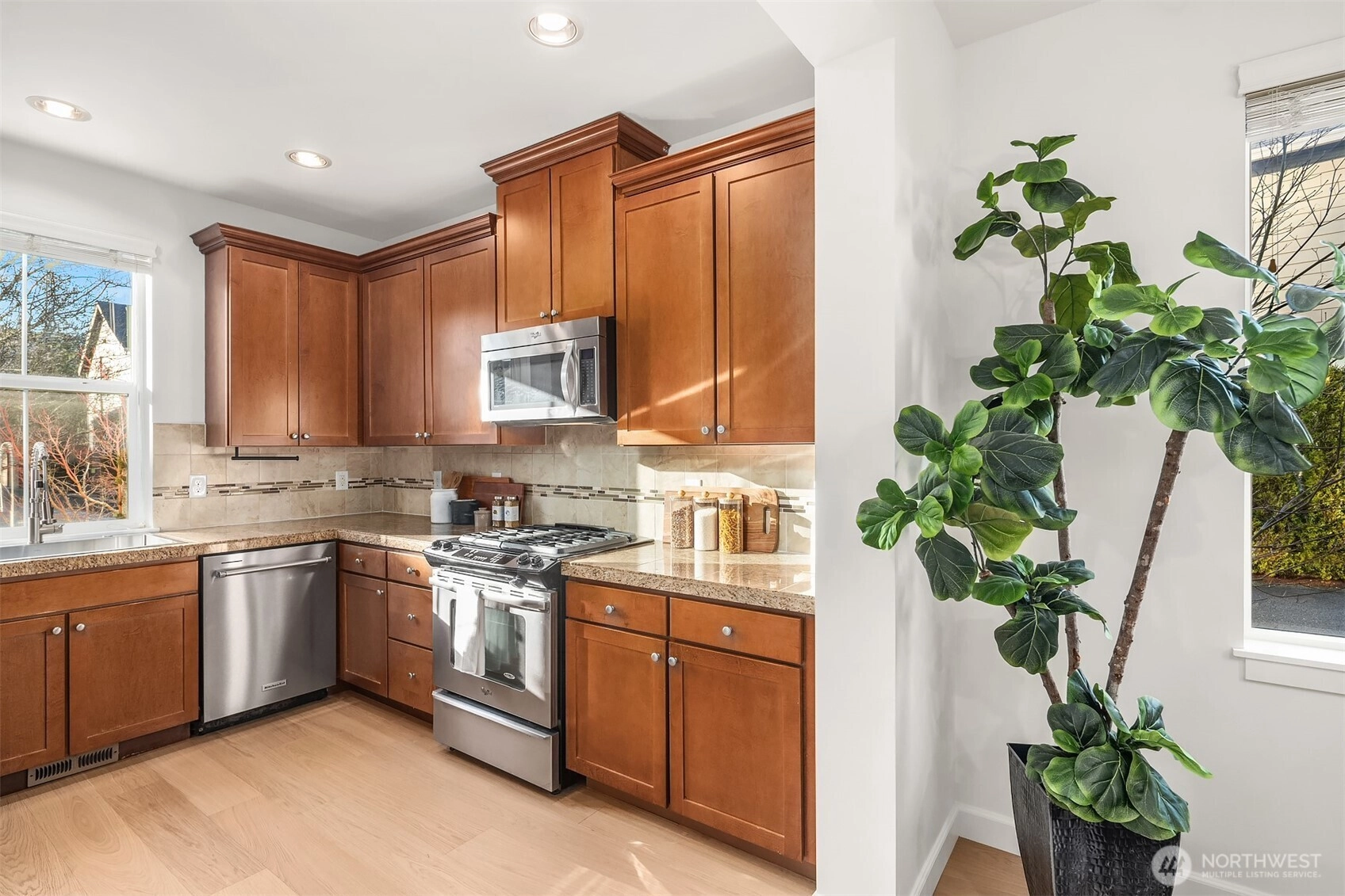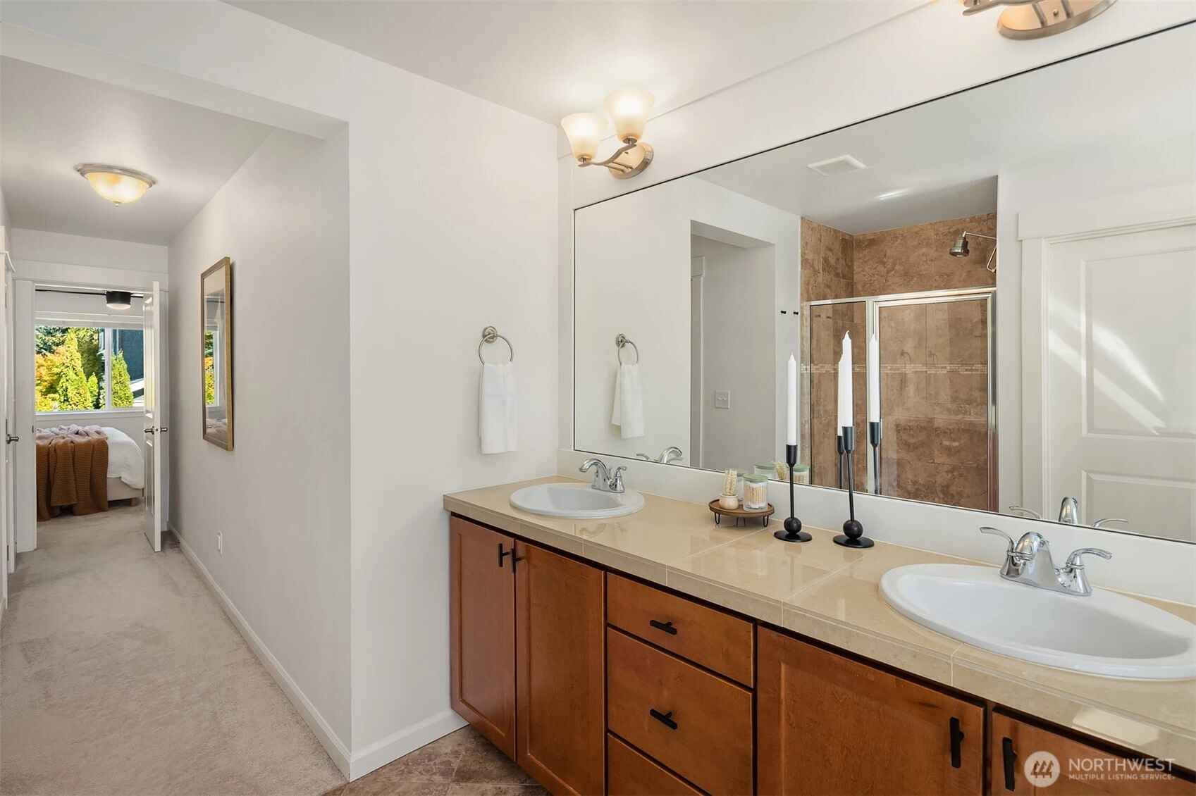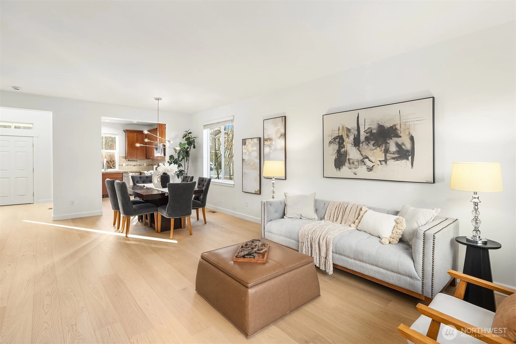 Step inside to brand new main level oak flooring and fresh interior paint, giving the home a bright, refreshed, and truly move-in-ready feel. Warm finishes and a cozy fireplace create an inviting atmosphere throughout this Snoqualmie Ridge retreat. The open kitchen features granite counters, stainless appliances, a gas cooktop, and rich cabinetry making it perfect for everyday living or entertaining. Upstairs, the primary suite offers a spa like 5-piece bath, along with two additional bedrooms, a full guest bath, and a versatile flex space. Outside enjoy a turf backyard ideal for relaxing or hosting. With A/C, nearby trails, parks, and all the amenities of the Ridge community, this home blends comfort, style, and ease.
