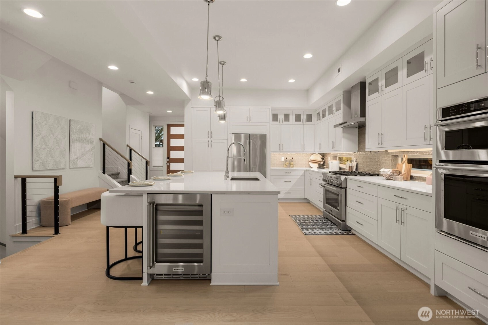 New Price! Experience the best of Downtown Kirkland living just steps from Google, Urban, QFC, restaurants, shops & waterfront of Lake Washington. This stunning 4-bed, 3.25-bath detached house perfectly blends modern urban style w/ suburban comfort & features a private rooftop deck w/ breathtaking Lake Washington views — ideal for entertaining or unwinding at sunset. The thoughtfully designed interior showcases a gourmet kitchen w/ quartz countertops, premium KitchenAid appliances, fresh interior paint & brand-new engineered hardwood floors. A well-managed HOA w/ dues covering water/sewer, the master policy including earthquake insurance & future replacement of major exterior components including roof/siding. Award-winning Lake Washington SD Schools!