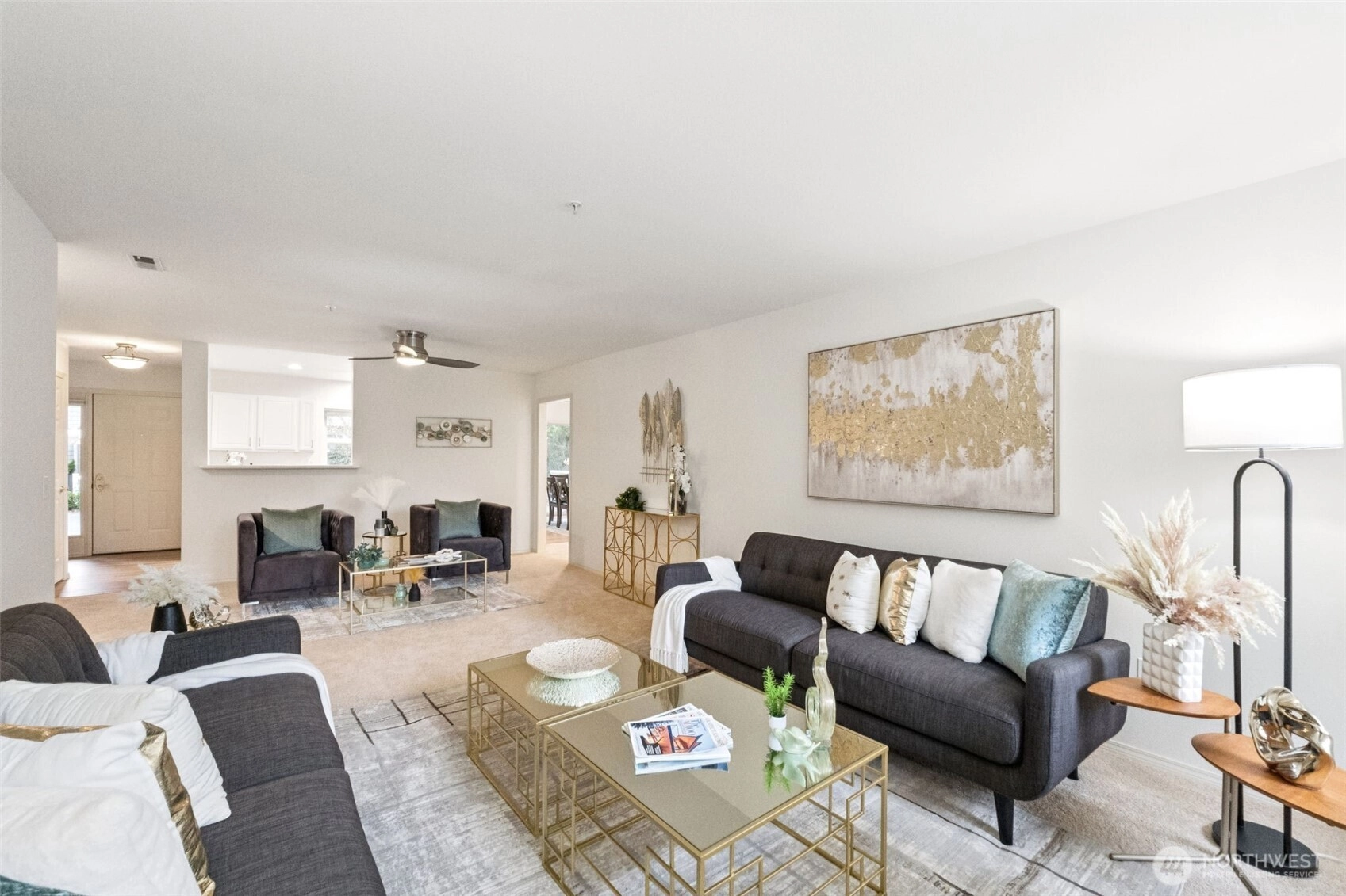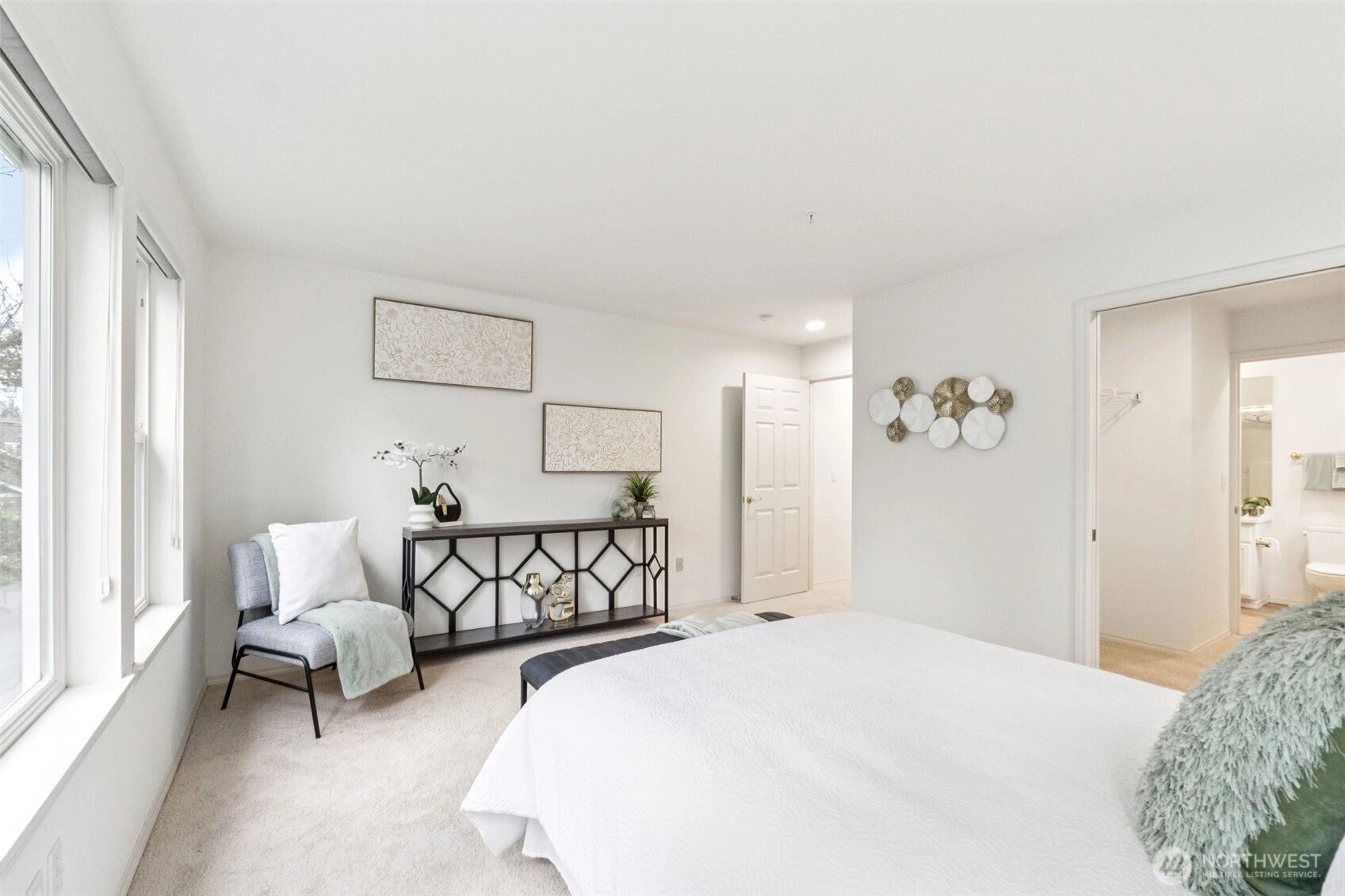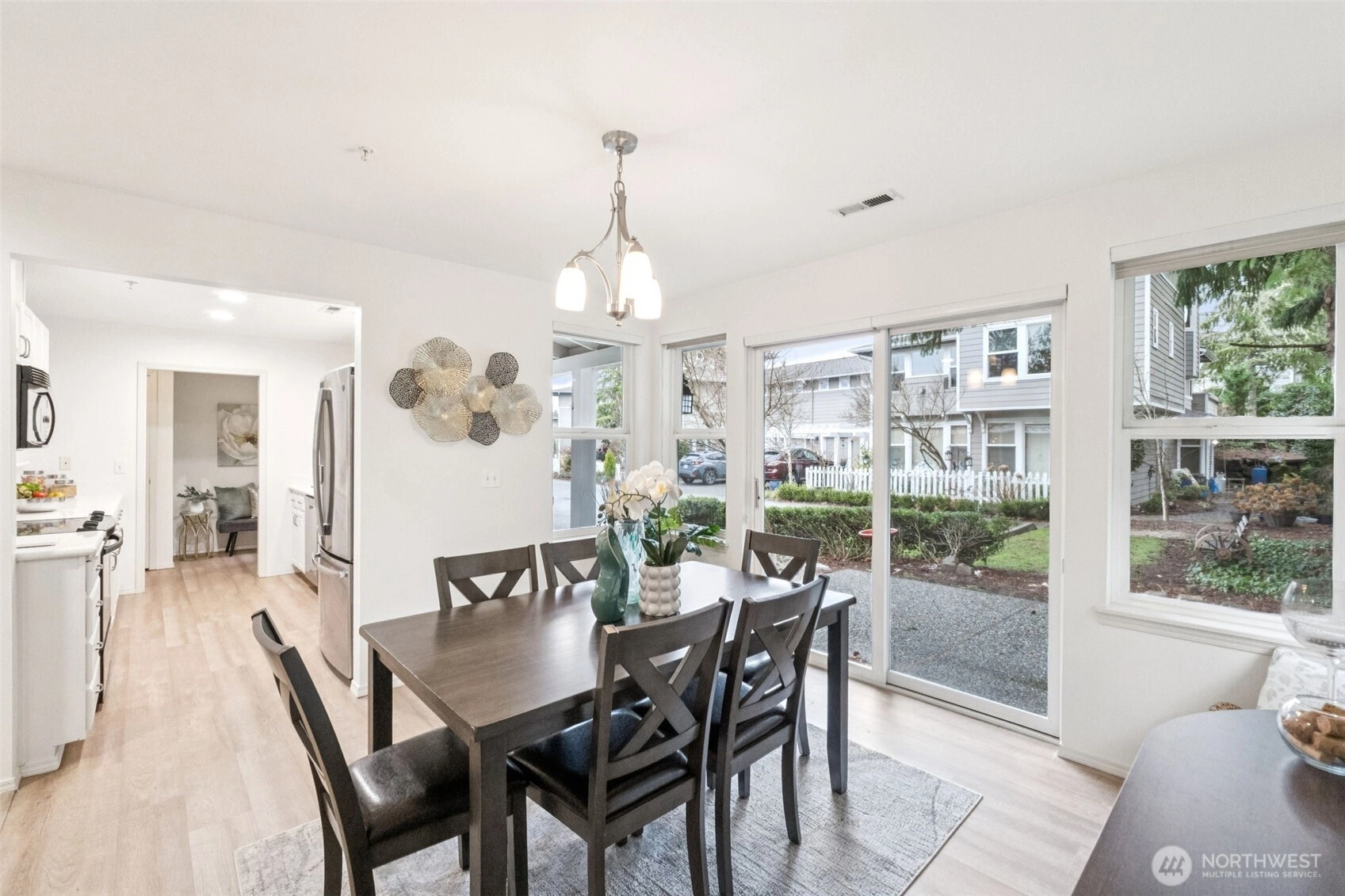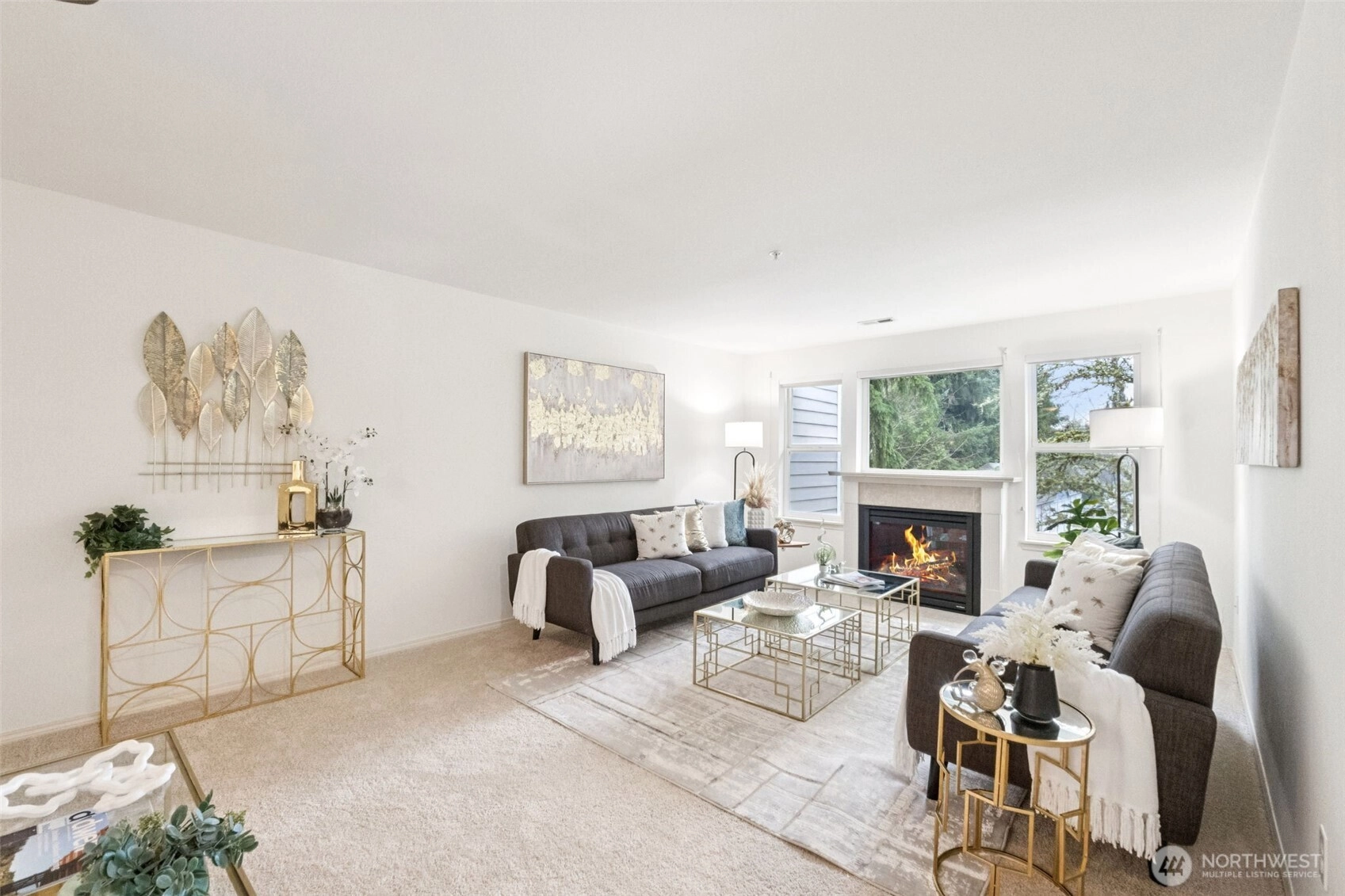 Exceptional private 2 bed/2 ba end unit property. Spacious open floor plan features large windows with natural light, views of the beautiful trees. Spacious kitchen features white newly painted cabinets, new sink, SS appl. Brand new carpet, luxury vinyl plank & paint throughout! New modern light fixtures. L/D with gas fireplace. Large nook/office/sitting room. Primary suite on main with walk-in closet. Full bath on main floor. Upstairs 2nd view bedroom with walk-in closet, full hall bath. Enjoy the quiet front patio. Exterior sun shades. Newer furnace, H20, W/D. 1-car attached garage. This plan is larger than the comps/feel the difference in the room sizes! Highly desirable 55+ Providence Point features welcoming activities & amenities.