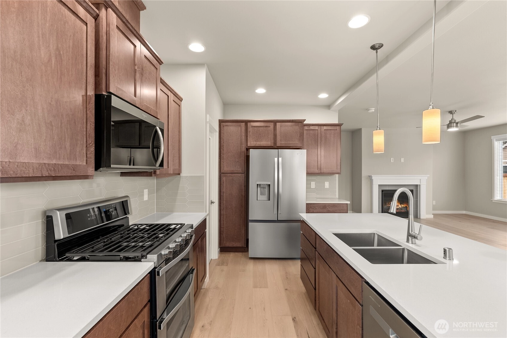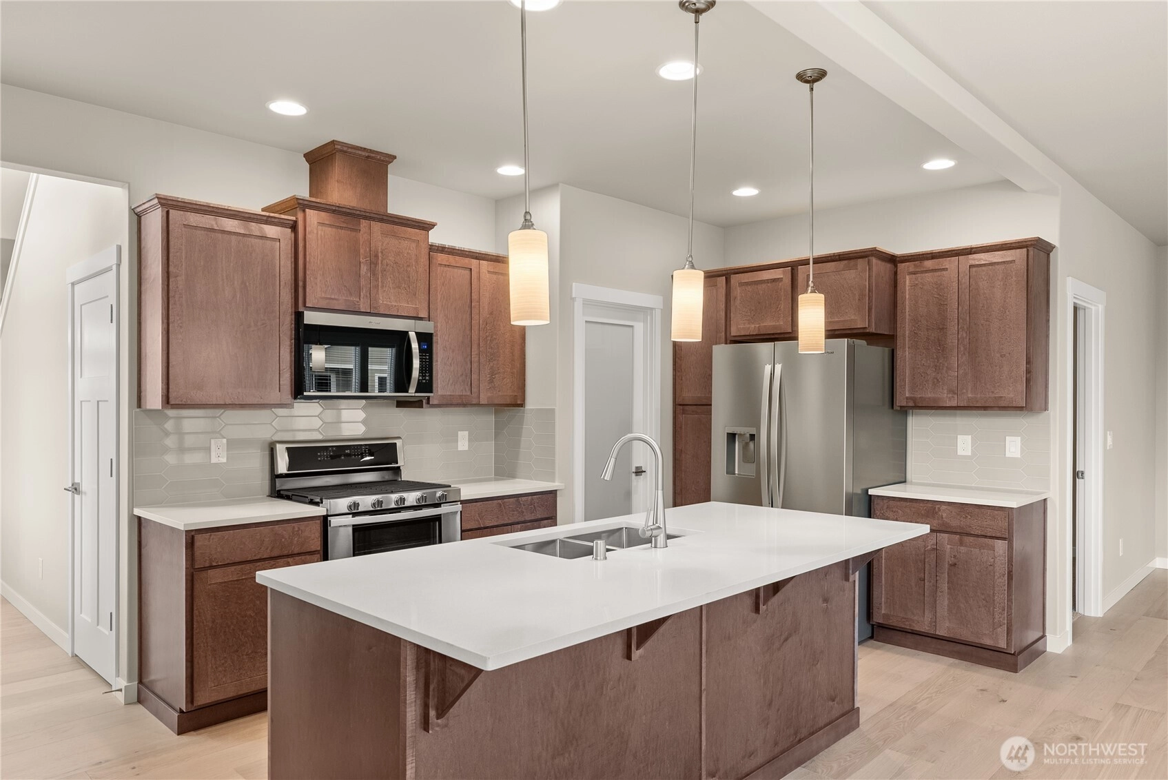 Welcome home to Skyview Estates, where luxury and comfort blend seamlessly. Move-in ready with washer/dryer, fridge & blinds included! Step into the chef-inspired kitchen—featuring "Sable" Maple cabinetry, quartz countertops, a full tile backsplash, and a gas stove w/double oven—perfect for hosting gatherings or daily living. Expansive hardwood floors lead you through light-filled spaces, including a main floor den & upstairs bonus room, designed for both work and play. Outside, relax on the covered patio overlooking a fully fenced, fully landscaped yard. Energy-efficiency w/solar panels, heat pump, and a hybrid water heater ensure year-round comfort. All this, just moments from I-5, Costco, and top-rated schools.