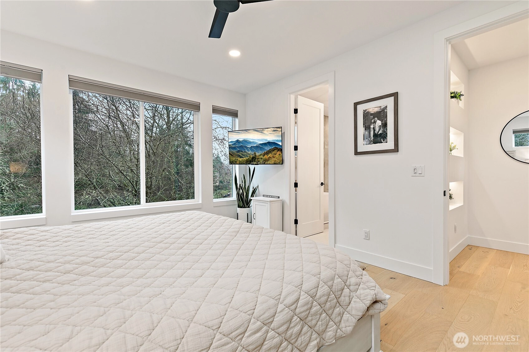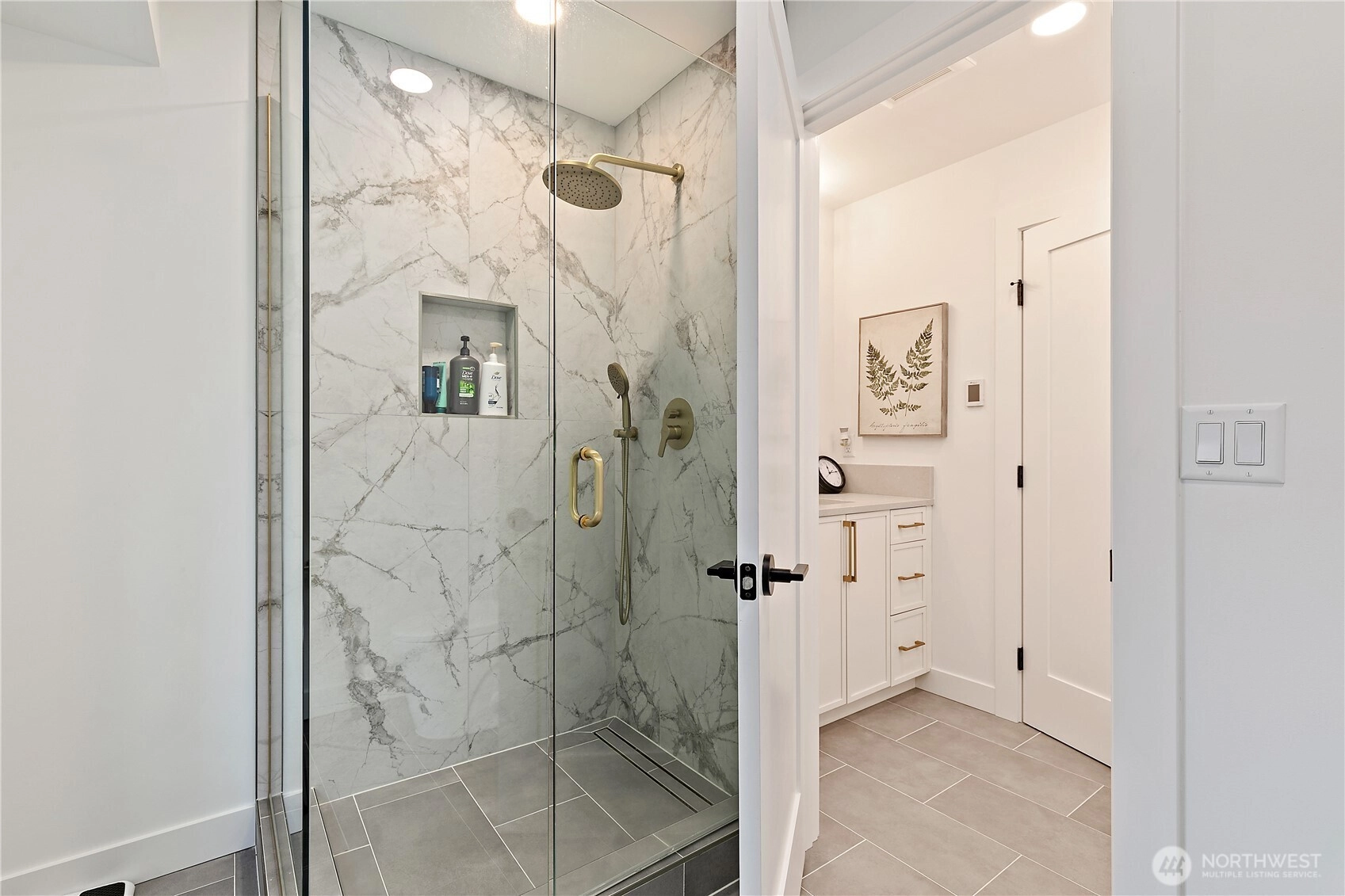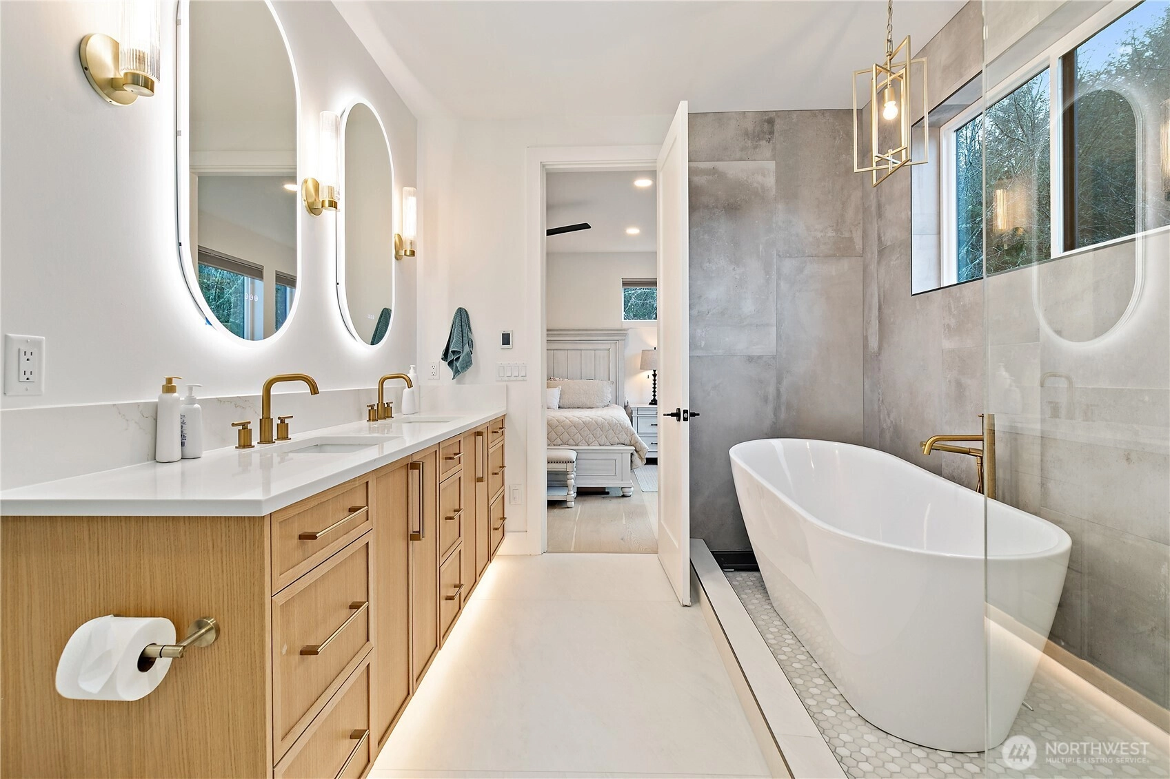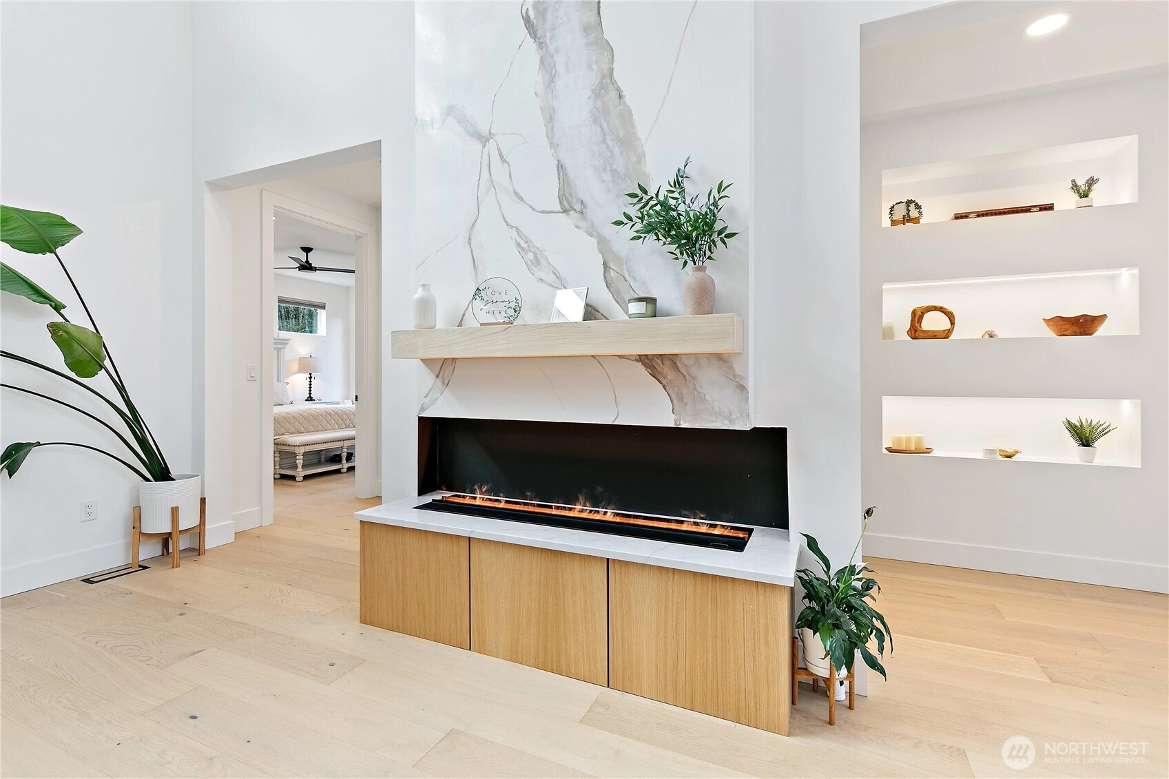Welcome to this contemporary custom residence, delivering the sophistication and style of new construction with premium upgrades. Thoughtfully designed, the home offers four bedrooms plus a den, with the primary suite and den on the main level. A floor-to-ceiling fireplace anchors the entry, while open-concept living spaces extend to a covered deck overlooking a greenbelt. The gourmet kitchen features custom cabinetry, refined surfaces, and top-tier appliances, ideal for entertaining and living. A bonus room adds versatility, while the finished basement offers space for a gym or media retreat. Complete with custom window coverings, a sprinkler system, and an epoxy-finished garage, this move-in-ready home offers a lifestyle better than new!