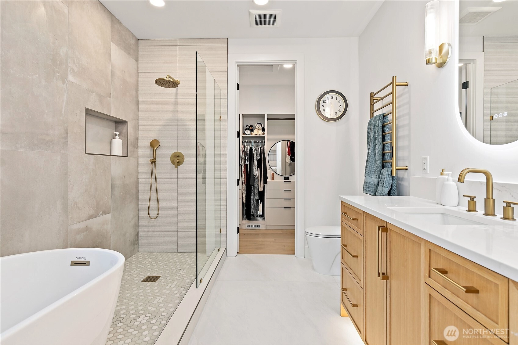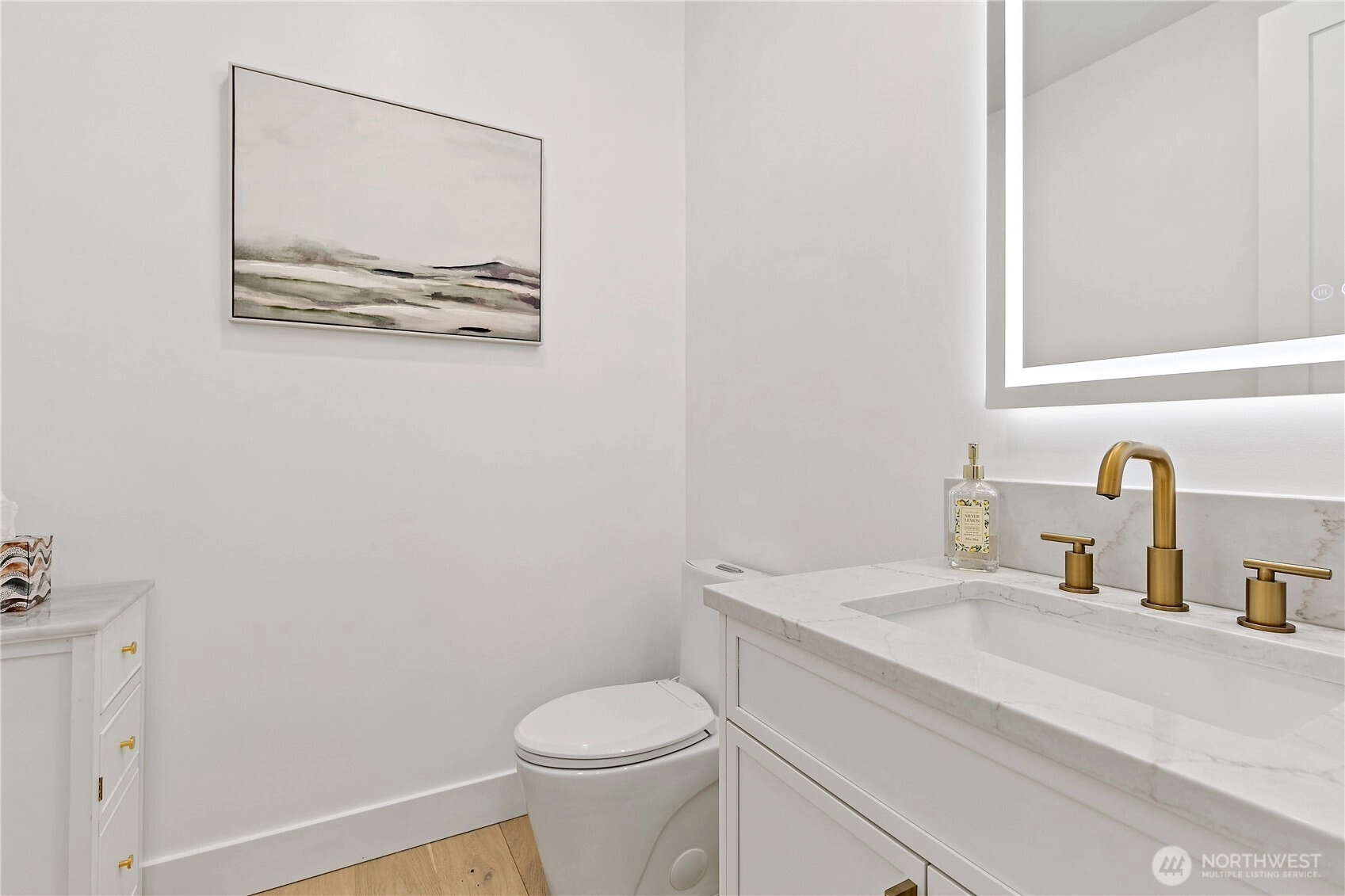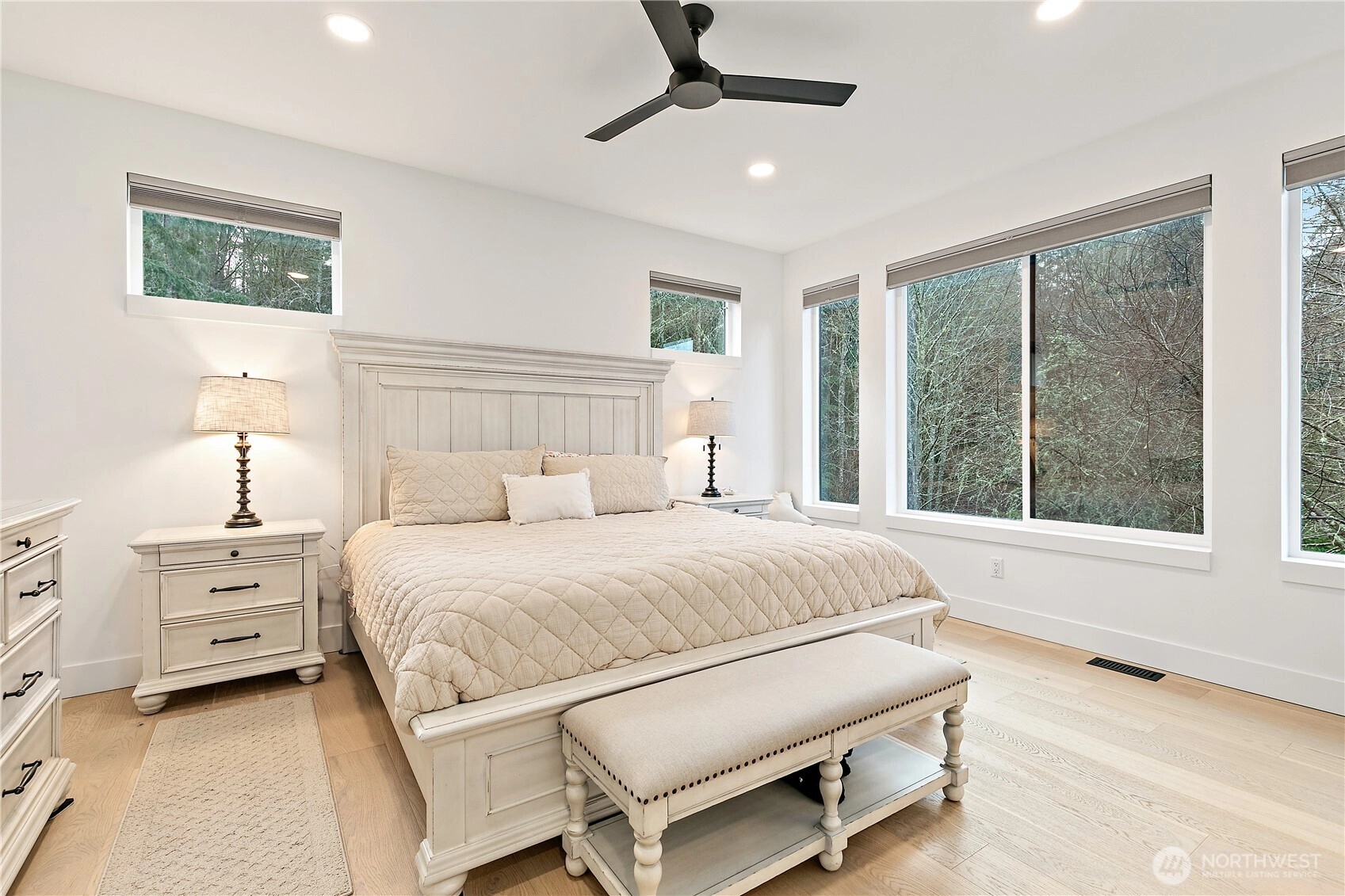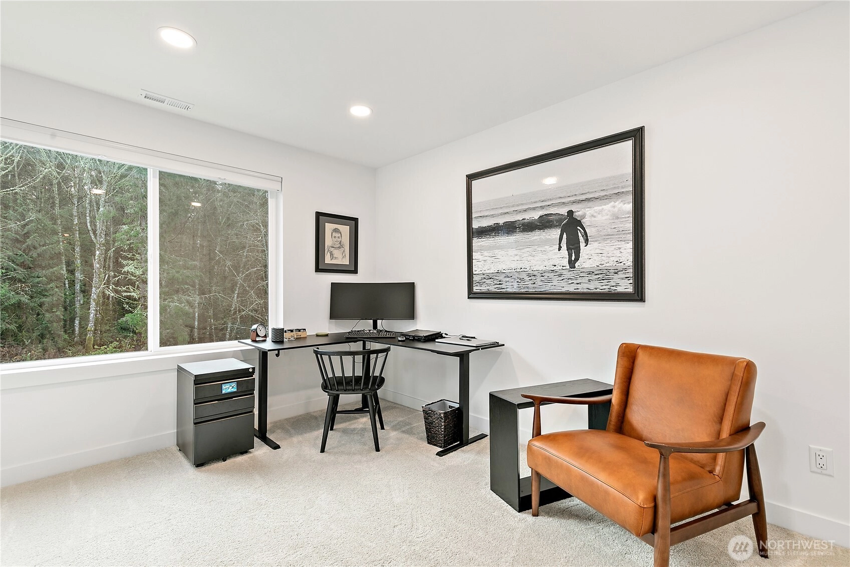Welcome to this contemporary custom residence, delivering the sophistication and style of new construction with premium upgrades. Thoughtfully designed, the home offers four bedrooms plus a den, with the primary suite and den on the main level. A floor-to-ceiling fireplace anchors the entry, while open-concept living spaces extend to a covered deck overlooking a greenbelt. The gourmet kitchen features custom cabinetry, refined surfaces, and top-tier appliances, ideal for entertaining and living. A bonus room adds versatility, while the finished basement offers space for a gym or media retreat. Complete with custom window coverings, a sprinkler system, and an epoxy-finished garage, this move-in-ready home offers a lifestyle better than new!