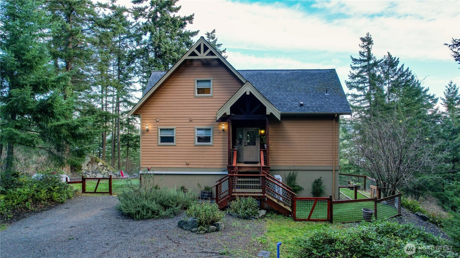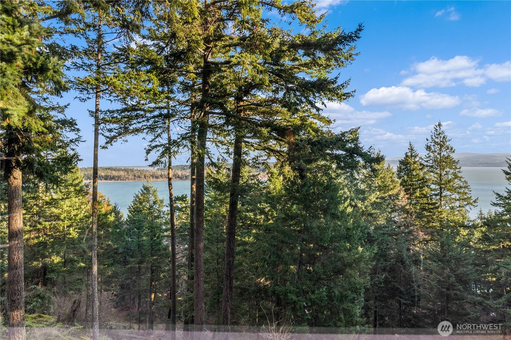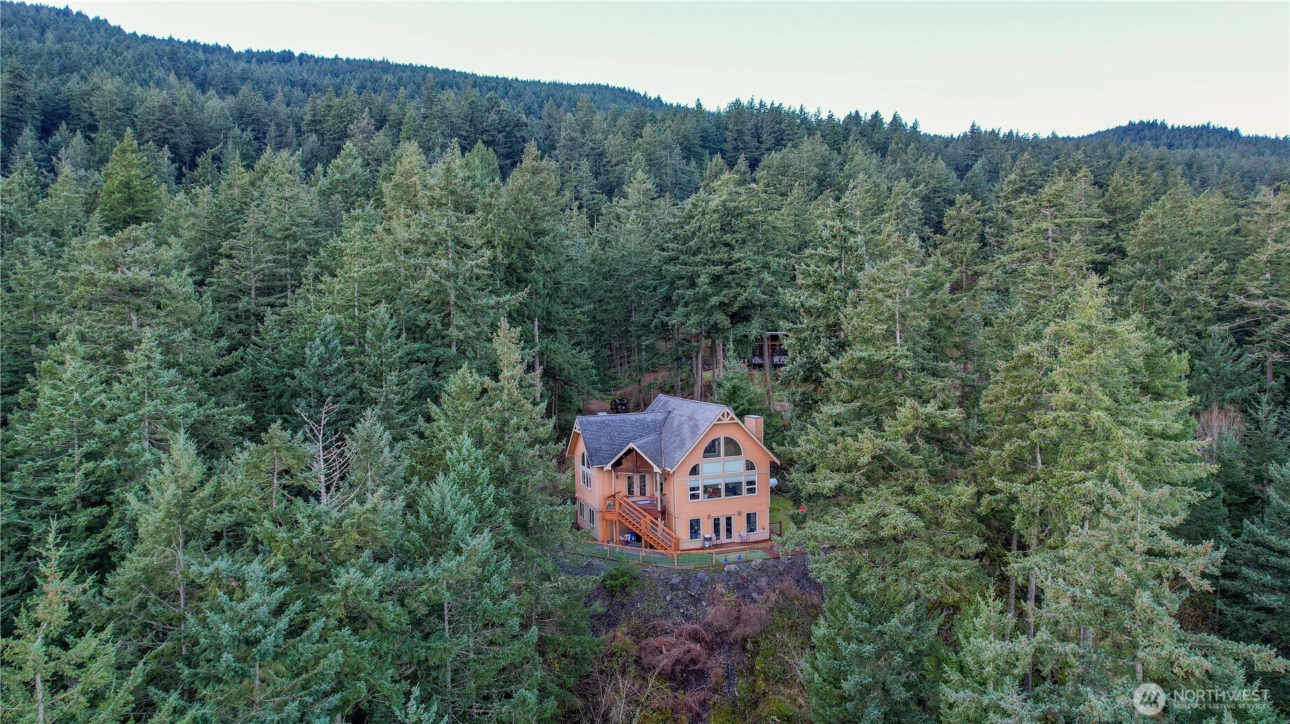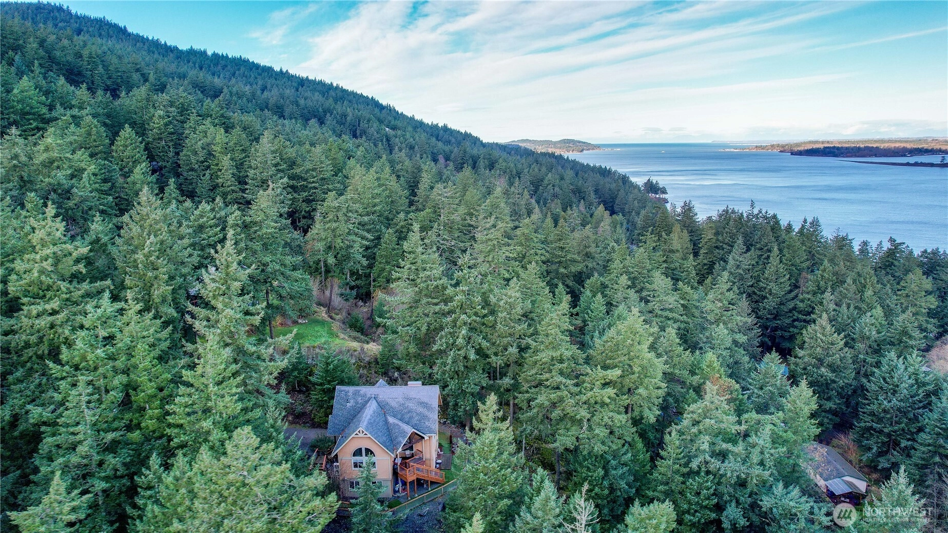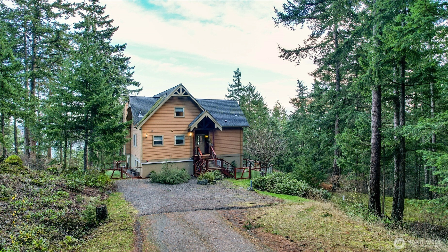 Perched high among mature evergreens, this Lummi Island retreat offers privacy, elevation, and sweeping bay and island views. Vaulted ceilings and dramatic arched windows flood the home with natural light while framing forest and water vistas year-round. Warm wood floors, exposed beams, and an open living layout create a timeless Northwest feel. Enjoy indoor-outdoor living from the covered view deck, ideal for morning coffee or sunset gatherings. Flexible lower level with walk-out access offers space for guests, studio, or recreation. End-of-road setting provides rare seclusion, yet remains minutes from the ferry, trails, boat launch, and community amenities—an exceptional island lifestyle opportunity.