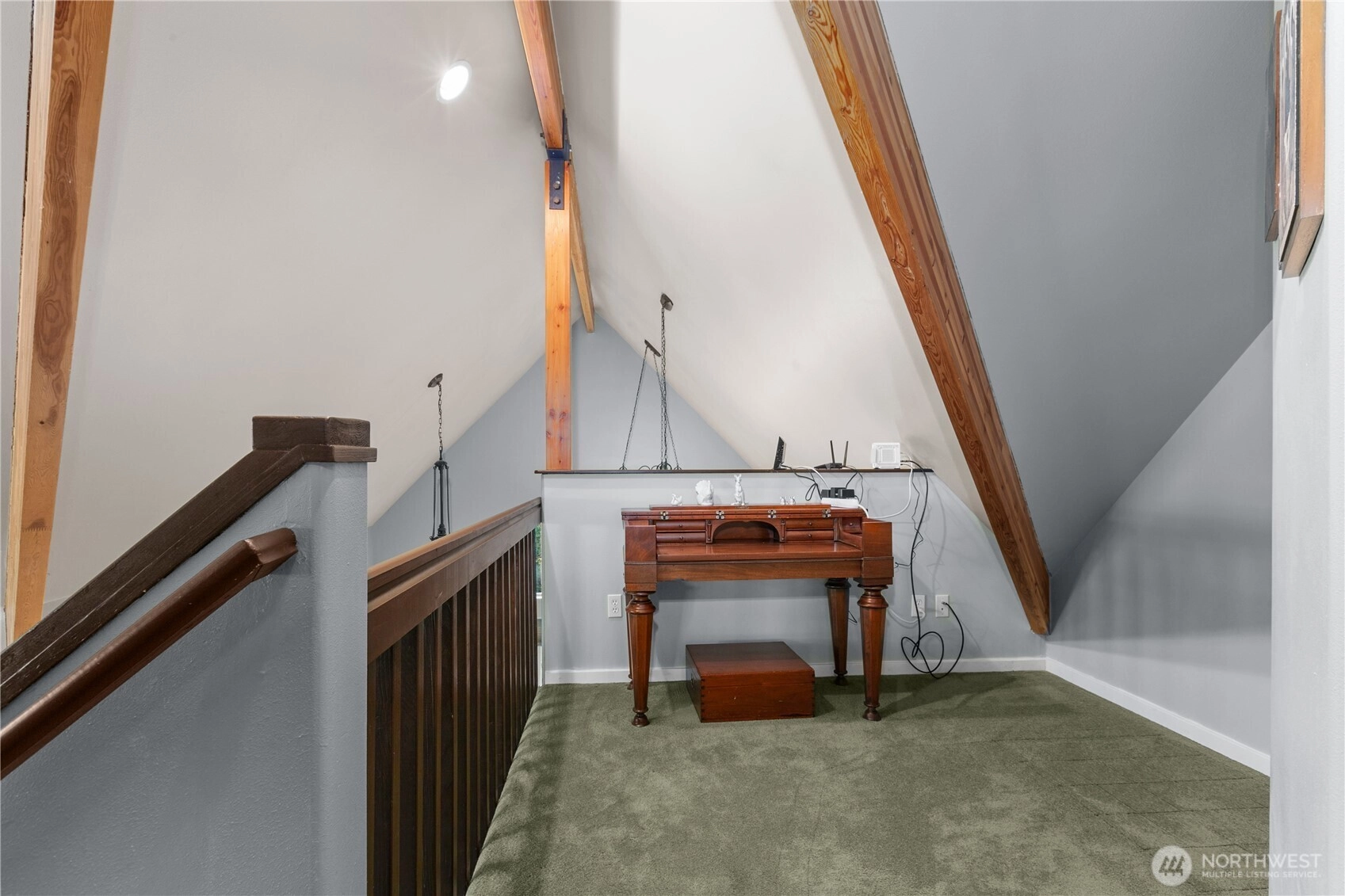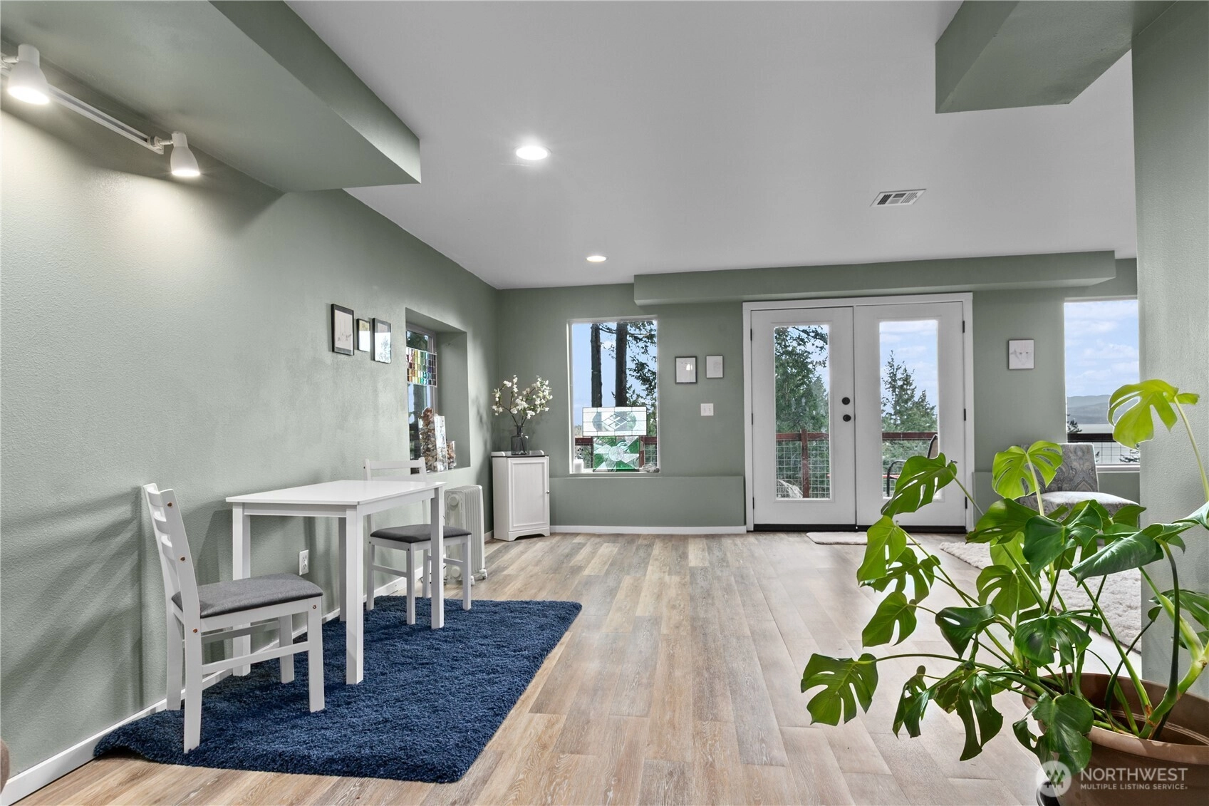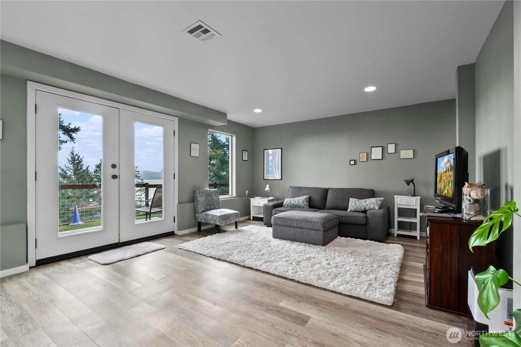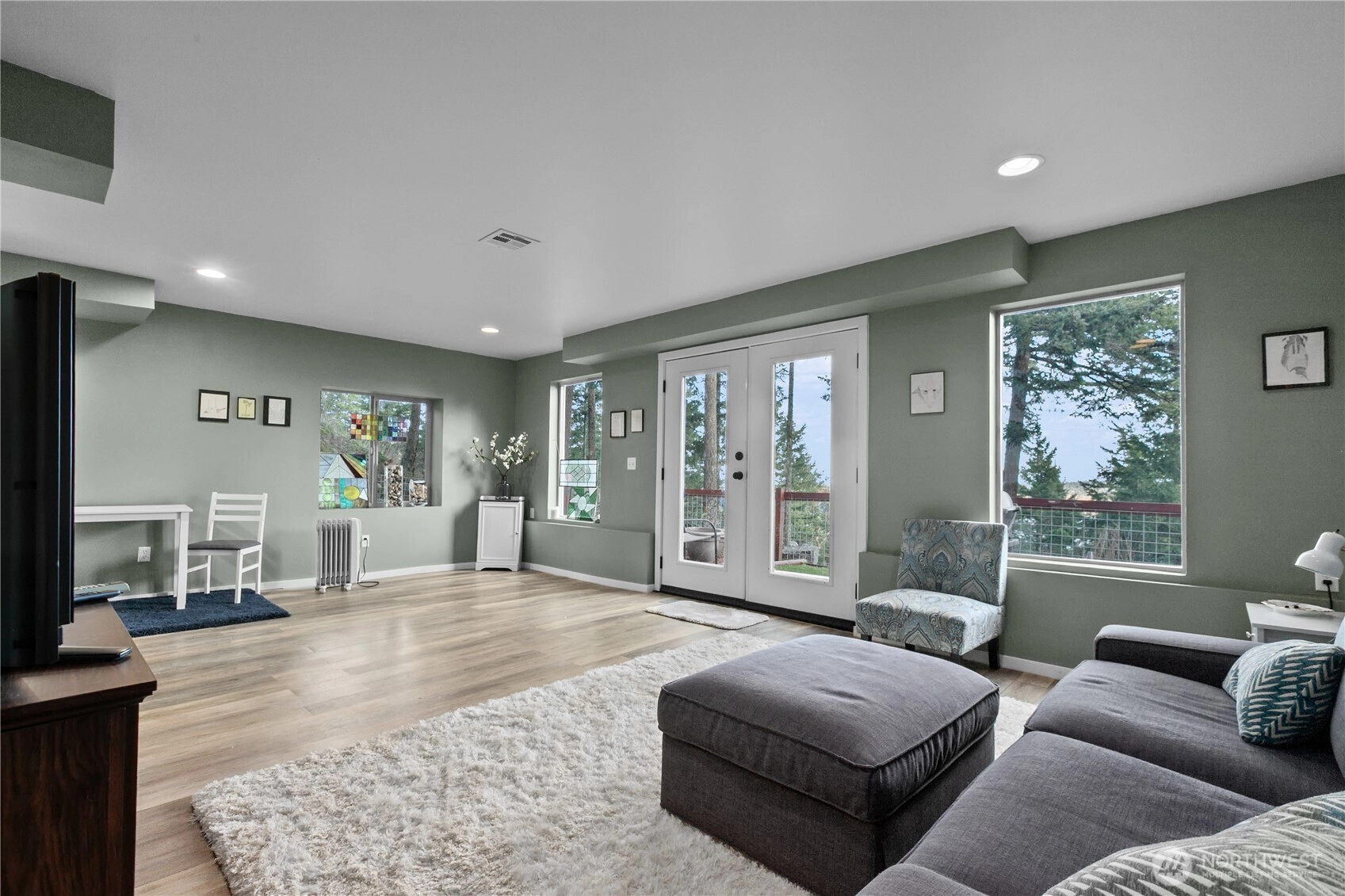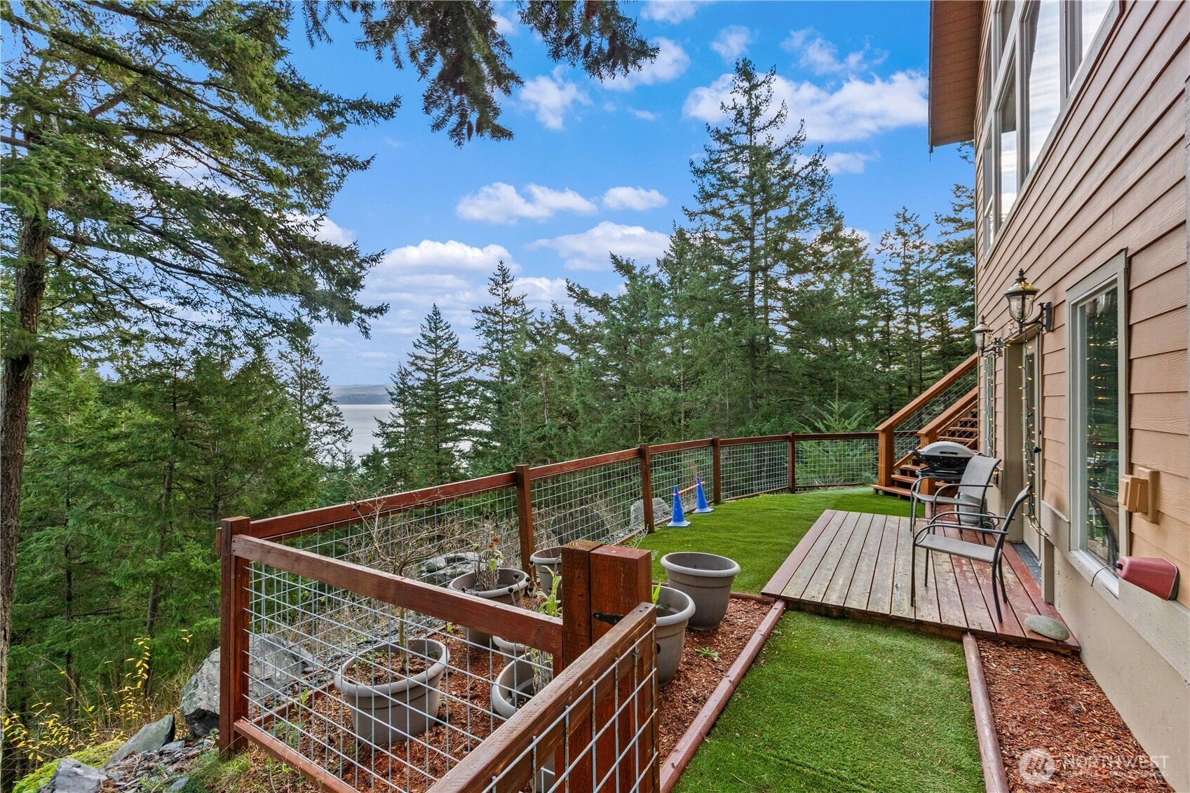 Perched high among mature evergreens, this Lummi Island retreat offers privacy, elevation, and sweeping bay and island views. Vaulted ceilings and dramatic arched windows flood the home with natural light while framing forest and water vistas year-round. Warm wood floors, exposed beams, and an open living layout create a timeless Northwest feel. Enjoy indoor-outdoor living from the covered view deck, ideal for morning coffee or sunset gatherings. Flexible lower level with walk-out access offers space for guests, studio, or recreation. End-of-road setting provides rare seclusion, yet remains minutes from the ferry, trails, boat launch, and community amenities—an exceptional island lifestyle opportunity.