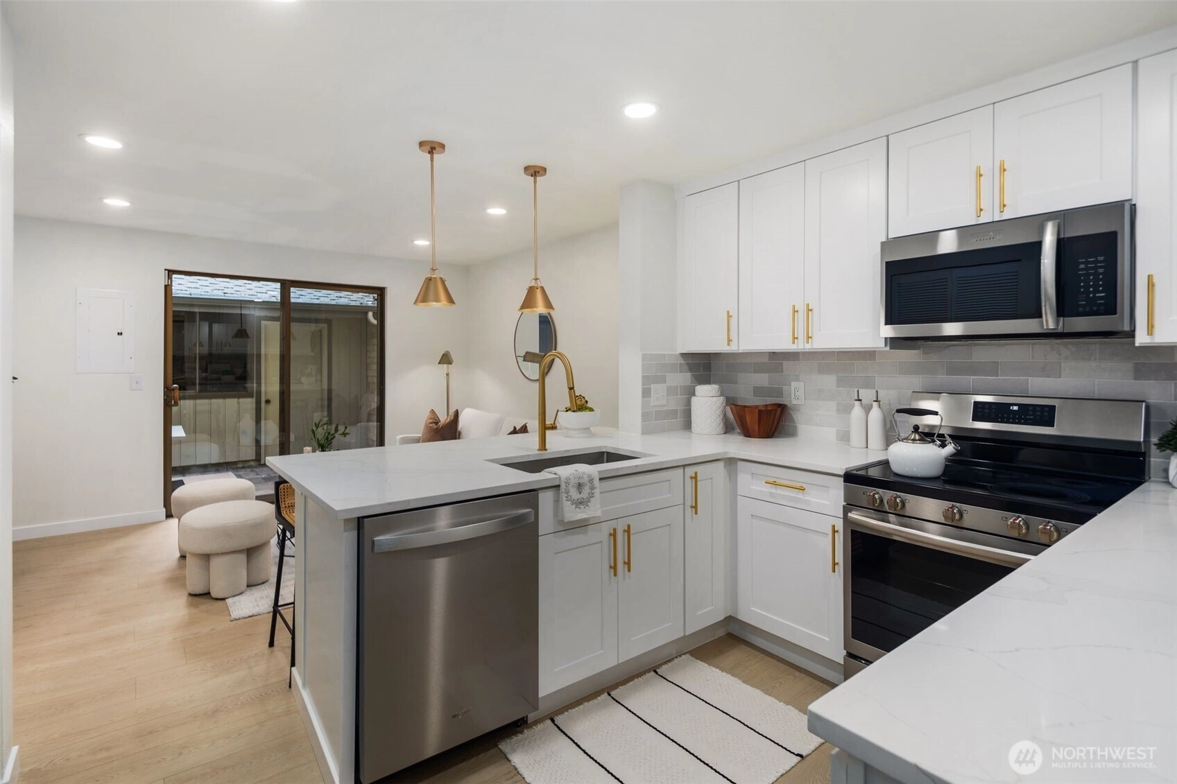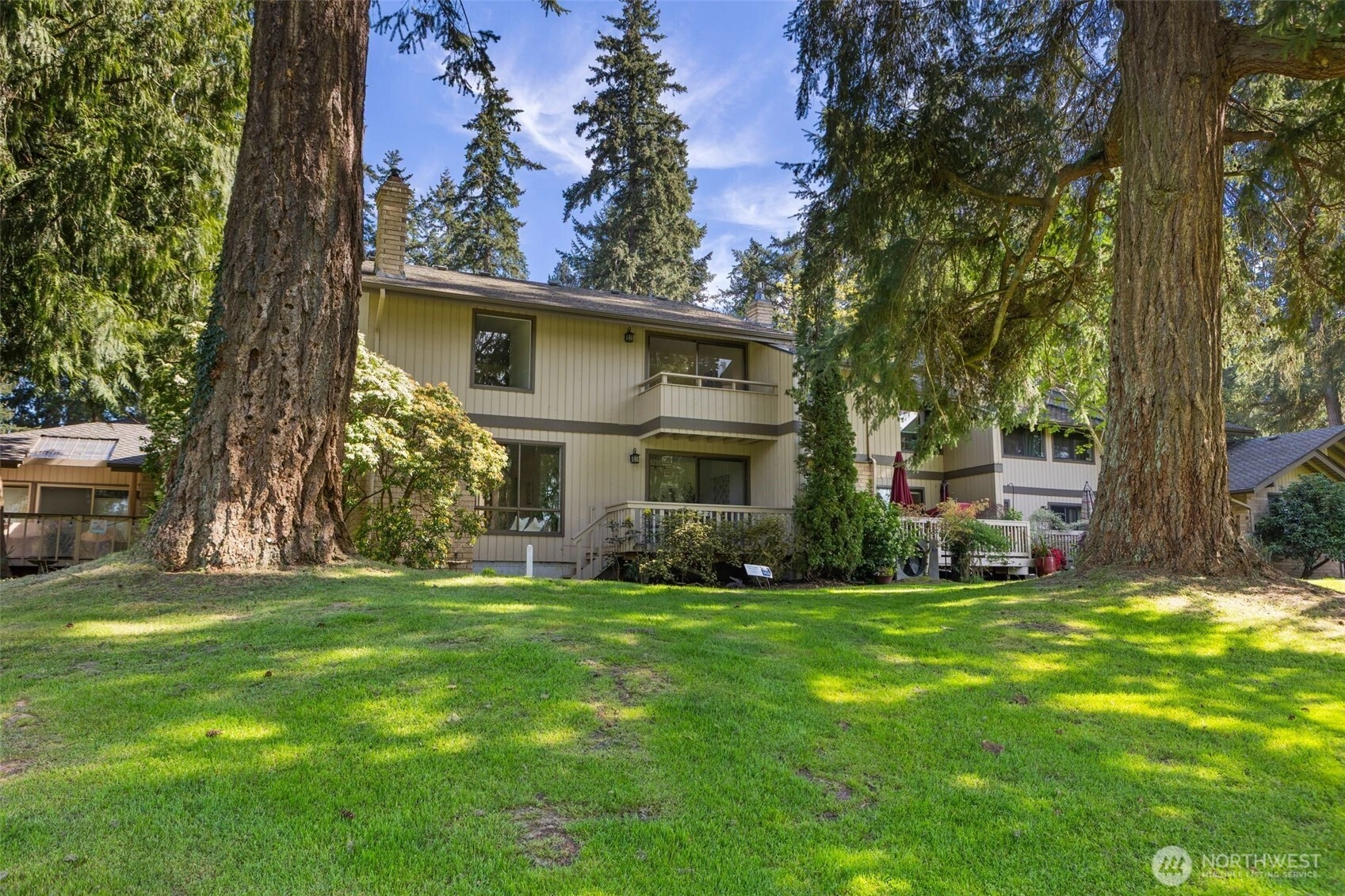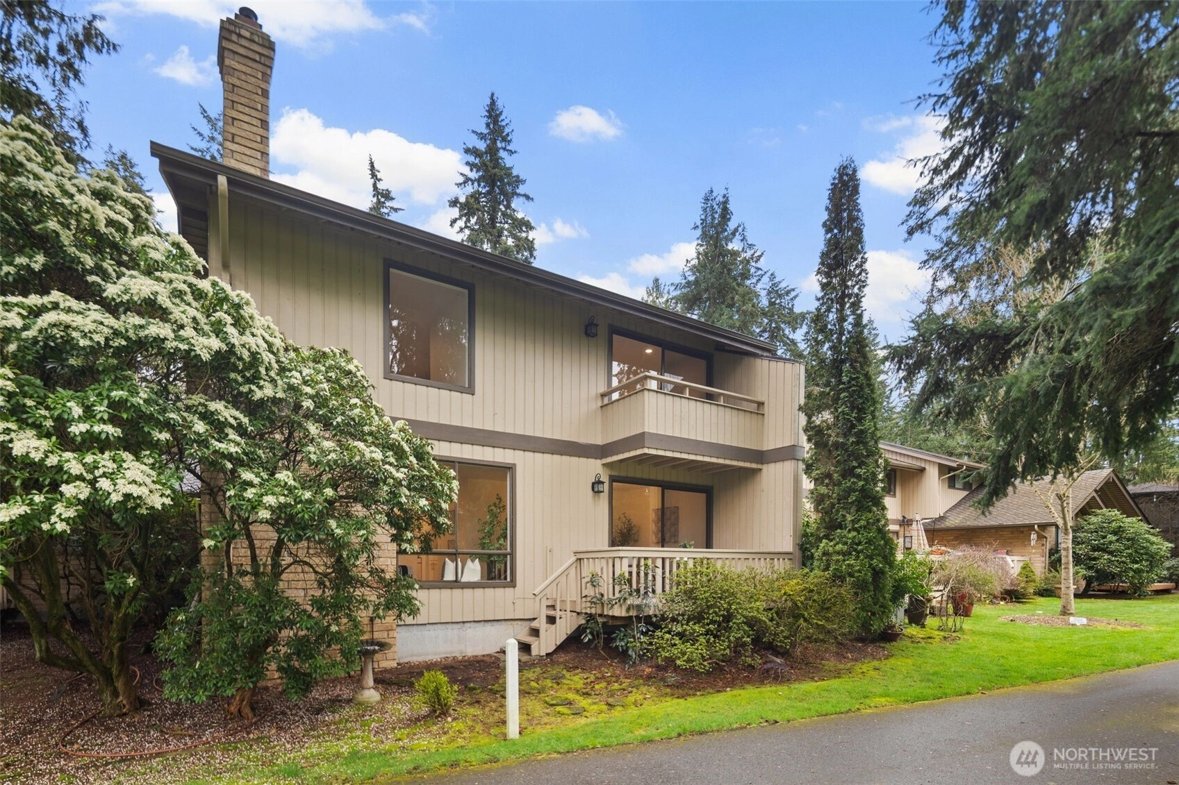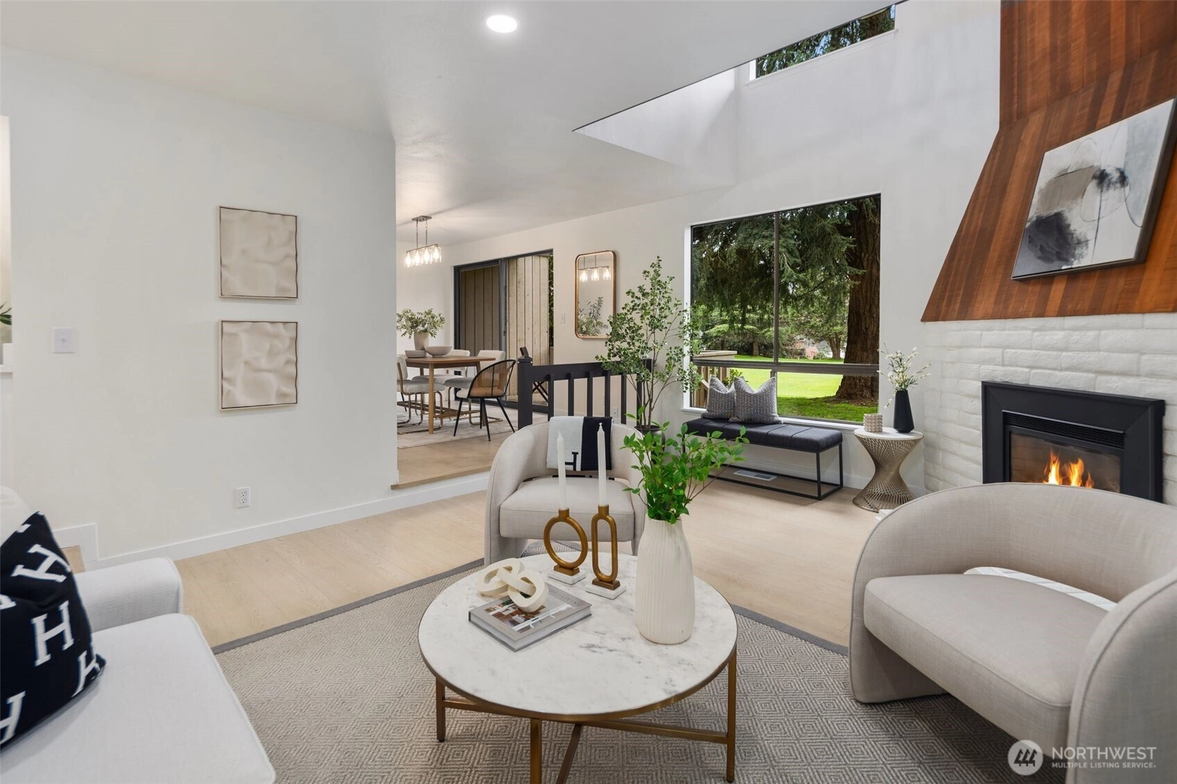 A rare opportunity to live in remodeled luxury on the perfectly manicured 9th fairway of Inglewood Golf Course. This 2025 remodel features new kitchen & baths w/ quartz counters, designer tile & stunning fixtures. Every surface has been touched including new flooring, carpet, paint & LED lighting. In the living room you'll find cathedral ceilings w/ a cozy gas fireplace. The expansive primary suite includes a double sink vanity & luxurious shower. Enjoy indoor/outdoor living w/ golf course views from the back deck or 2nd floor balcony. Or take your coffee in the secluded courtyard patio large enough for an outdoor dining set. Attached extra-large 2 car garage. Easy access to the Kenmore Boat Launch, Burke-Gilman Trail & Northshore Schools.