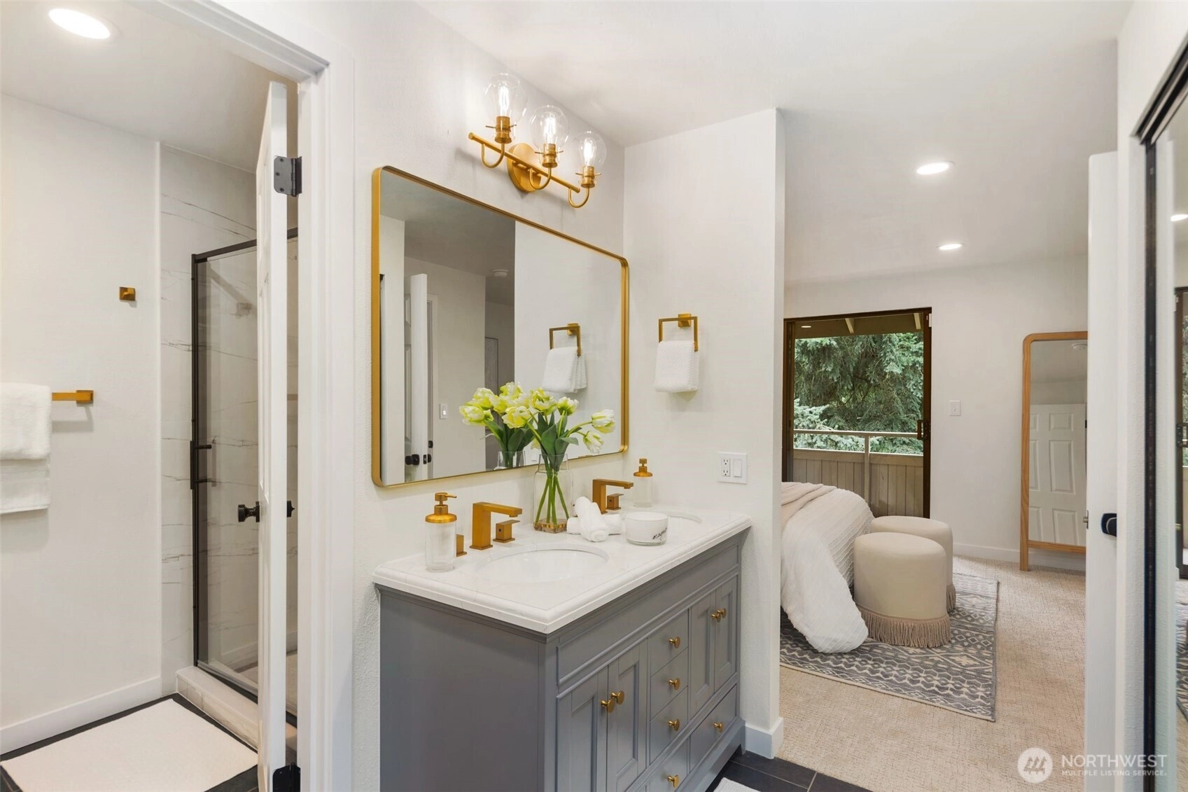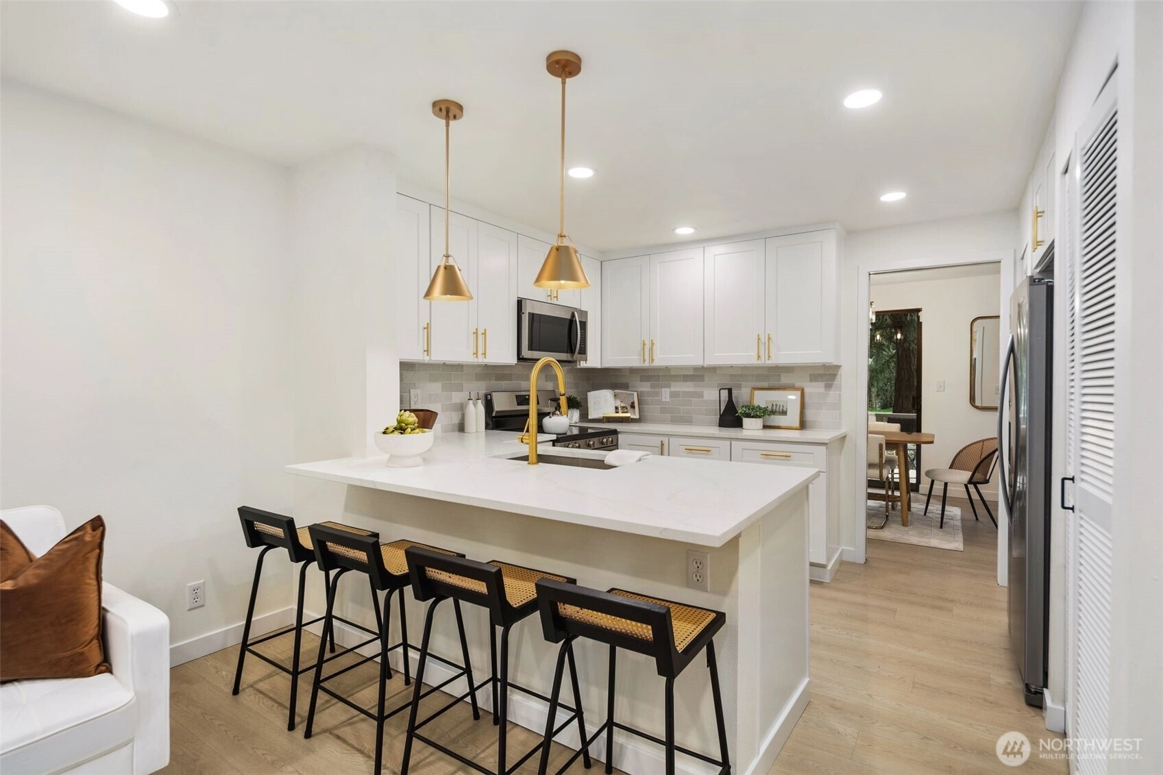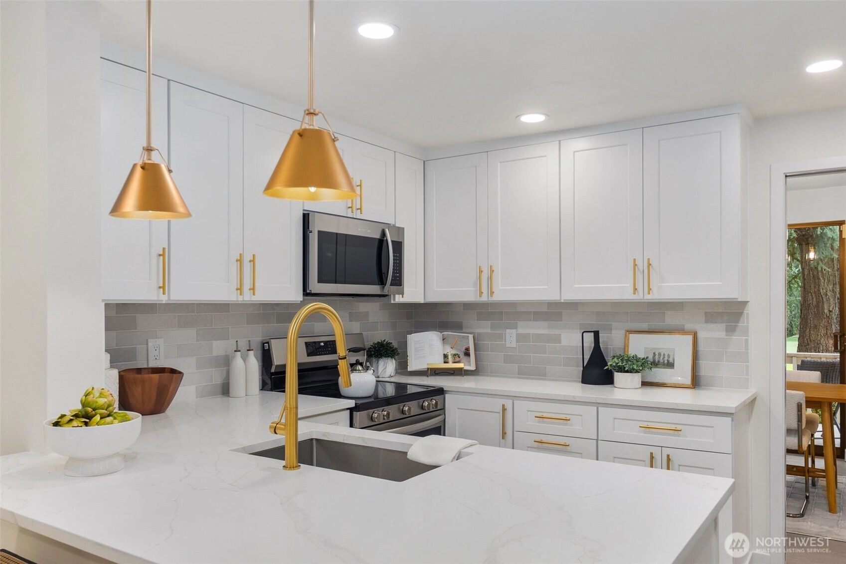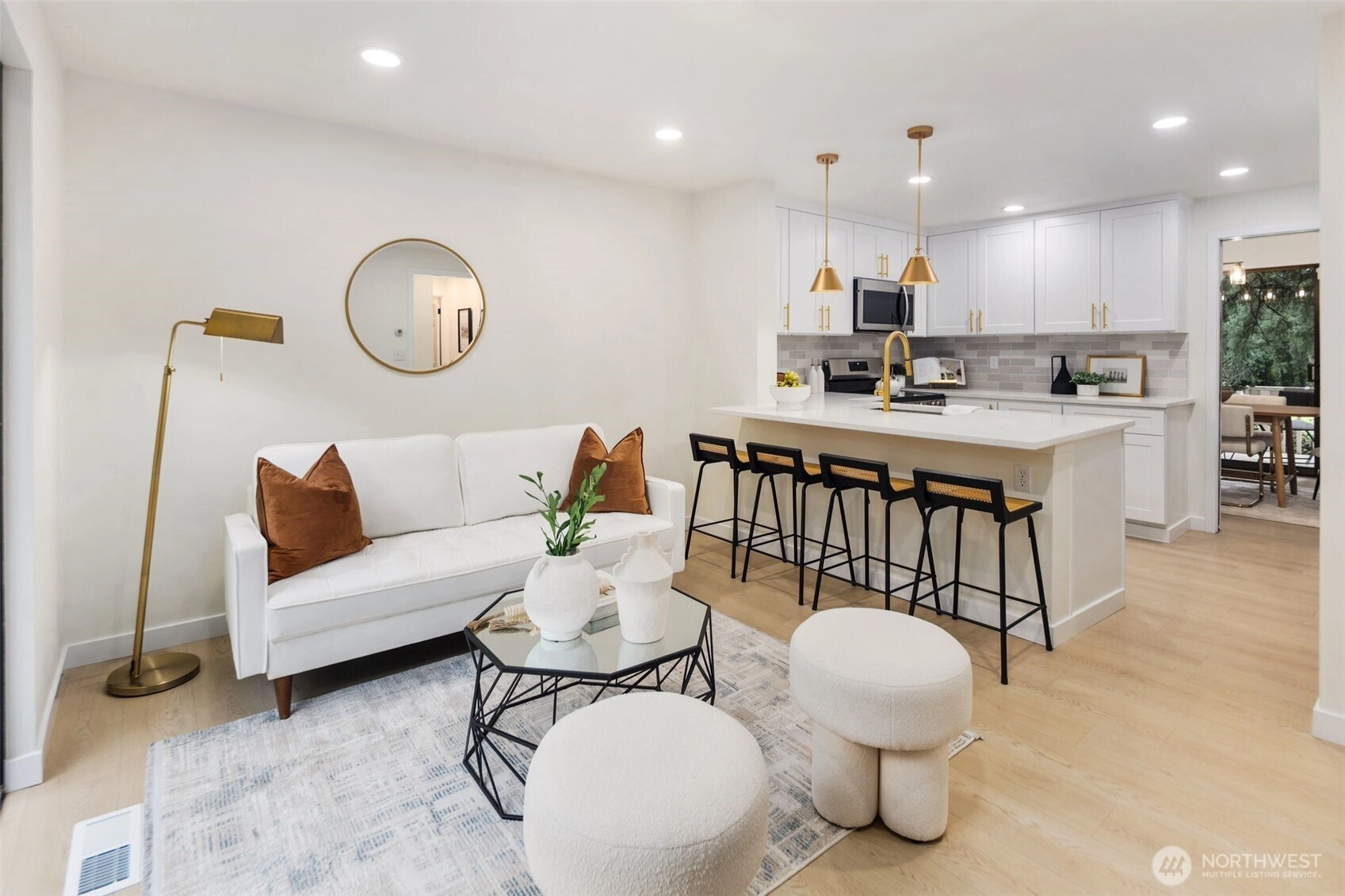 A rare opportunity to live in remodeled luxury on the perfectly manicured 9th fairway of Inglewood Golf Course. This 2025 remodel features new kitchen & baths w/ quartz counters, designer tile & stunning fixtures. Every surface has been touched including new flooring, carpet, paint & LED lighting. In the living room you'll find cathedral ceilings w/ a cozy gas fireplace. The expansive primary suite includes a double sink vanity & luxurious shower. Enjoy indoor/outdoor living w/ golf course views from the back deck or 2nd floor balcony. Or take your coffee in the secluded courtyard patio large enough for an outdoor dining set. Attached extra-large 2 car garage. Easy access to the Kenmore Boat Launch, Burke-Gilman Trail & Northshore Schools.