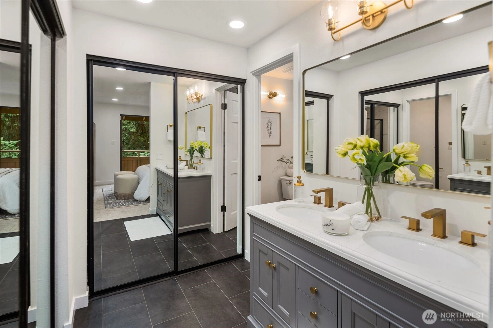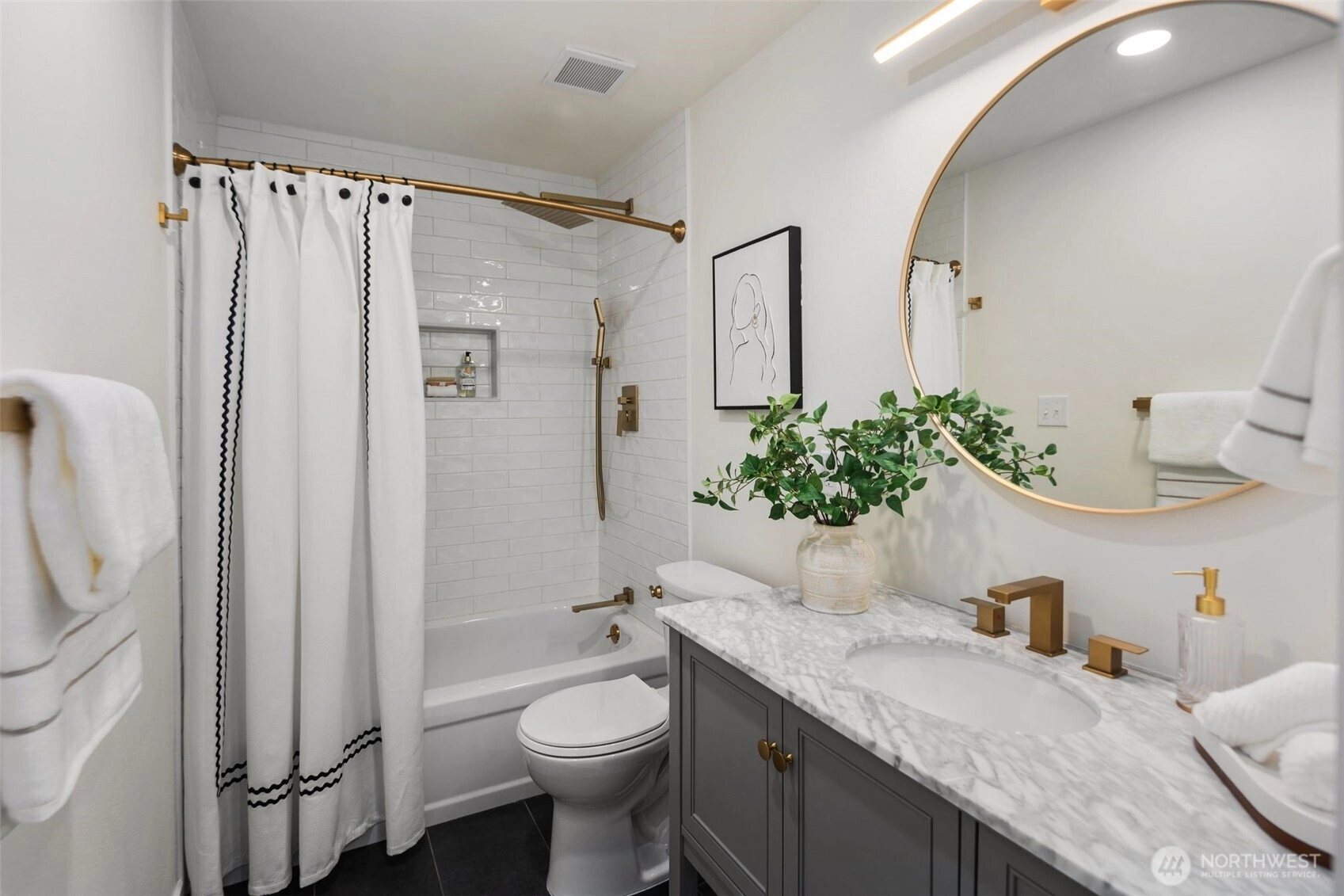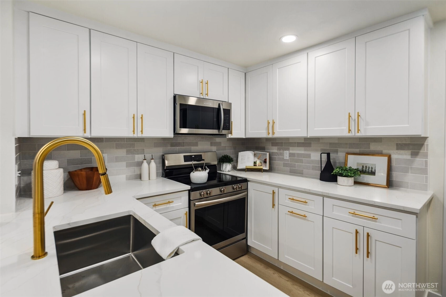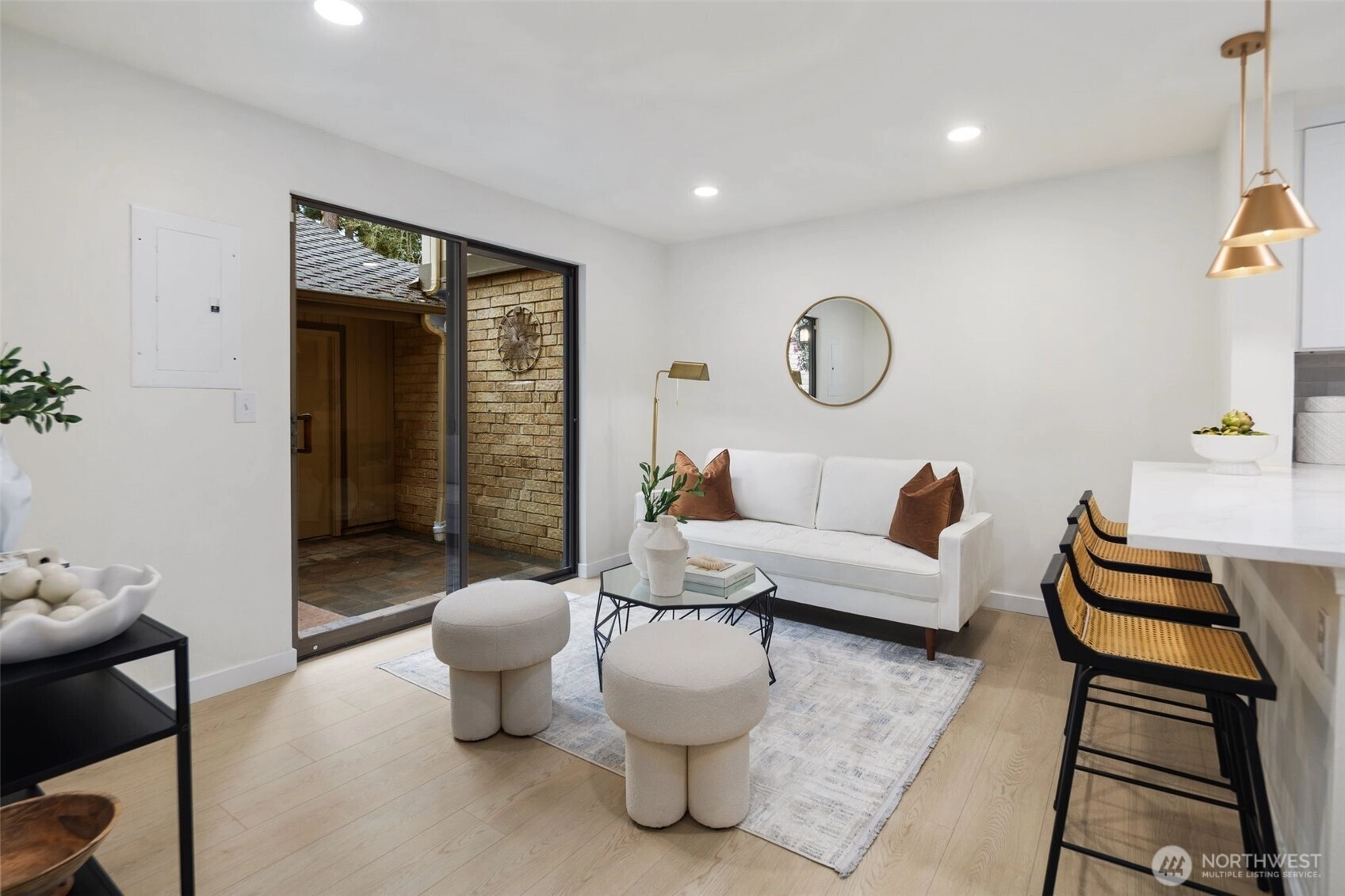 A rare opportunity to live in remodeled luxury on the perfectly manicured 9th fairway of Inglewood Golf Course. This 2025 remodel features new kitchen & baths w/ quartz counters, designer tile & stunning fixtures. Every surface has been touched including new flooring, carpet, paint & LED lighting. In the living room you'll find cathedral ceilings w/ a cozy gas fireplace. The expansive primary suite includes a double sink vanity & luxurious shower. Enjoy indoor/outdoor living w/ golf course views from the back deck or 2nd floor balcony. Or take your coffee in the secluded courtyard patio large enough for an outdoor dining set. Attached extra-large 2 car garage. Easy access to the Kenmore Boat Launch, Burke-Gilman Trail & Northshore Schools.