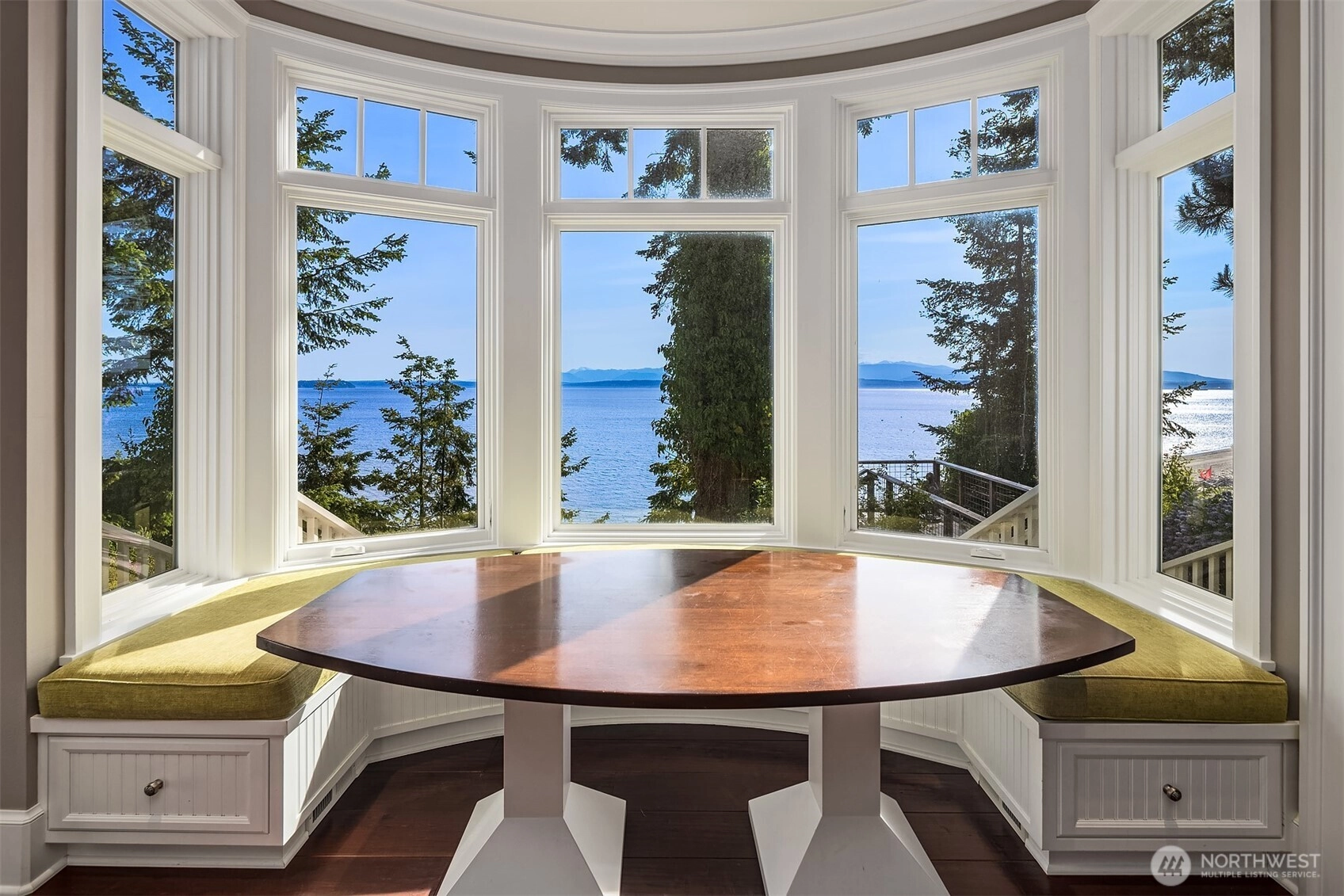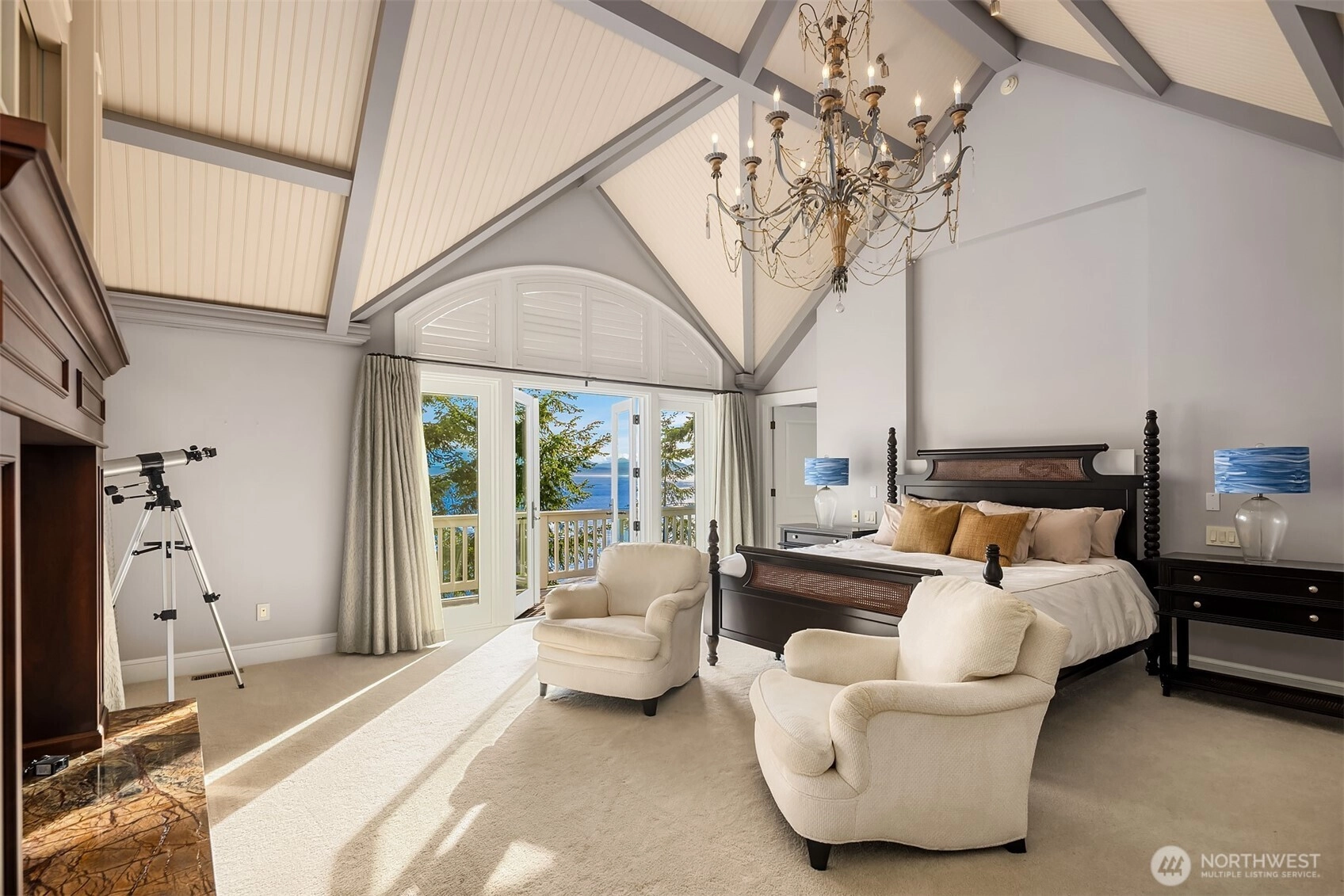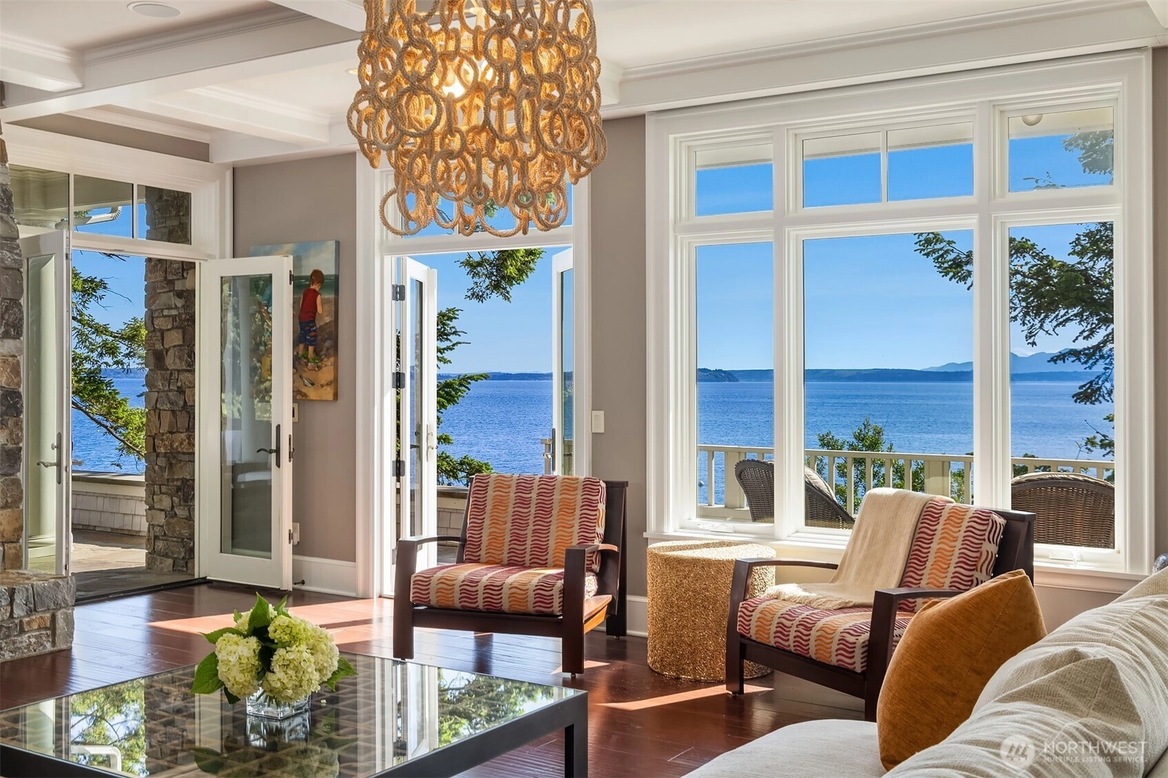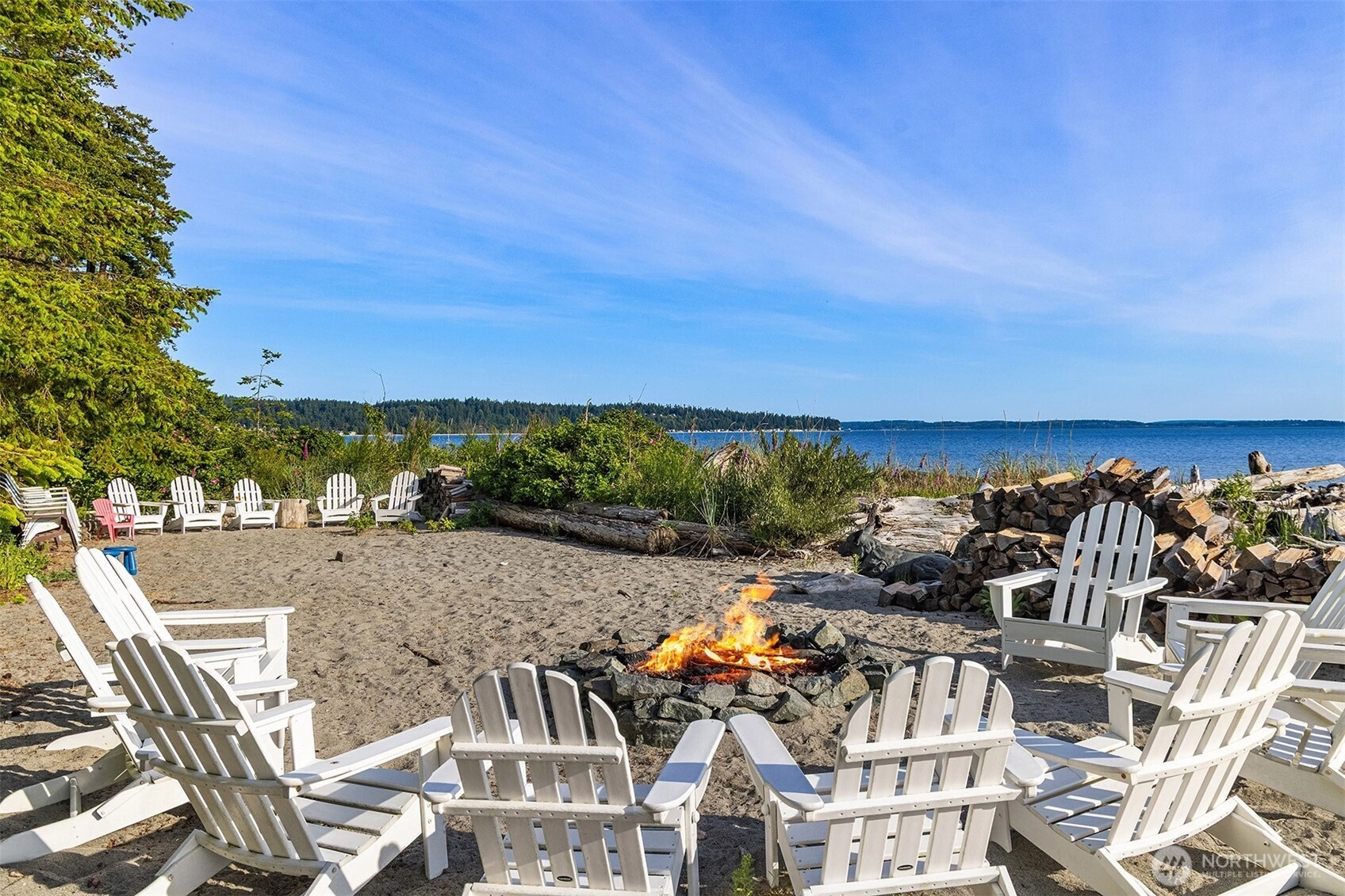 Quintessential Coastal Living on Mutiny Bay. Enjoy sweeping western views & the ultimate in privacy from this beachside retreat. Incredible craftsmanship over 6,100 sf of gracious living. A floor plan designed to entertain & host friends. Expansive great room, kitchen & family room with awe-inspiring views of water & the Olympic mtns. Dining room for 10+, covered outdoor living. Relax fireside as the sun sets. Hot tub, firepit & the coveted wide, sandy beach for endless play & chasing the sun. Four bedroom view suites, including luxurious primary w/vaulted ceilings, fireplace & deck. Upper level with spacious exercise room, spa, deck & loft. Media room & more. Nothing missing at this incredible estate where every day is a vacation.