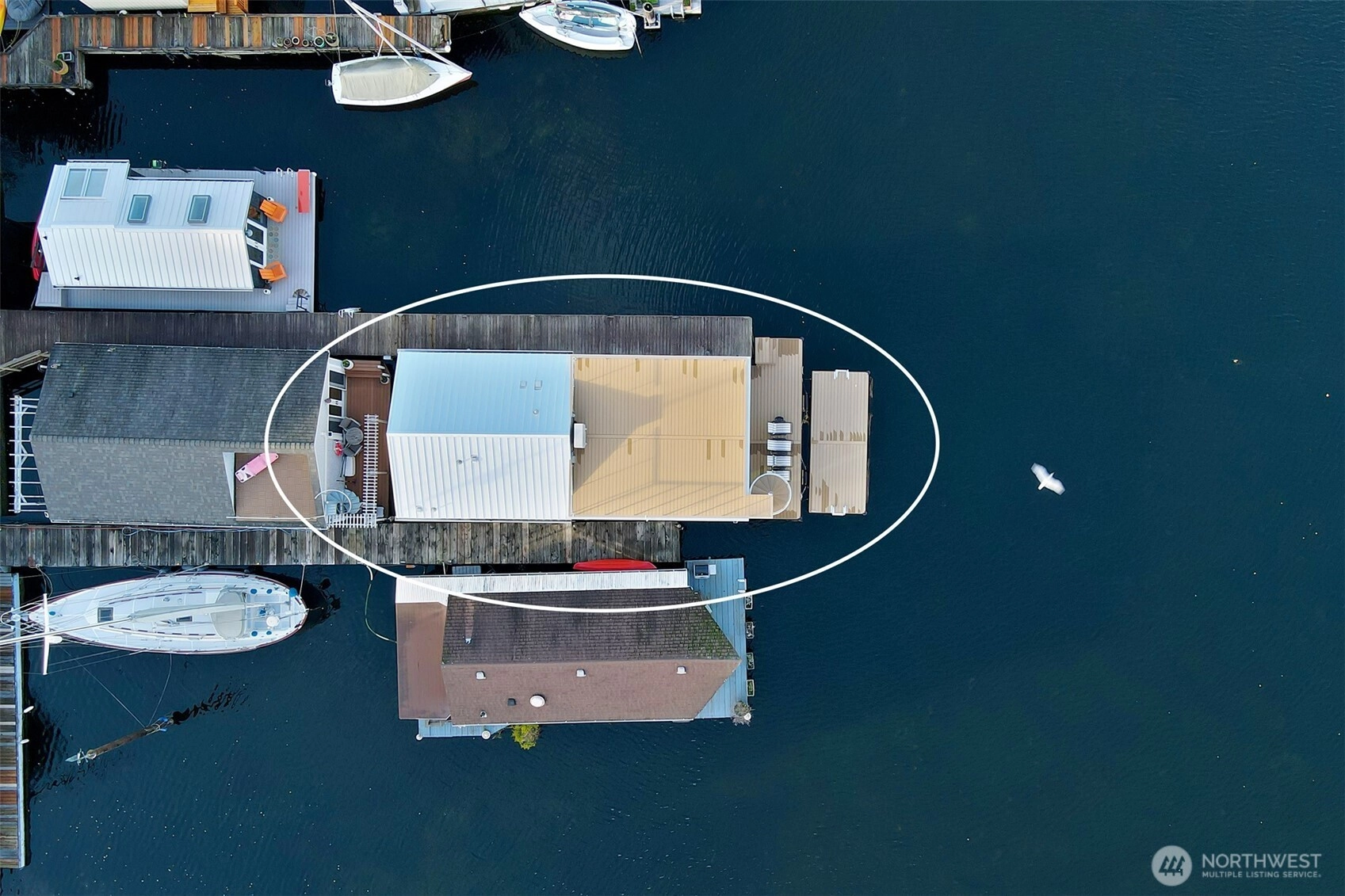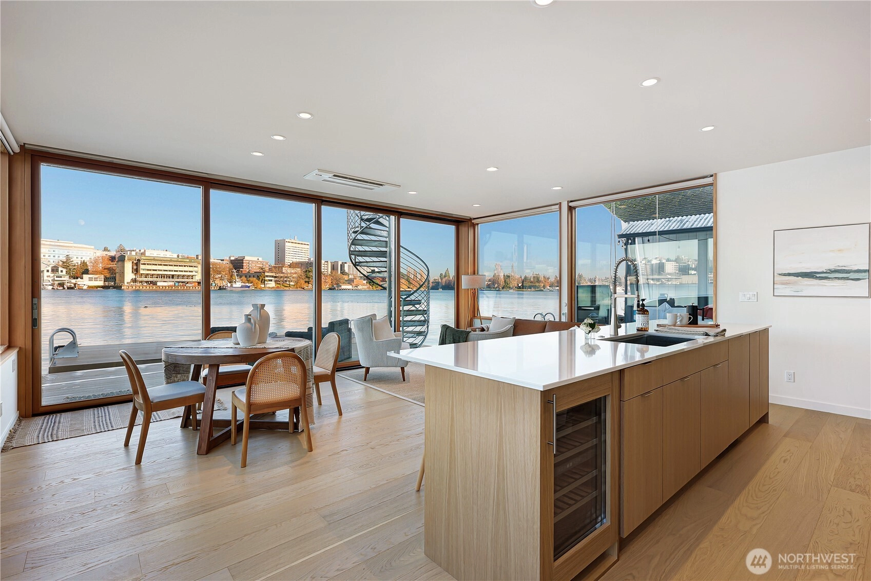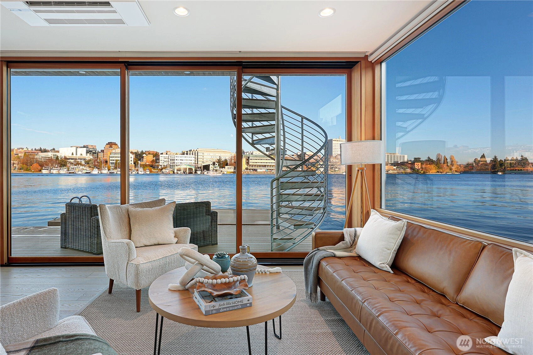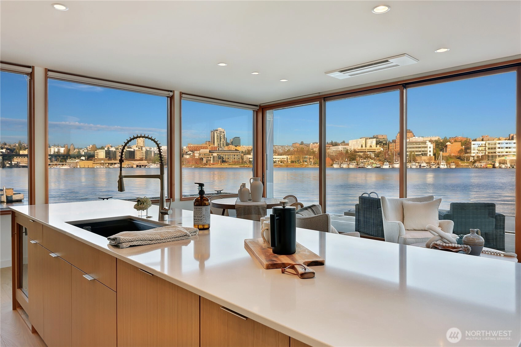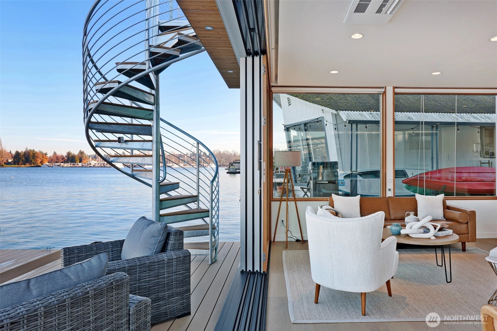 Newly constructed and expertly built by Lithic Construction, this floating home embodies quiet sophistication from its premier end-of-dock setting on Portage Bay. A warm modern aesthetic highlights sweeping 180-degree views and seamless indoor–outdoor living through a 20-foot, floor-to-ceiling sliding door system. Auto shades for complete privacy. Natural cedar siding is paired with custom steel railings and a striking staircase. The primary suite features 14’ vaulted ceilings and an ensuite bath. A rooftop deck, front patio, and auxiliary raft provide approximately 950 sqft of outdoor living. Includes rare 28’ separately deeded boat moorage + two parking spaces. Experience the best of the Pacific Northwest living in a waterfront sanctuary.