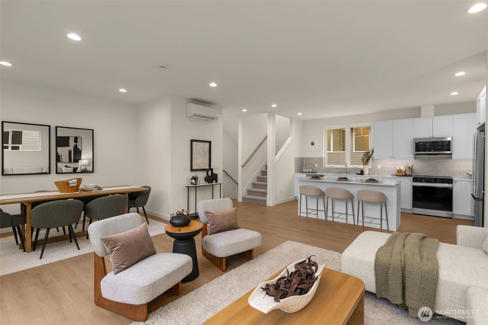 Modern architecture, thoughtful design, and elevated outdoor living come together in this light-filled West Seattle townhome by Shelter Homes. Set in a quiet residential pocket, this multi-level residence offers approx. 2,103 sq ft with 3 bedrooms, 3.25 baths, a versatile bonus space, and a private rooftop deck. The main living level is open, bright, and designed for connection. Wide-plank floors, oversized windows, and clean-lined finishes create a calm, contemporary feel throughout. The kitchen anchors the space with quartz countertops, full-height cabinetry, stainless steel appliances, and a generous island with seating. Living and dining areas flow seamlessly, framed by leafy views that bring the outdoors in. Upstairs, the primary suite is a true retreat with expansive windows, treetop outlooks, and a spa-inspired bath featuring dual vanities and a glass-enclosed walk-in shower with modern tilework. Additional bedrooms offer flexibility for guests, work-from-home needs, or creative space, each with easy access to well-appointed baths. The entry level includes a bonus/media room ideal for a home office, gym, or guest suite, along with convenient laundry and storage. At the top, a private rooftop deck extends the living experience outdoors—an ideal setting for morning coffee, sunset gatherings, or open-air dining under the sky. Located minutes from West Seattle amenities, parks, and dining, this home offers modern living with space to breathe, relax, and recharge.