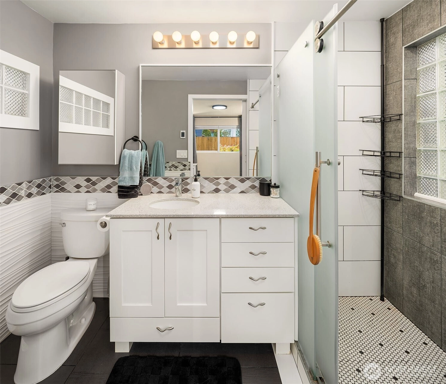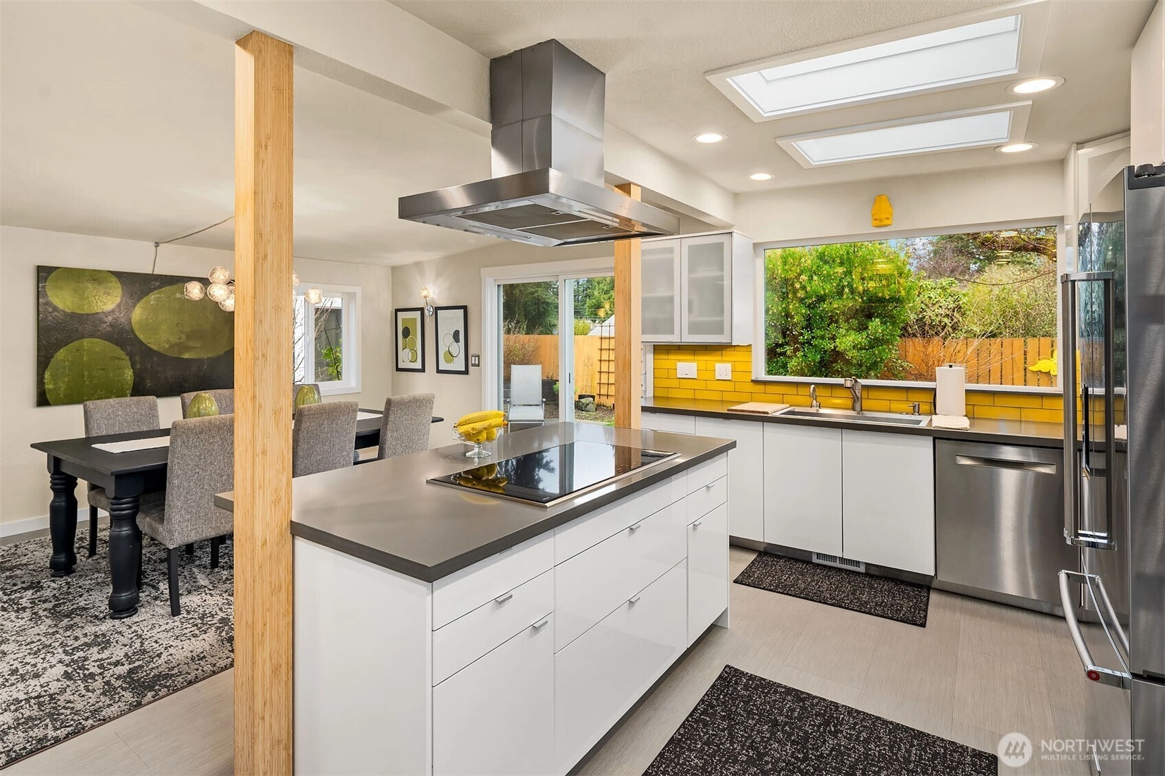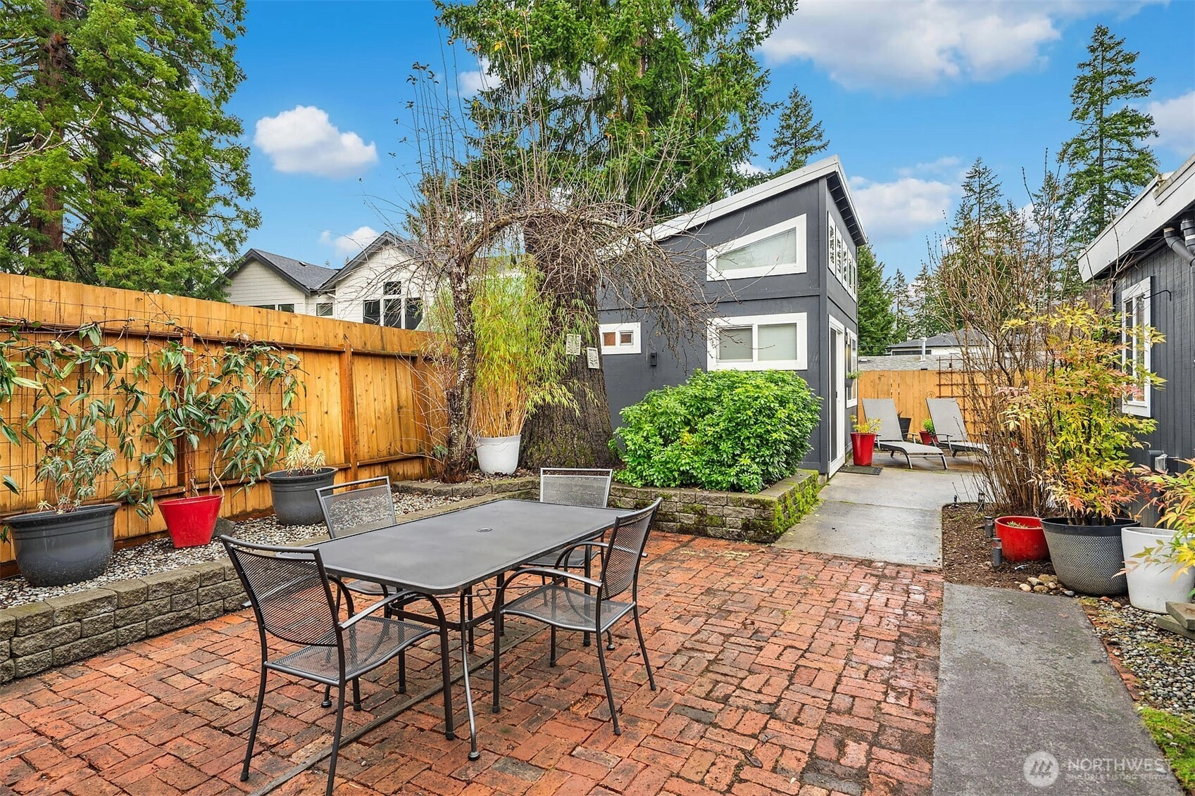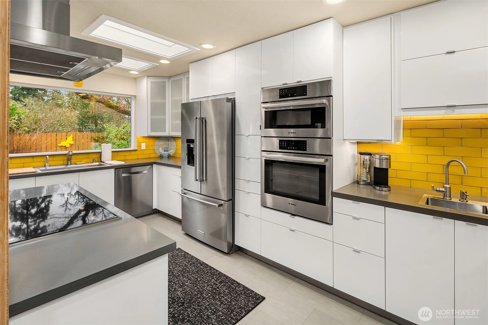 Comprehensively remodeled and centrally located, this East Bellevue rambler blends contemporary style with thoughtful, functional design. Clean lines and modern finishes create a home that both performs beautifully and delights the senses. The gourmet chef’s kitchen showcases premium Wolf and Bosch appliances, a generous quartz center island, and a dramatic yellow glass tile backsplash. Recent upgrades include three remodeled bathrooms, new double-pane windows, a gas furnace, air conditioning, updated electrical and plumbing, and fresh landscaping featuring garden rock walls, brick patio, and meandering pathways. The +/- 200 sq ft detached flex studio provides an ideal space for a home office, gym/workout space, or an exceptional playhouse.