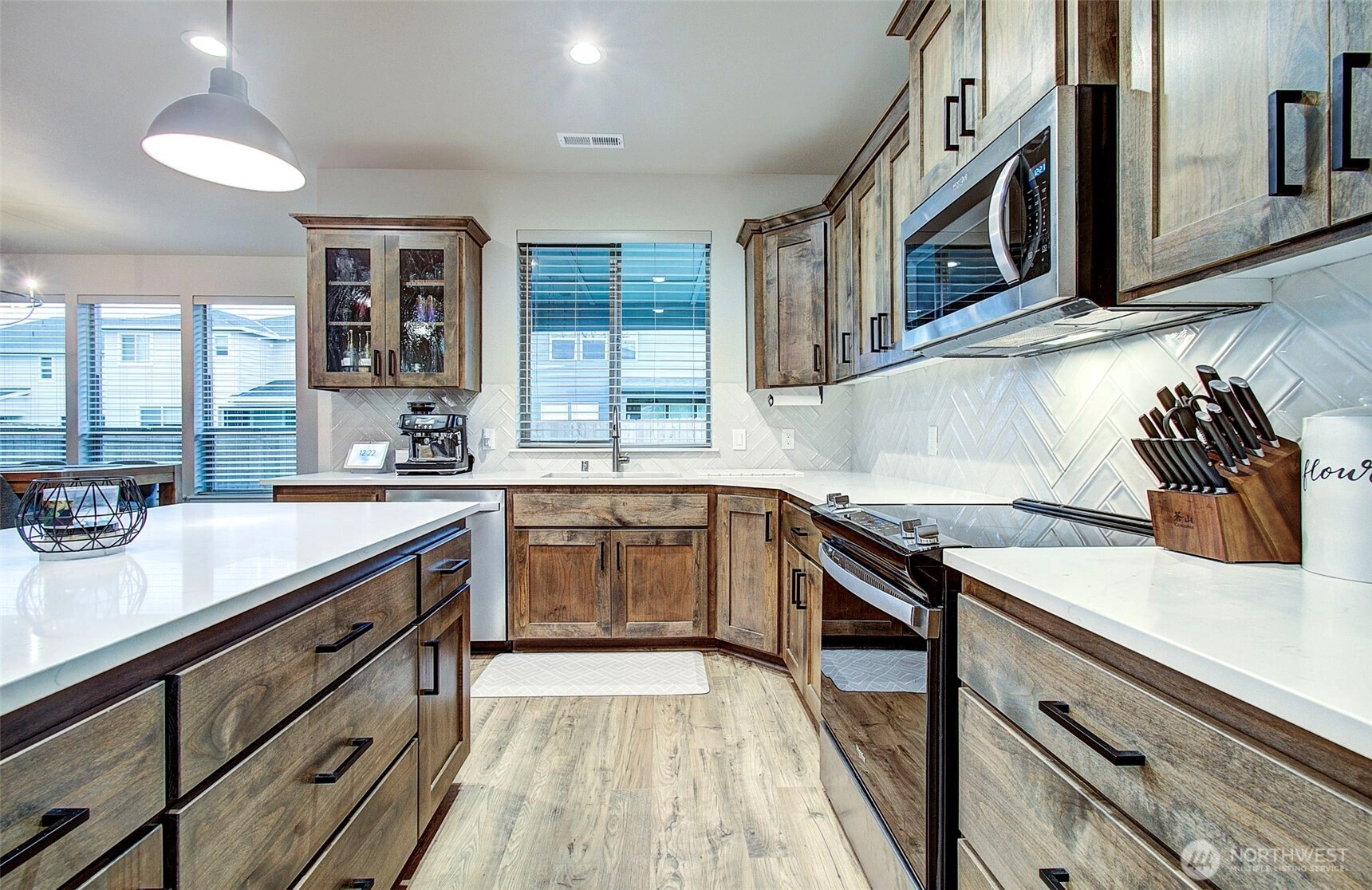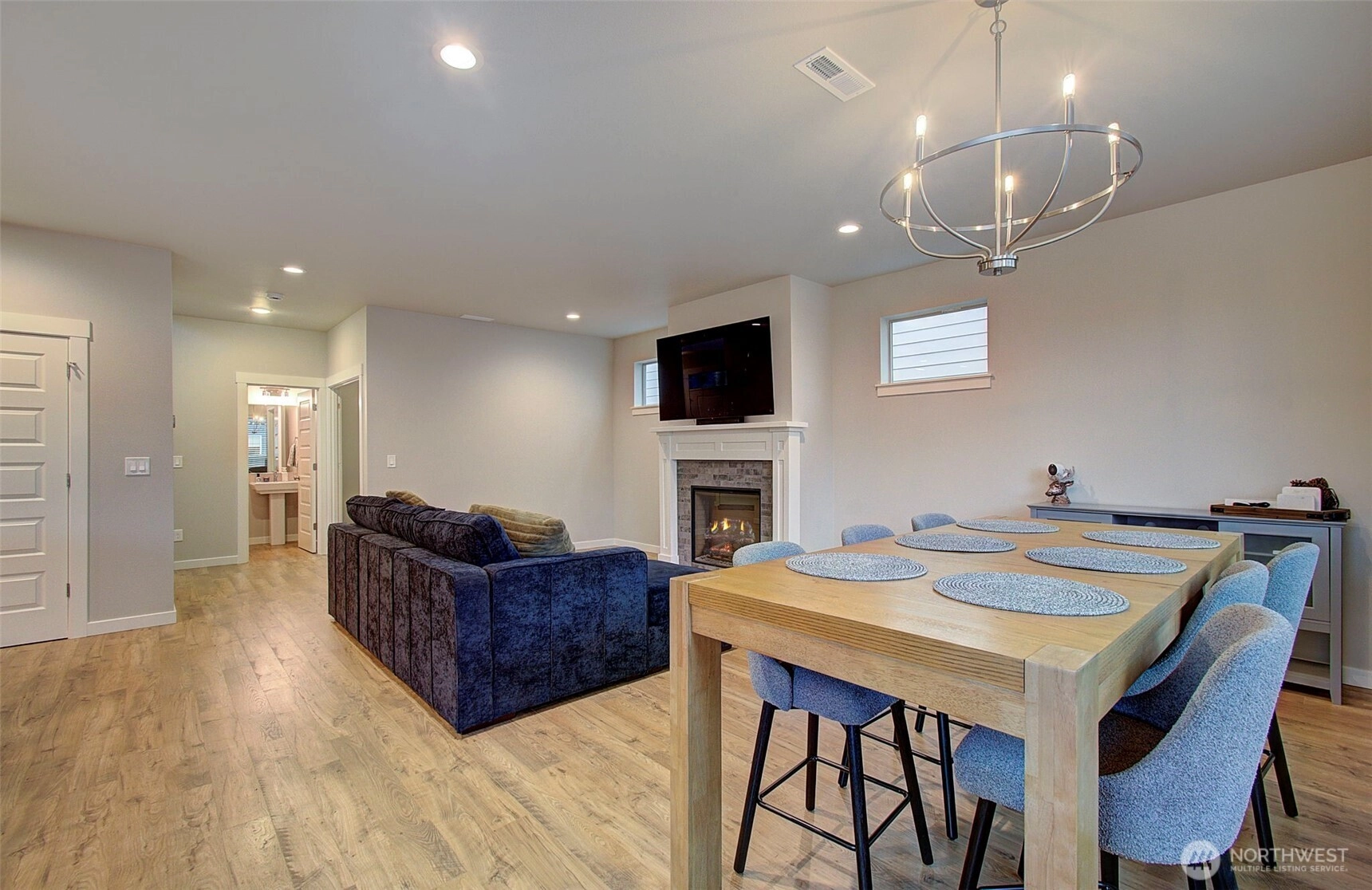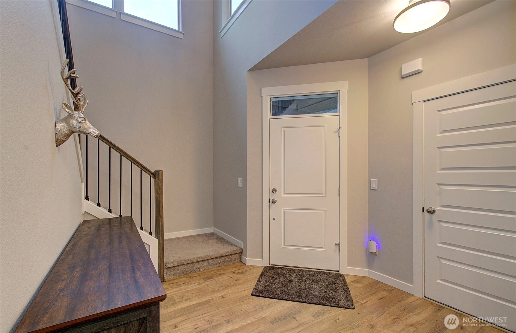 2024 build on large double corner lot near greenspace and open field. 2,295 sf with 4 bedrooms & main-floor den with French doors and 2 full baths. Quartz island kitchen with pantry, soft-close cabinets, stainless appliances and refrigerator included. Great room opens to a 13x11 covered patio and oversized fenced yard with sprinklers and above-ground pool negotiable. Primary suite features custom walk-in closet, soaking tub and walk-in shower. Washer and dryer included. Heat pump with AC, smart thermostat, luxury vinyl plank floors and finished 2-car garage. Enjoy modern finishes and plenty of smart storage. Nearly .30ac, min to shopping and schools in quiet Brush Prairie. Structural builder warranty believed transferable (buyer to verify).
