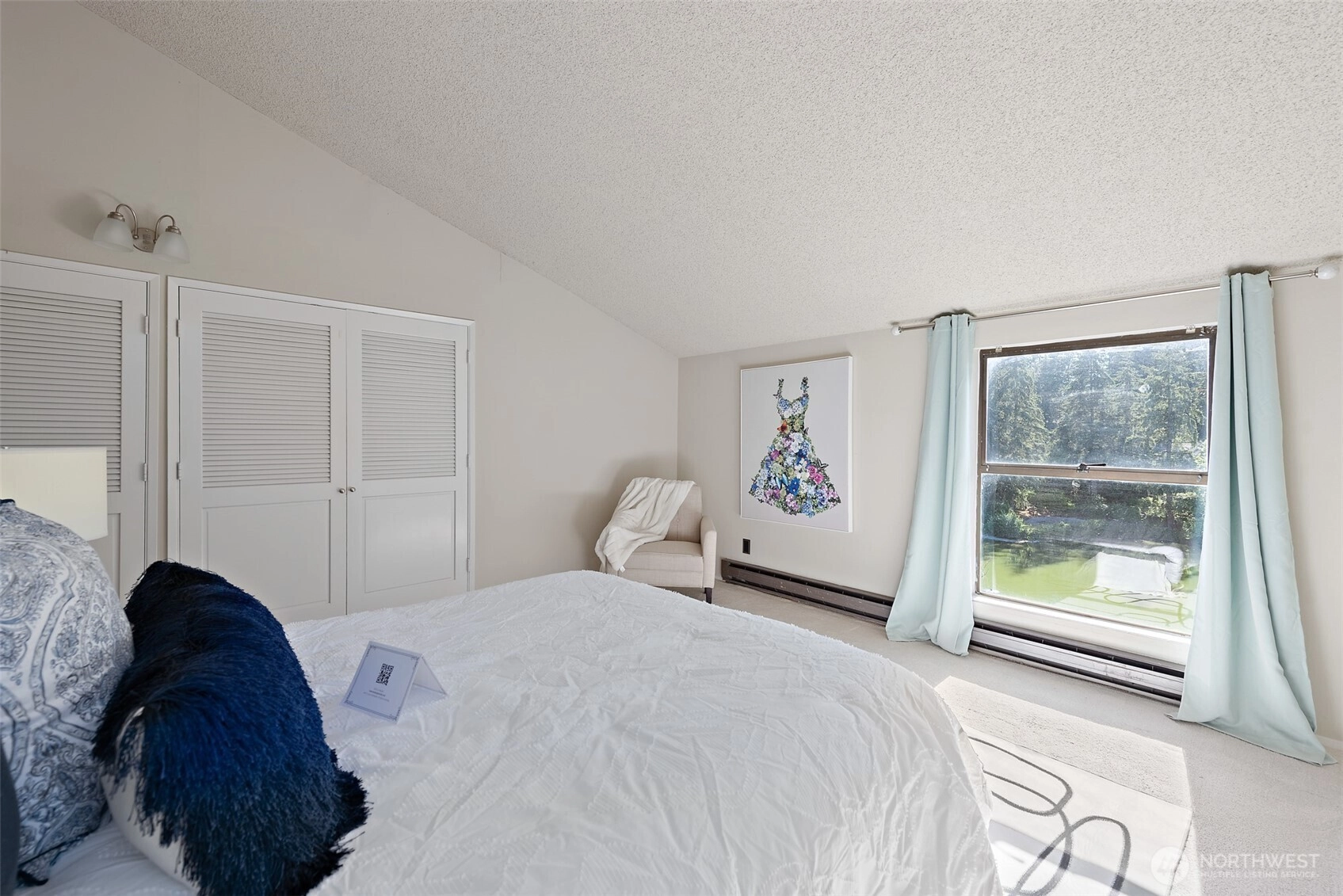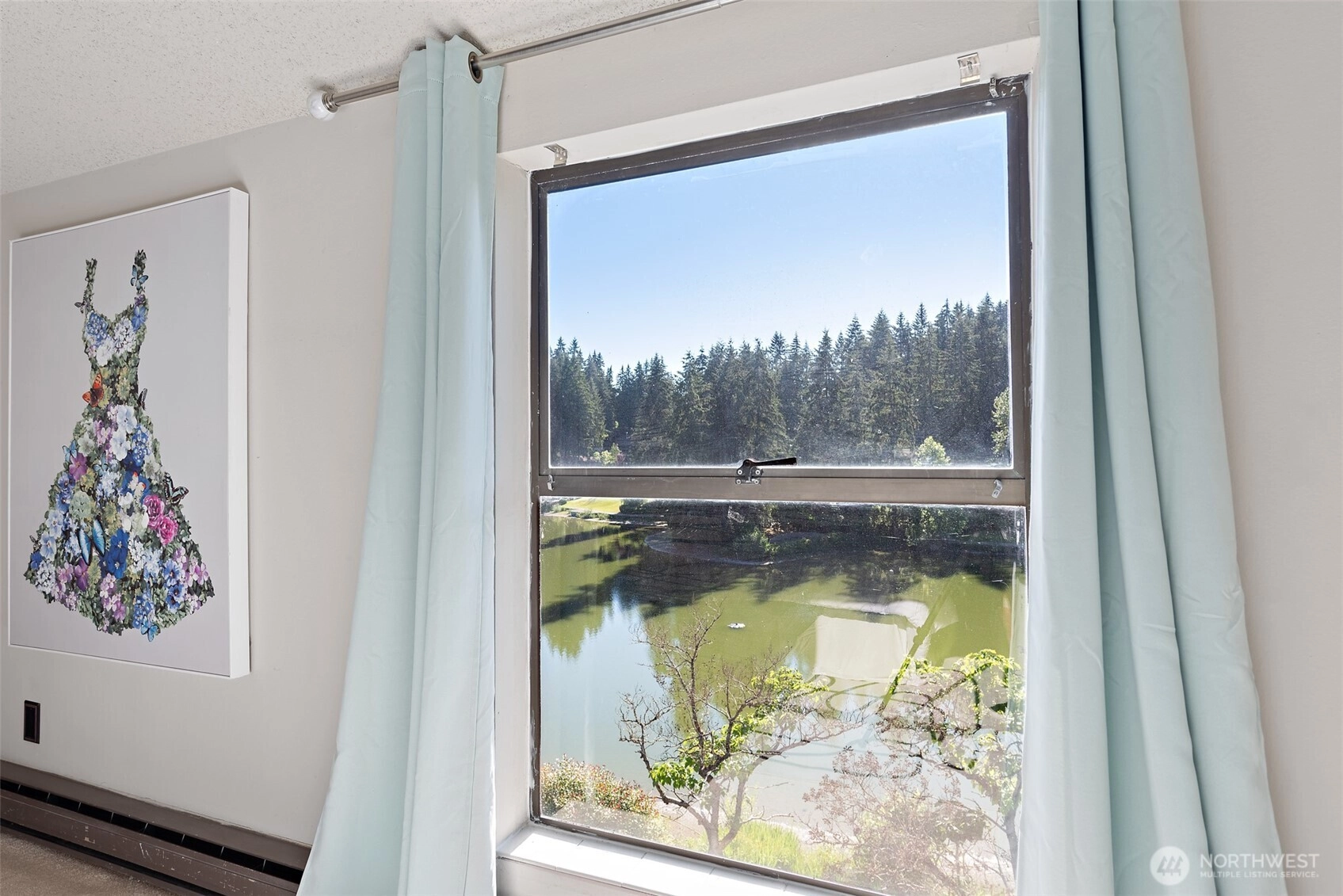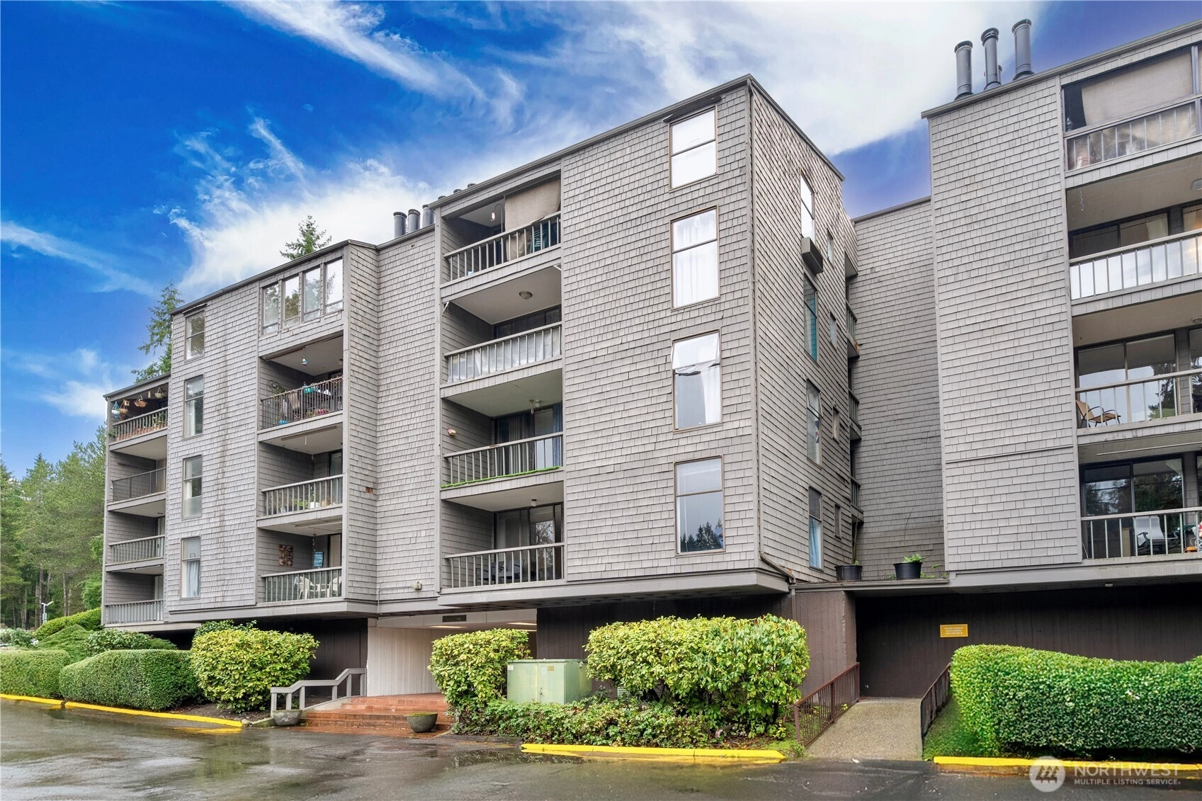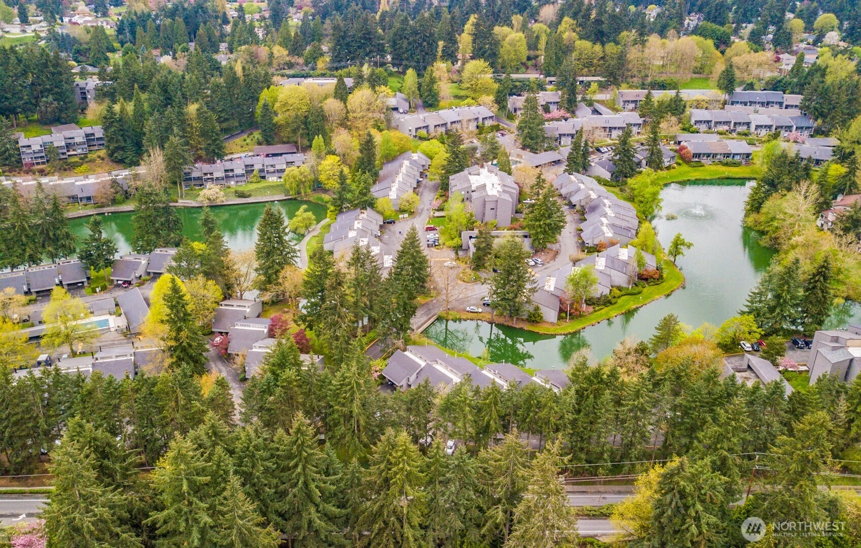Welcome to this elegant top-floor condo with serene lake views. Vaulted ceilings, expansive windows, and a cozy wood-burning fireplace. The kitchen features granite countertops and European-style white cabinetry. Fresh interior paint, hard-surface flooring, and new luxury carpet in the bedrooms enhance the move-in-ready feel. The spacious primary suite offers multiple closets and a private en-suite bath. Large second bedroom with private balcony. Elevator access, covered parking, storage unit, and ample parking for guests. Enjoy resort-style amenities including lakes, trails, pools, clubhouse, gym, sauna, and athletic courts. Prime Eastside location minutes to Microsoft, Google, shopping, dining, and major commuter routes. No RENTAL CAP.